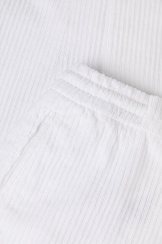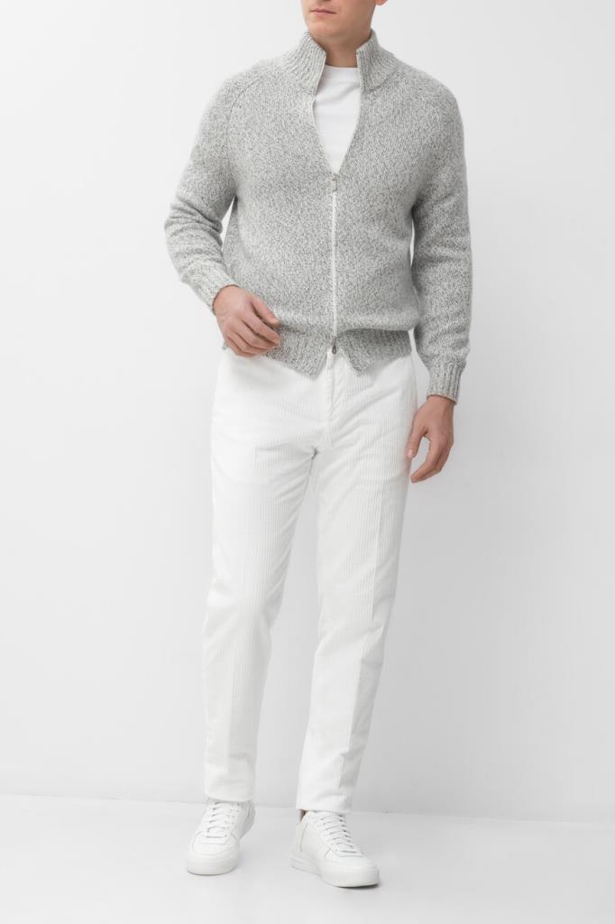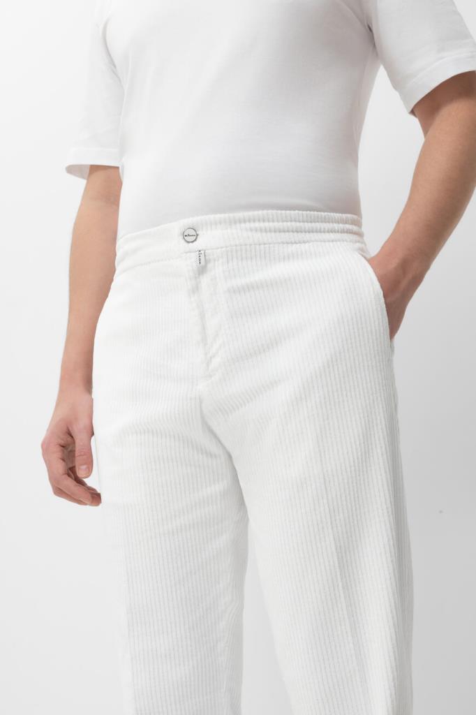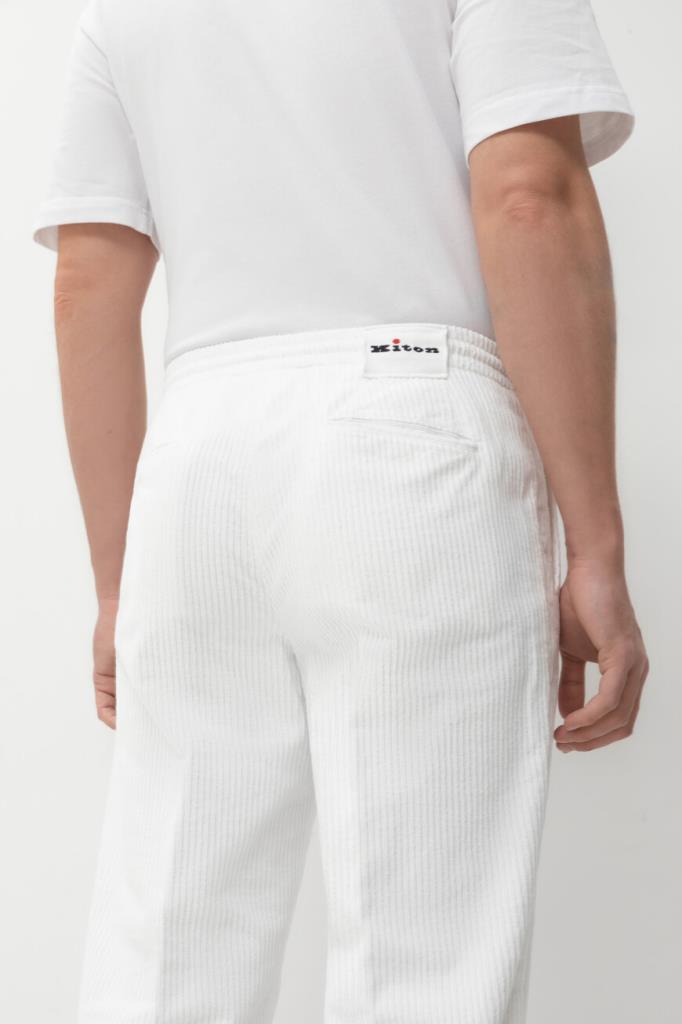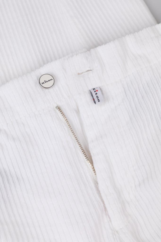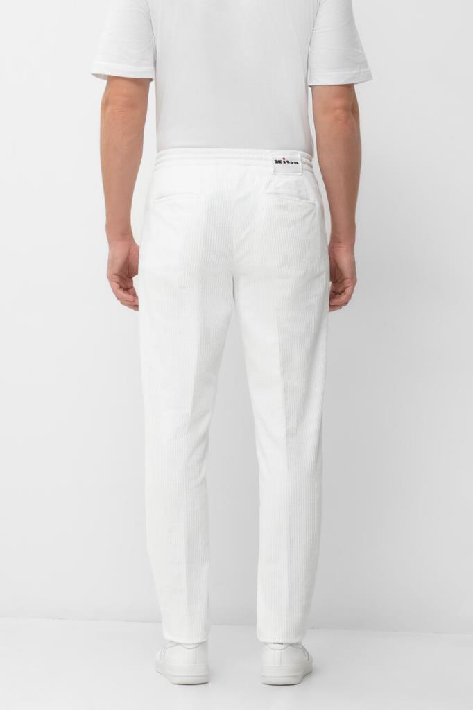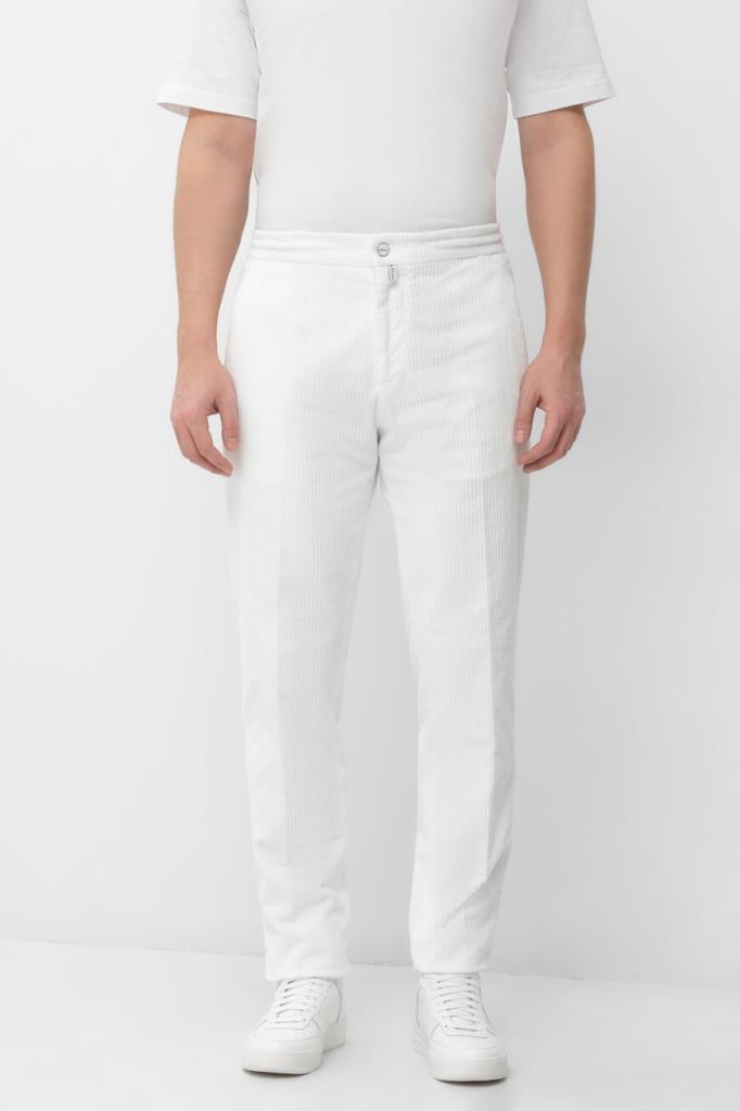 Вельветовые брюки прямого силуэта от бренда Kiton. Для пошива изделия выбран мягкий хлопок стрейч белого цвета, приятный на ощупь. Модель носится комфортно и не натирает благодаря плотному поясу с эластичной вставкой. Принадлежность брюк Дому деликатно подчёркнута деталью с логотипом спереди и прямоугольной накладкой с вышитой контрастной надписью-лого сзади.