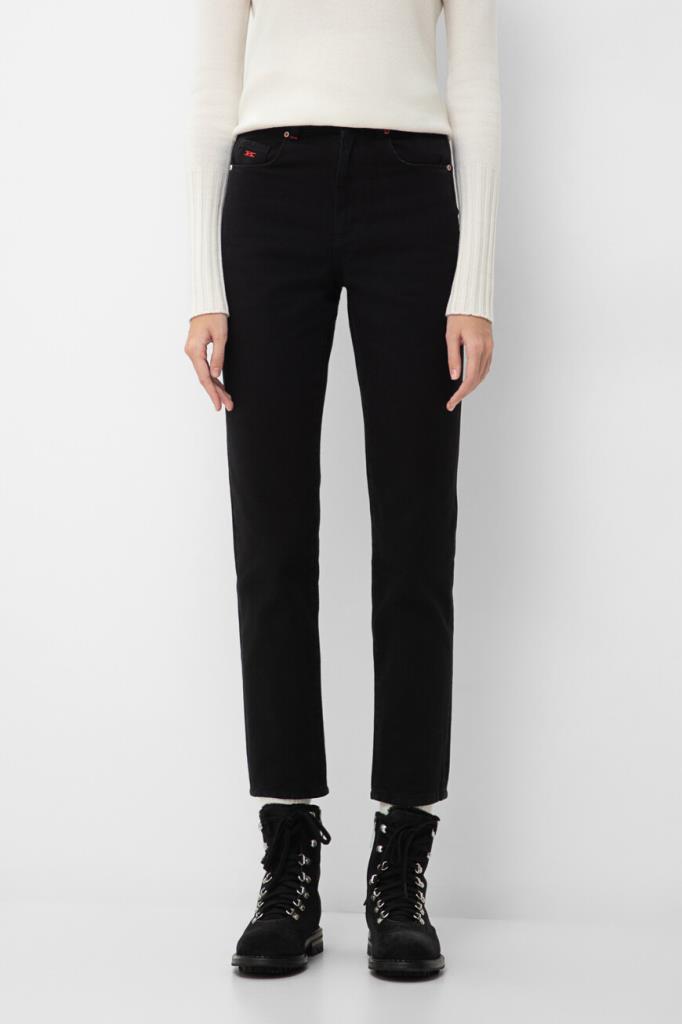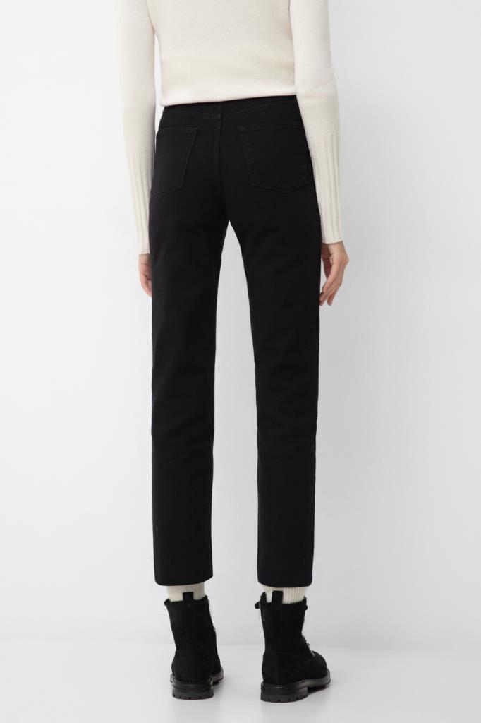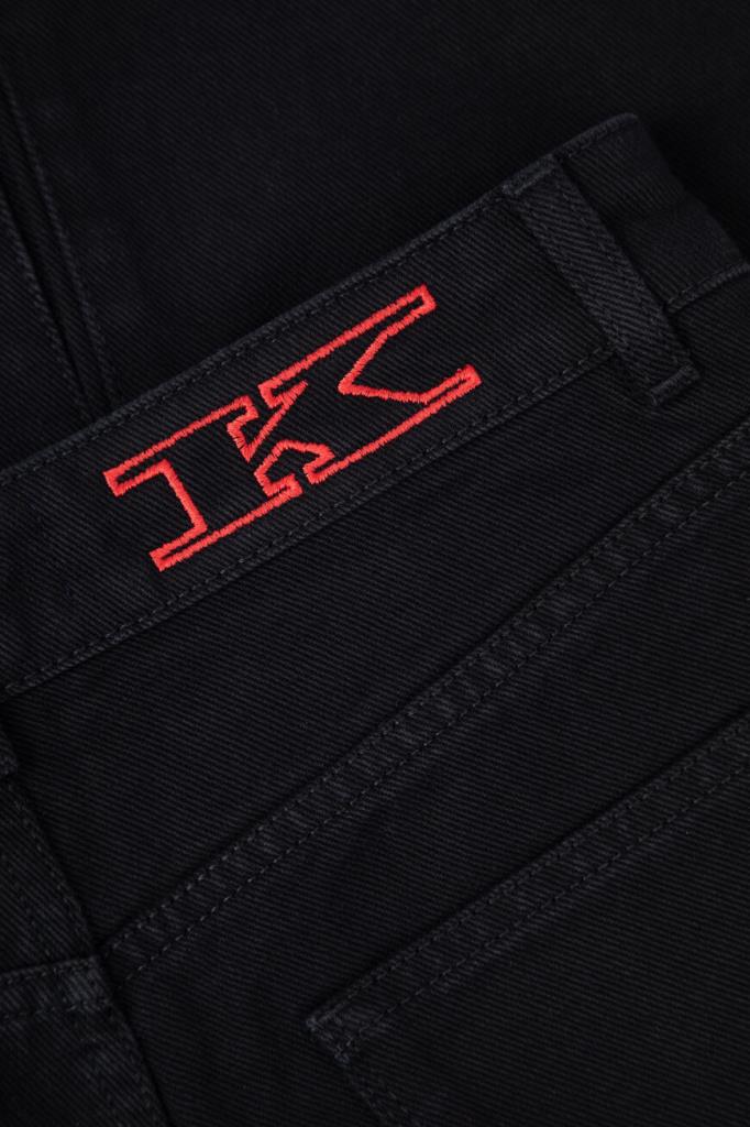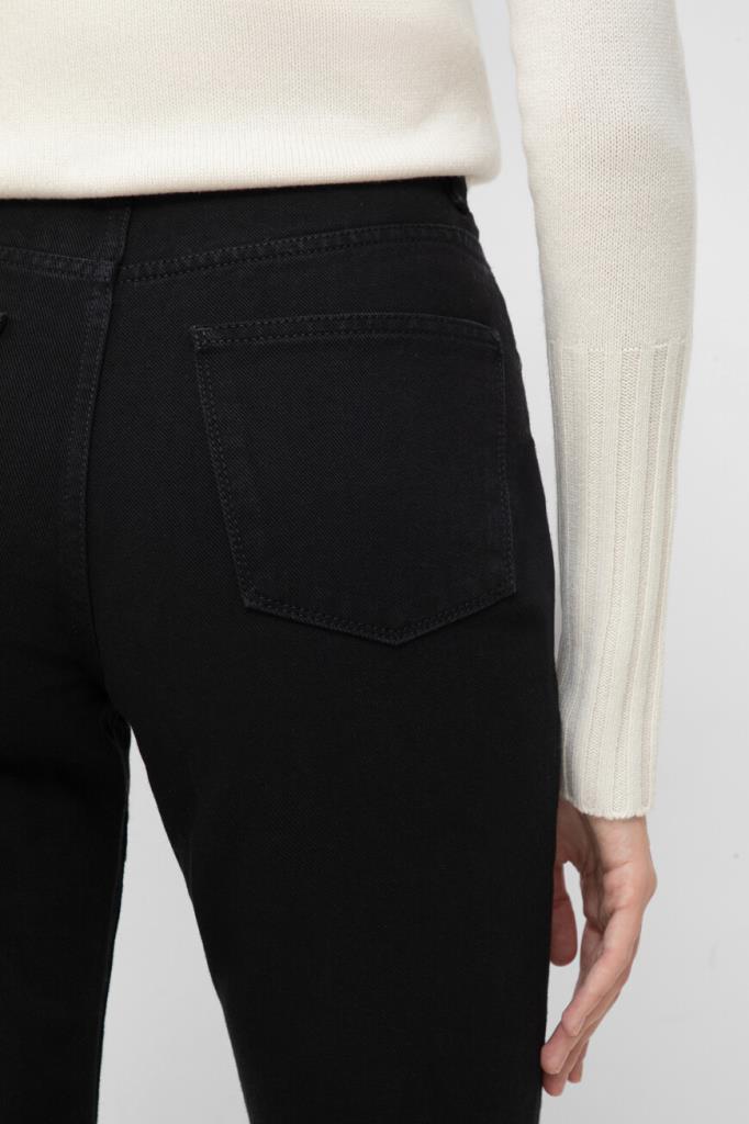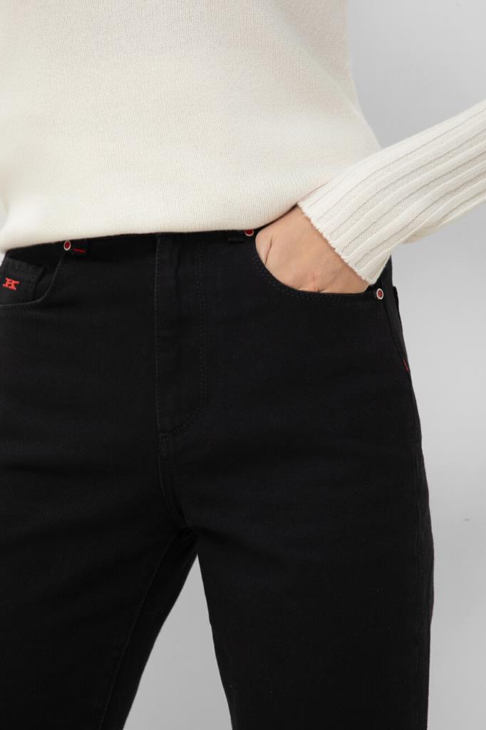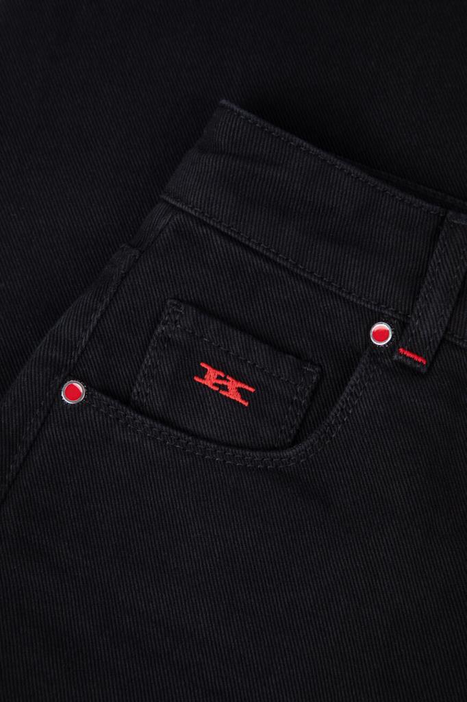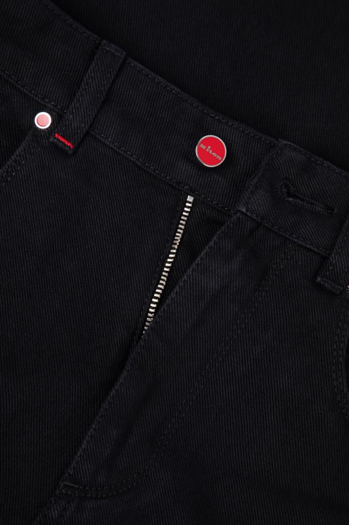 Хлопковые джинсы прямого силуэта от бренда Kiton. Изделие выполнено в чёрном цвете и оснащено застёжкой на потайную молнию и брендированную эмалированную пуговицу с планкой. О принадлежности повседневной модели Дому напоминают вышитые знаковые литеры «K» на маленьком кармане спереди и поясе сзади.