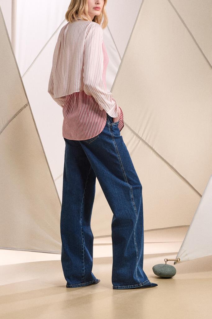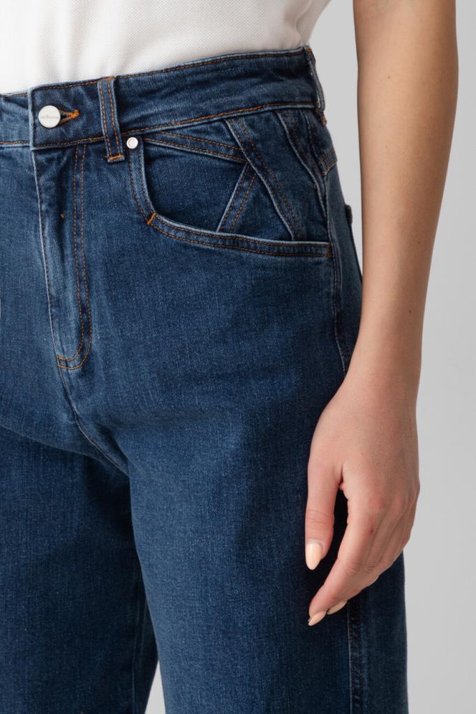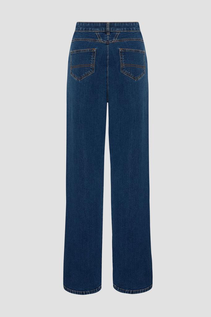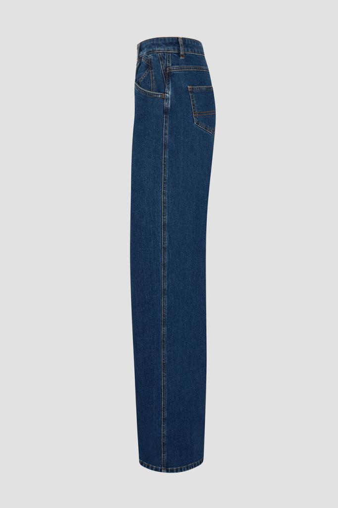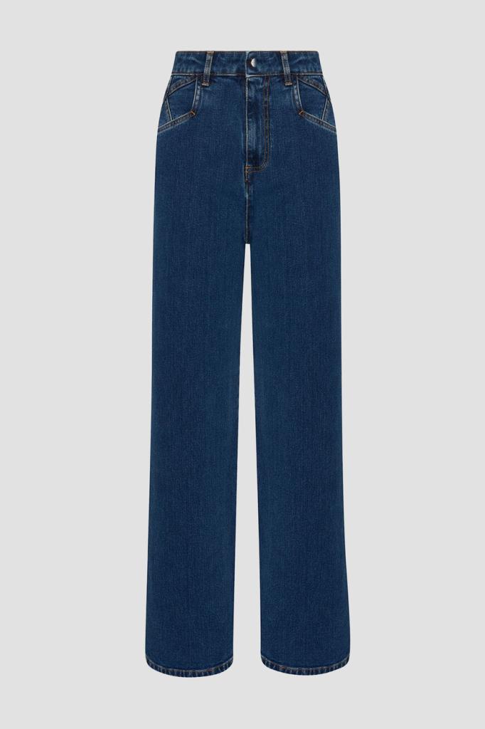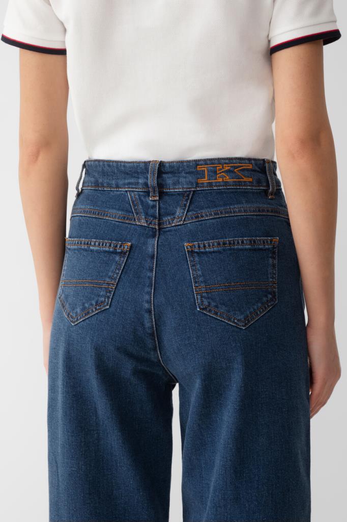 Синие джинсы Kiton Sartorial с оранжевой прострочкой на швах. Широкая модель изготовлена вручную из эластичного хлопкового денима с эффектом делаве и четырьмя карманами. Фасон расклешенной модели с высокой посадкой предполагает наличие плотного пояса со шлевками под ремень и застёжки на потайную молнию и брендированную эмалированную пуговицу с планкой. Боковые передние карманы декорированы двойными швами, сложенными в знаковую литеру «K».