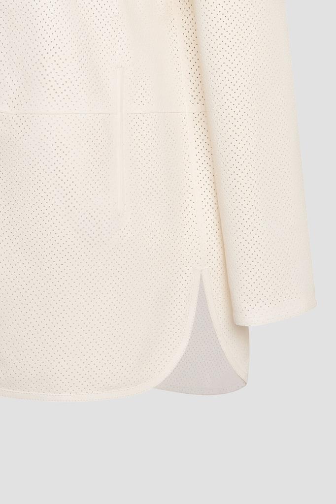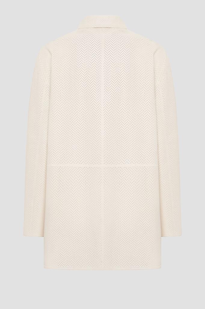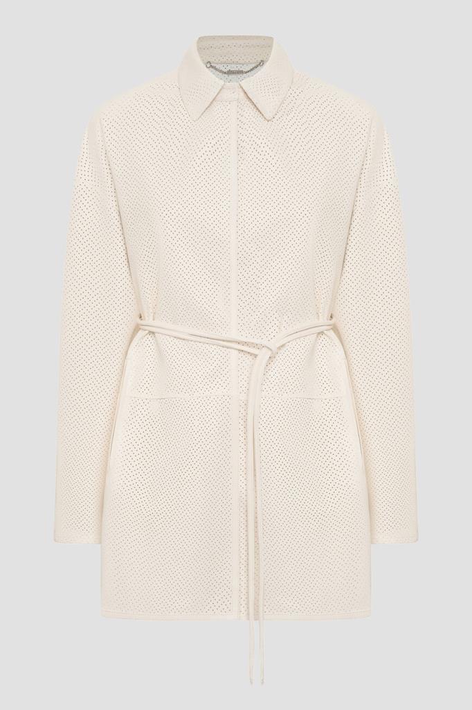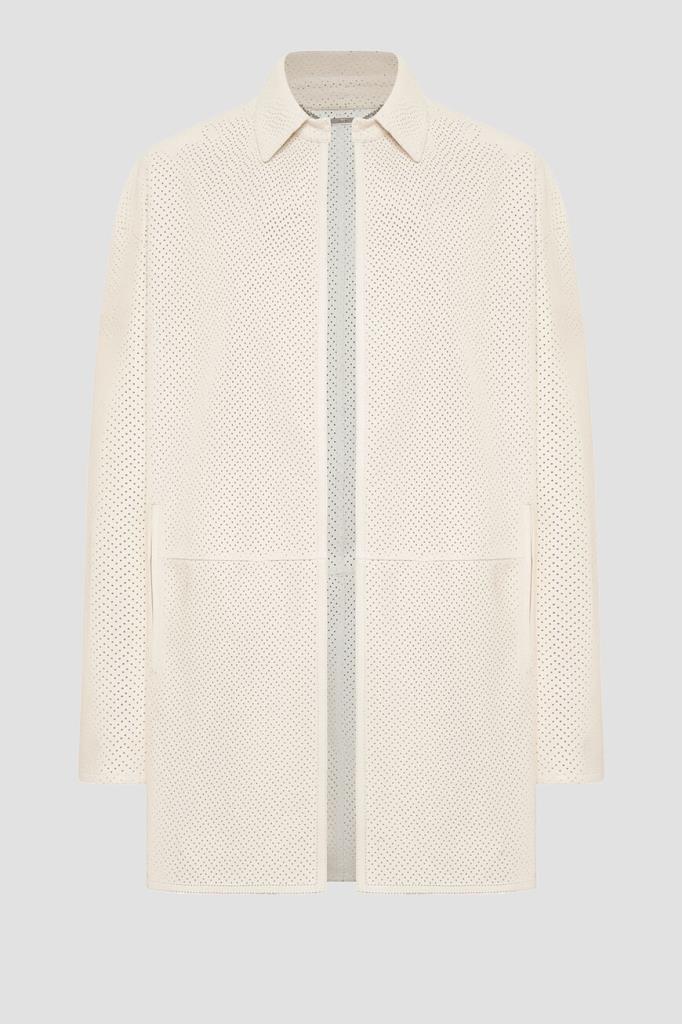 Белое пальто Kiton с отложным воротником. Для создания повседневной модели прямого силуэта используется мягкая кожа ягнёнка. Поверхность изделия покрыта перфорированным зигзагообразным мотивом. Пальто отличается наличием тонкого длинного ремешка, подчеркивающего линию талии и идущего в комплекте, и закруглёнными боковыми разрезами.