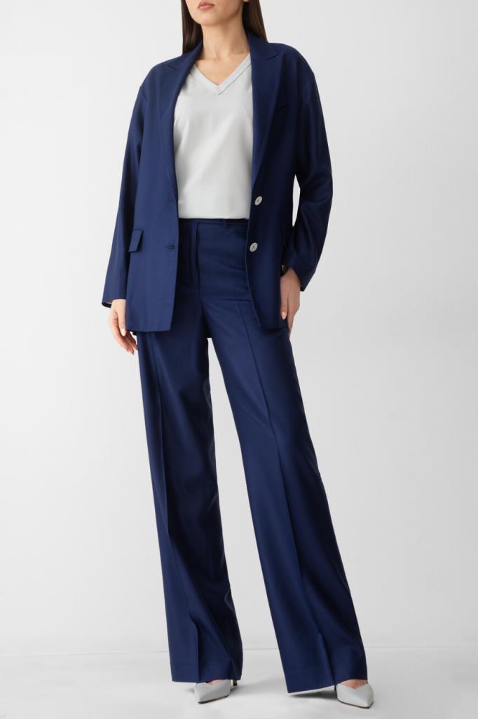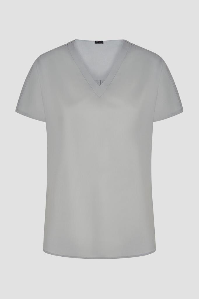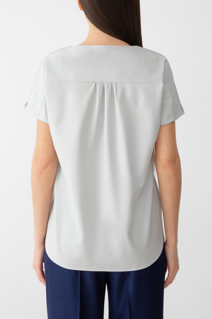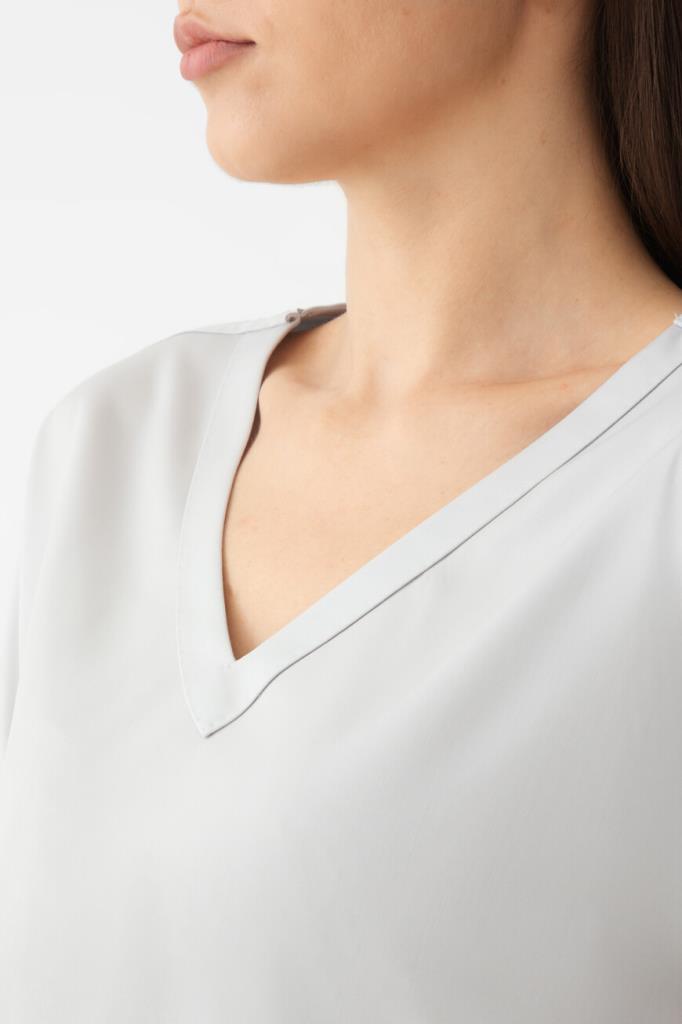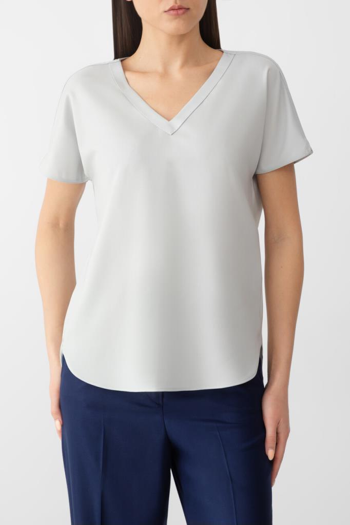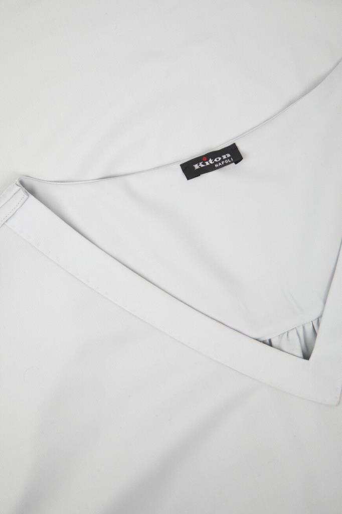 Женская футболка свободного силуэта от бренда Kiton. При создании модели с глубоким V-образным вырезом горловины была сделана ставка на материал. Изделие с короткими рукавами выполнено из тонкого твила на основе нежной шерсти премиального качества. Благодаря плотному диагональному переплетению особенно туго скрученных нитей такая ткань в мягкости не уступает шёлку, почти не мнётся и не пилингуется, долго сохраняя опрятный вид. Образ можно завершить брюками с классическими стрелками и однобортный жакетом из той же коллекции.