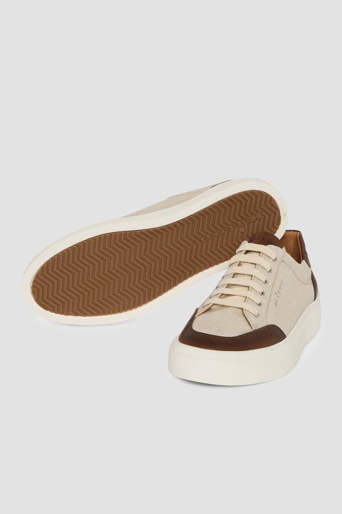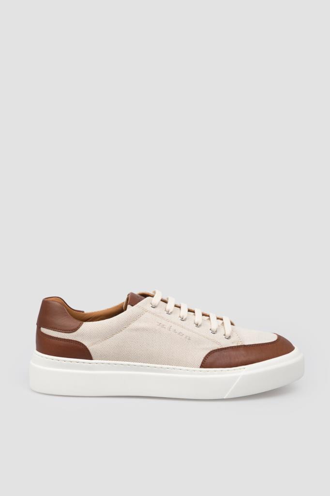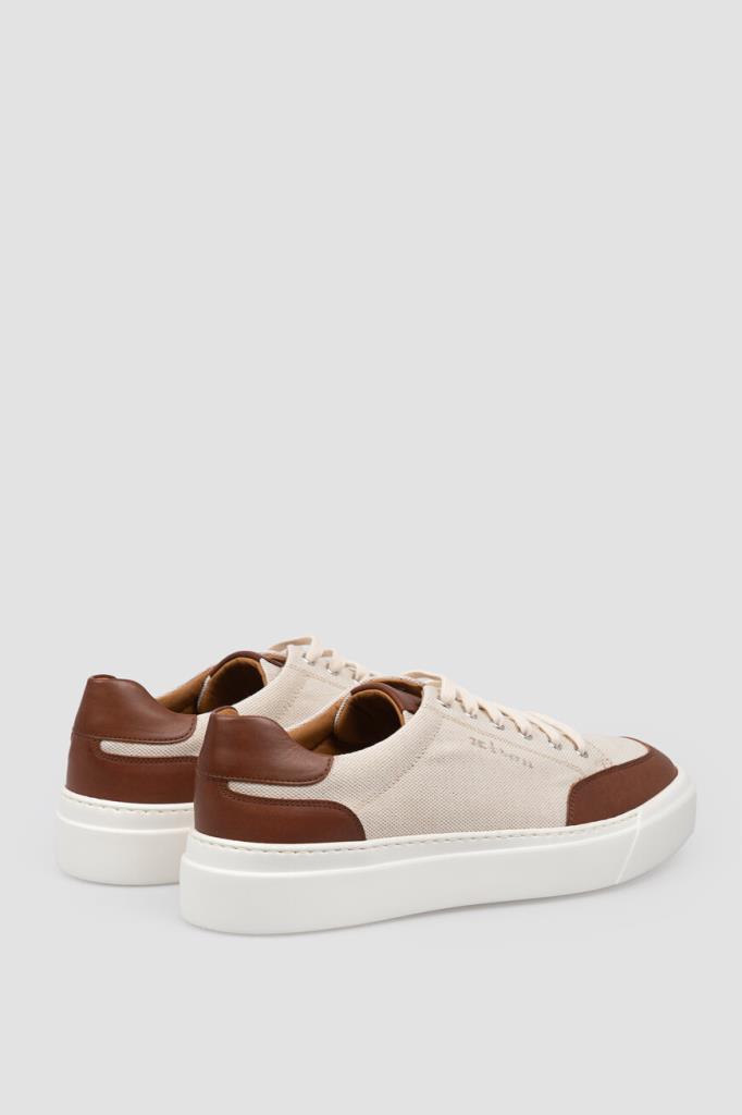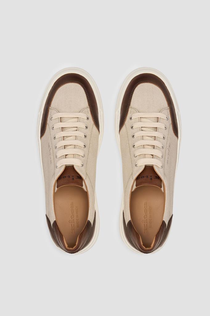 Сникеры Kiton с минималистичной знаковой символикой. Пара выполнена из плотного хлопкового трикотажа светло-бежевого оттенка с коричневыми кожаными вставками на носке, язычке и заднике. Боковины декорированы вышитыми лого, на язычке присутствует вставка с тиснёным логотипом, а кожаные стельки и подошва белого цвета дополнены брендированием. Изделие установлено на плоскую объёмную подошву из натуральной резины с рифлением снизу.