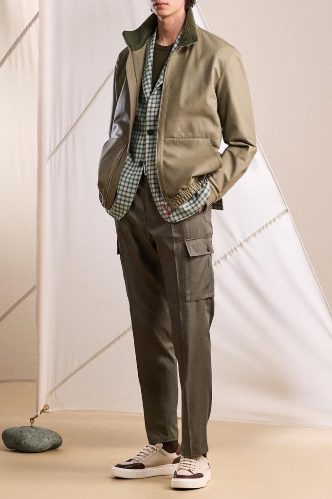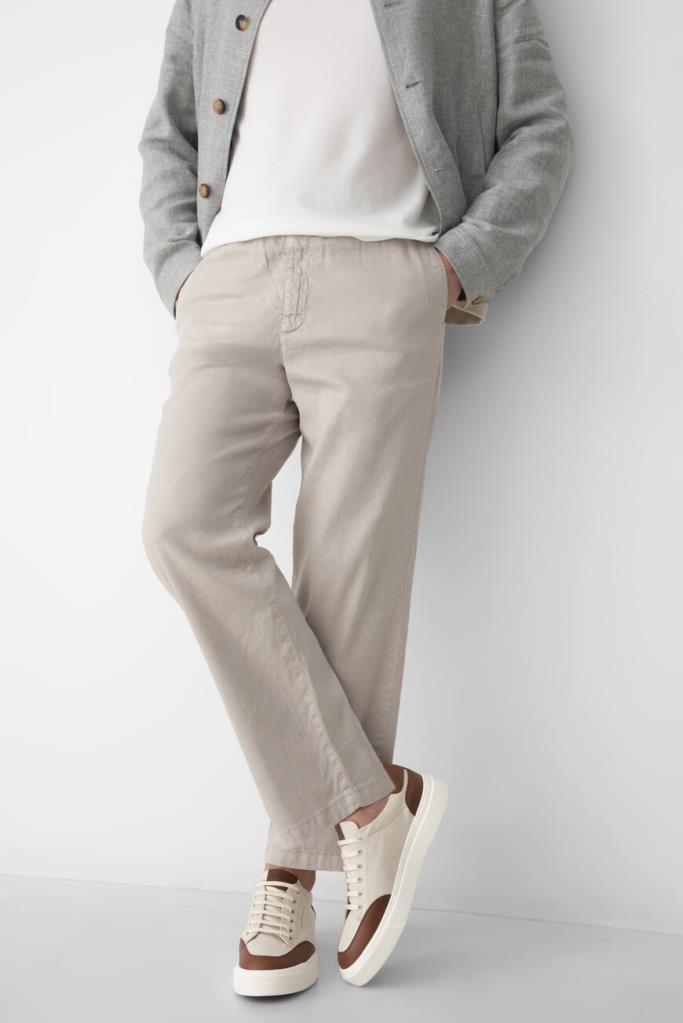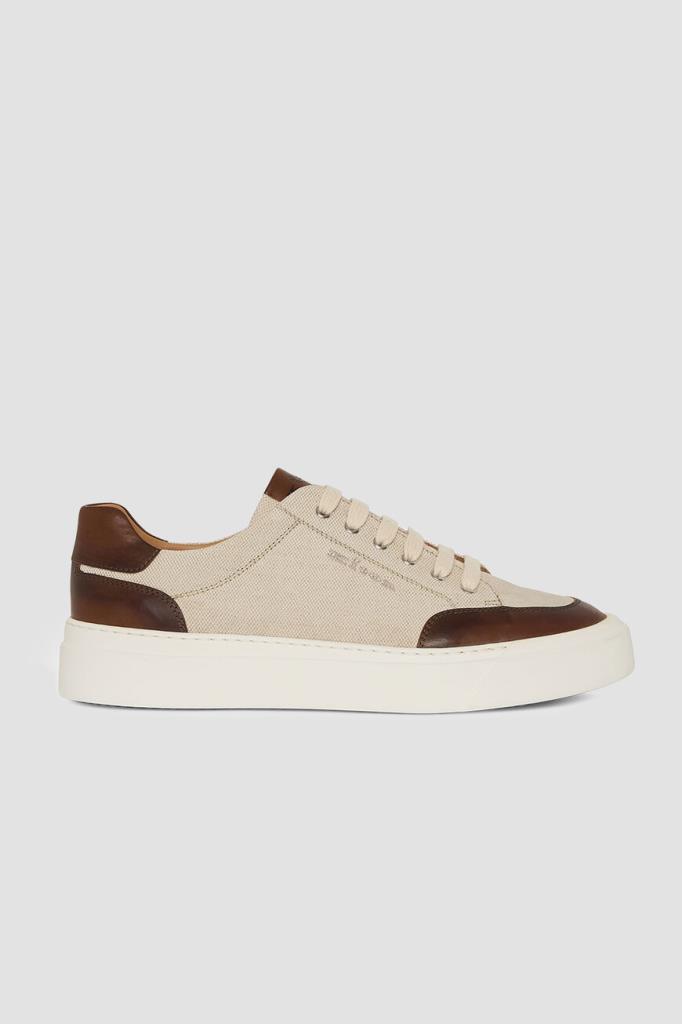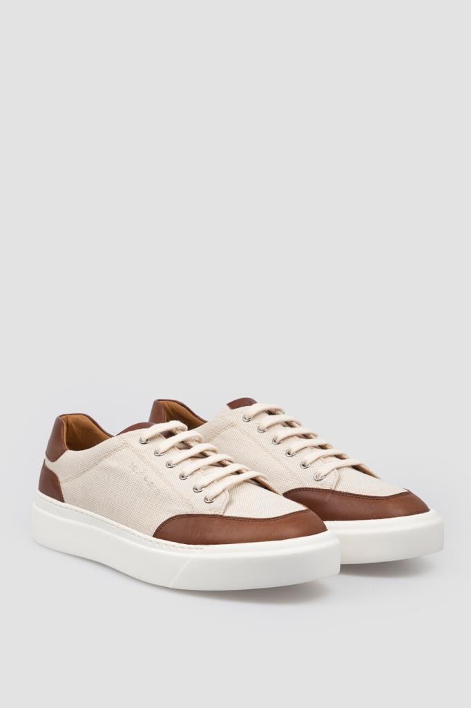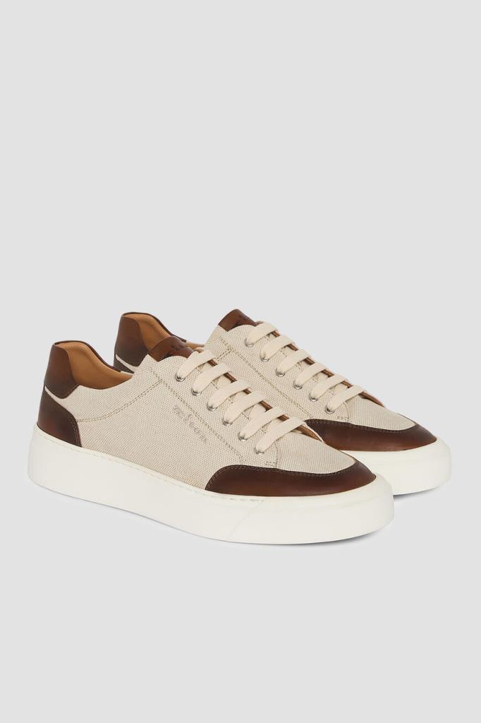 Сникеры Kiton с минималистичной знаковой символикой. Пара выполнена из плотного хлопкового трикотажа светло-бежевого оттенка с коричневыми кожаными вставками на носке, язычке и заднике. Боковины декорированы вышитыми лого, на язычке присутствует вставка с тиснёным логотипом, а кожаные стельки и подошва белого цвета дополнены брендированием. Изделие установлено на плоскую объёмную подошву из натуральной резины с рифлением снизу.