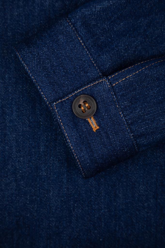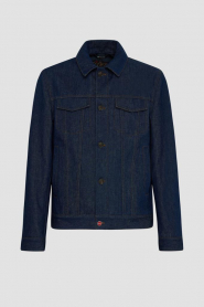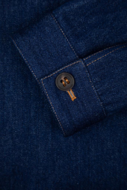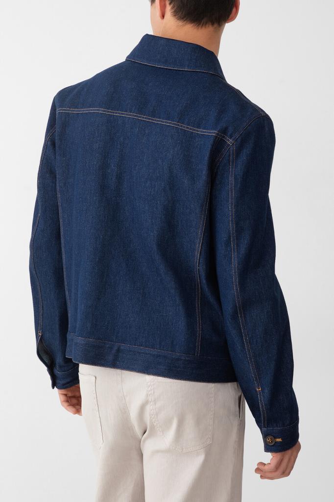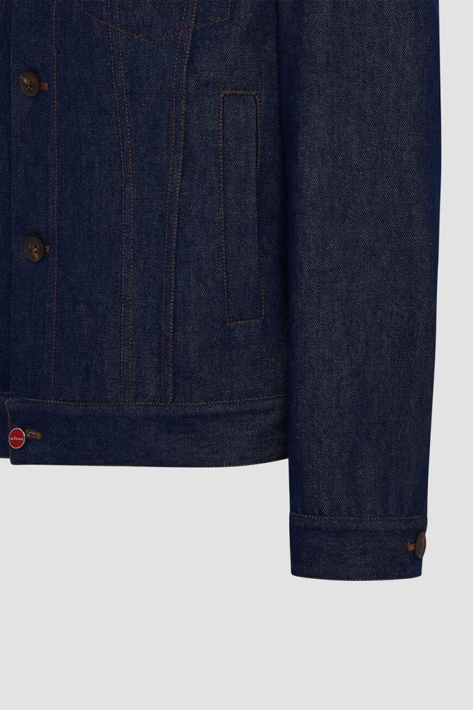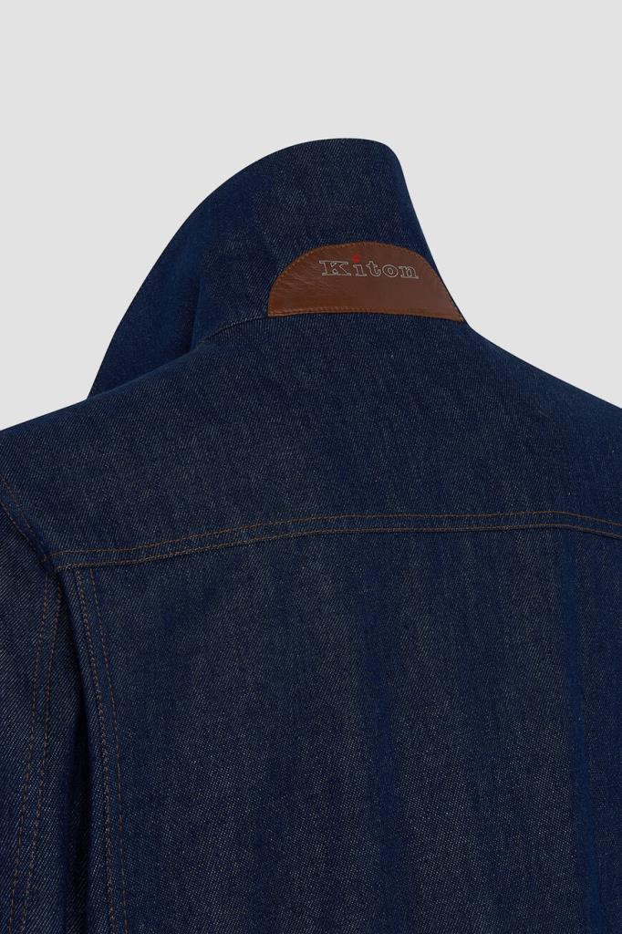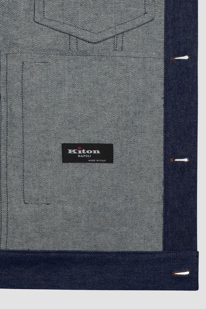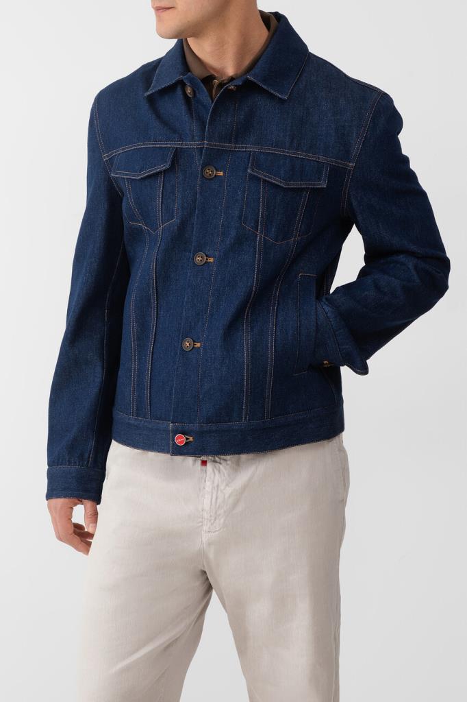 Синий блузон Kiton с прострочкой на швах. Изделие сшито из мягкого хлопкового денима и оснащено застёжкой на крупные роговые пуговицы. О принадлежности модели Дому напоминает тёмно-синяя брендированная вставка с вышитым оранжевым логотипом на внутренней стороне под воротником. Куртка интересна наличием очерченной кокетки и четырёх карманов.