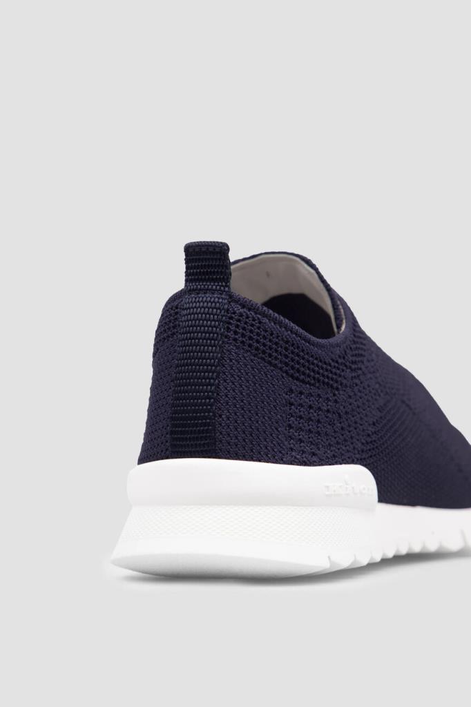 Сникеры Kiton FIT - это идеальное сочетание мастерства и современной эстетики. Для изготовления тёмно-синей модели с широкой колодкой выбран дышащий спортивный текстиль на основе хлопка стрейч с разными текстурами. Отличительными деталями являются закрытая белая шнуровка и прорезиненные накладки, надёжно защищающие мыс и задник. На язычке вышит крупный логотип, отсылающий к Дому.