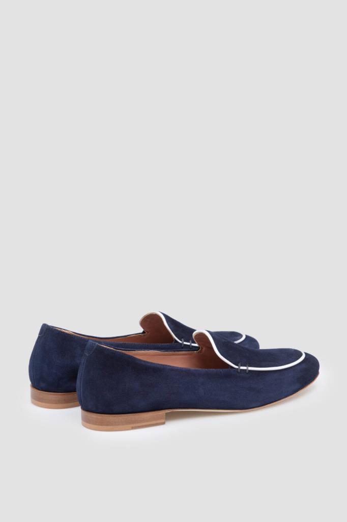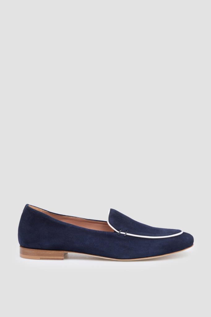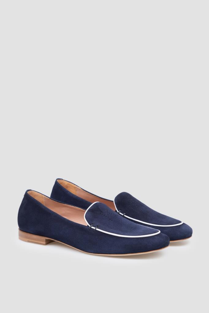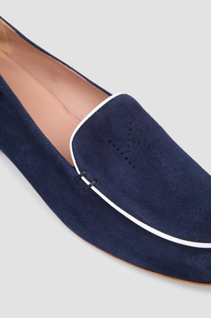 Женские лоферы Kiton с белым кантом на широком мыске. Для изготовления модели на невысоком устойчивом каблуке используется бархатистая замша. Союзка украшена перфорированным узором в виде крупной знаковой литеры «K». Отделка внутри тёмно-синей пары обуви выполнена из тонкой телячьей кожи, которая не препятствует циркуляции воздуха. Изделие на кожаной подошве станет элегантным завершающим штрихом повседневного образа.