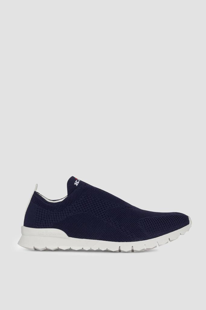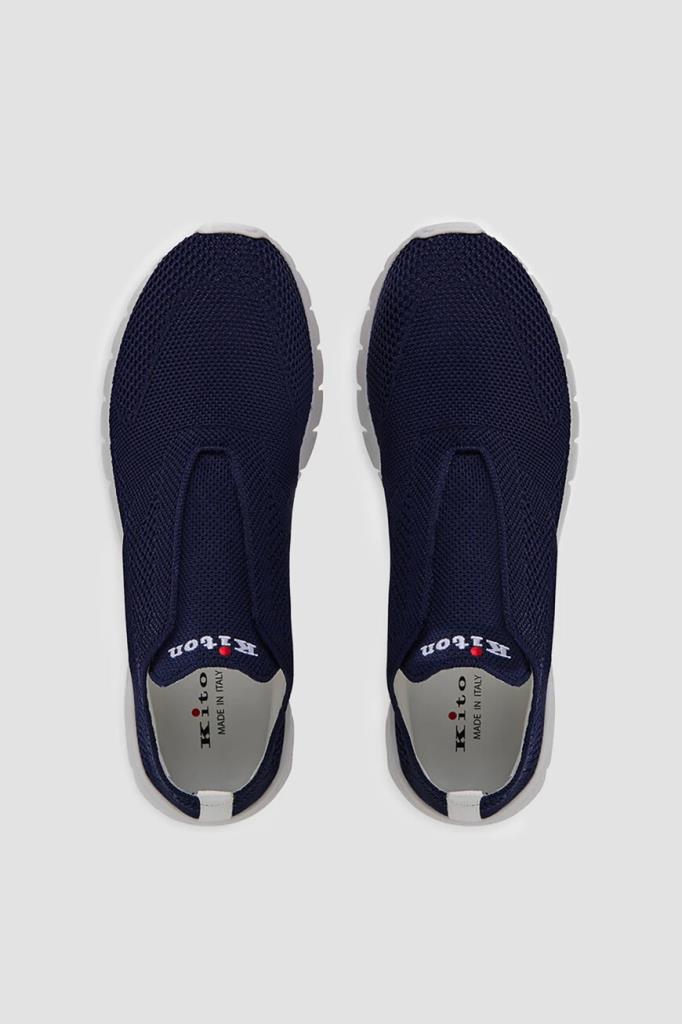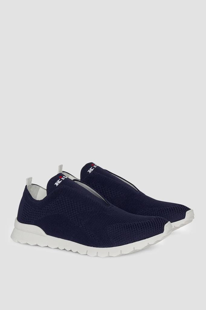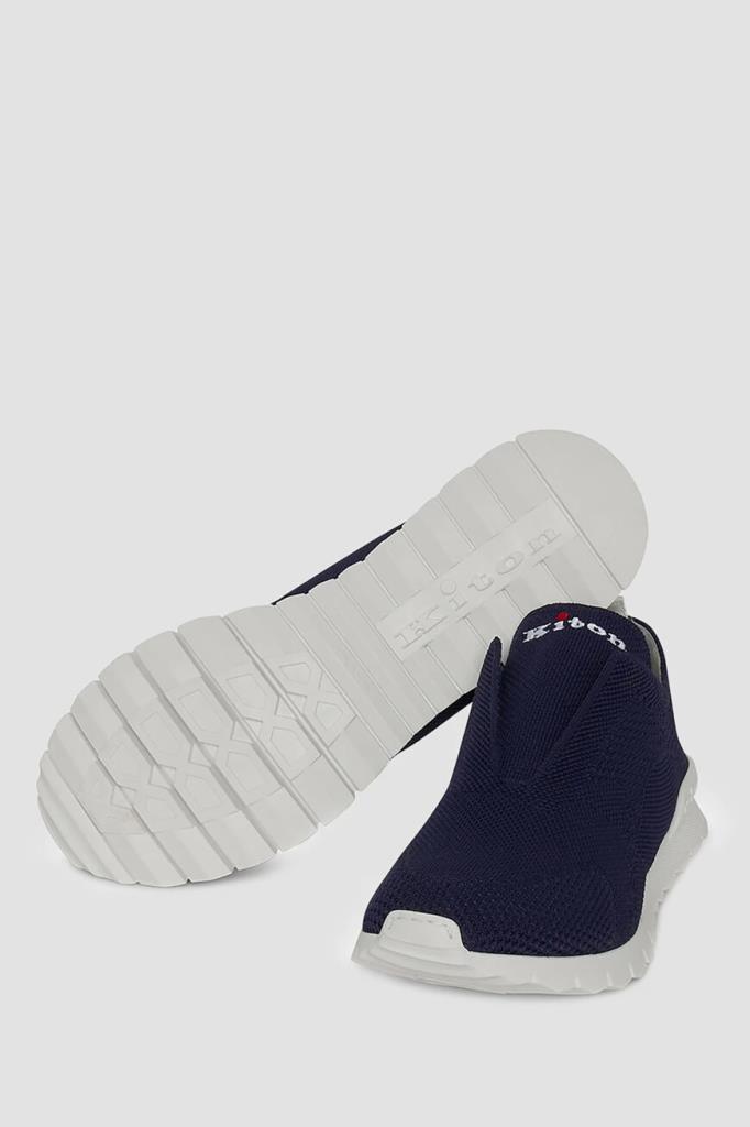 Текстильные сникеры Kiton выполнены без шнуровки. Удобная пара из дышащего спортивного текстиля на основе хлопка стрейч с узорами разной плотности окрашена в глубокий тёмно-синий оттенок. Лёгкая гибкая подошва из термопластичной резины белого цвета не утяжеляет обувь, а за счёт эластичной петли в задней части модель удобно надевать и снимать. Внутренняя отделка из тонкой телячьей кожи обеспечивает дополнительный комфорт при посадке изделия по ноге, делая конструкцию более плотной.