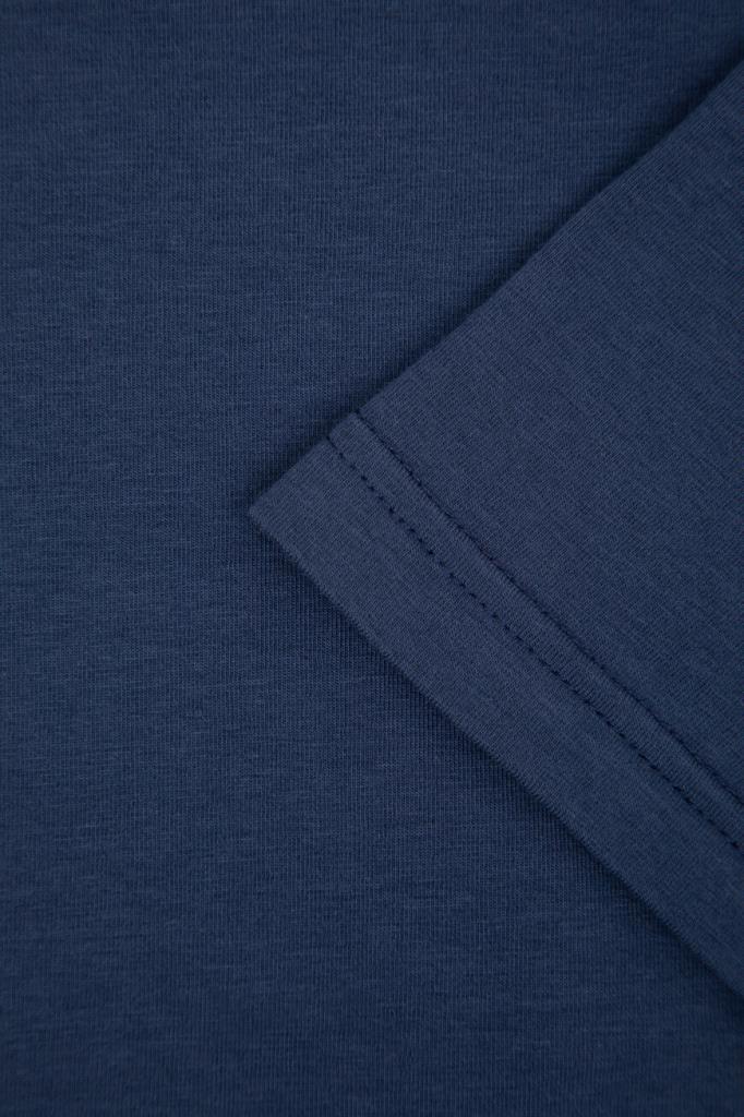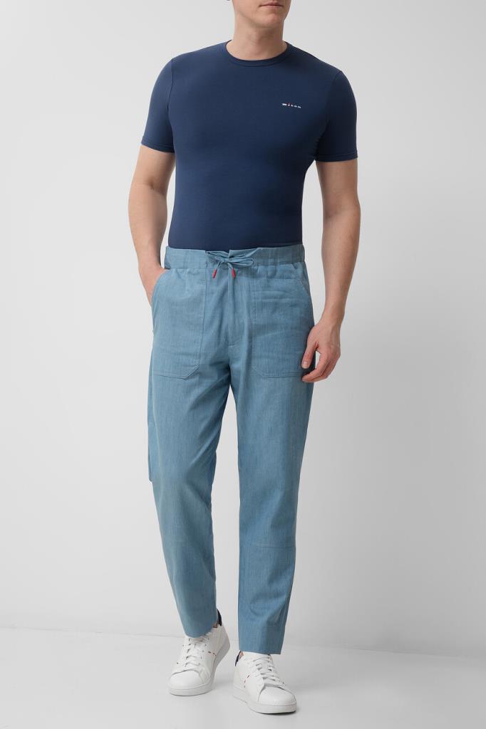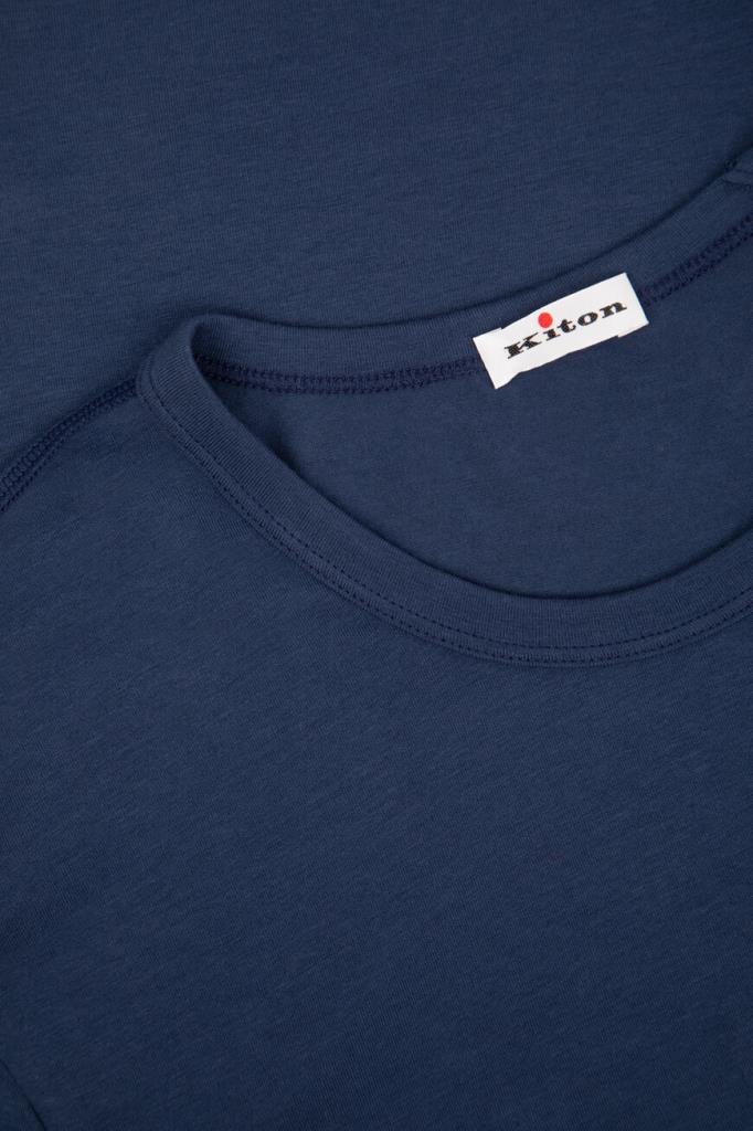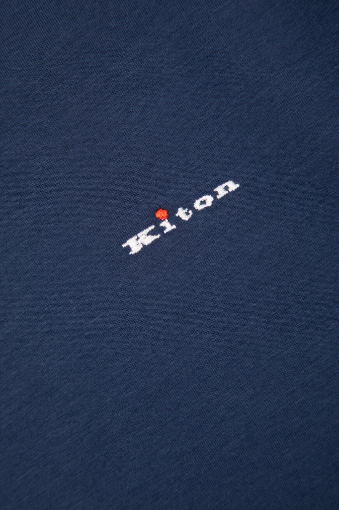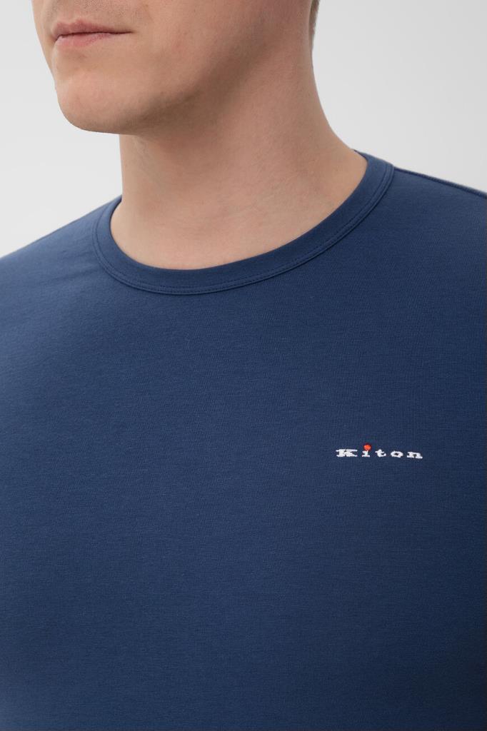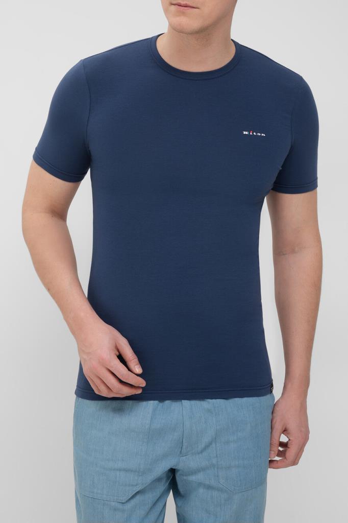 Прилегающая футболка Kiton с минималистичным знаковым декором. Изделие сшито из эластичного хлопкового джерси синего цвета с круглым вырезом горловины. Атрибутом Дома является вышитый белый логотип, размещённый слева на груди. Модель станет основой разных повседневных комплектов.