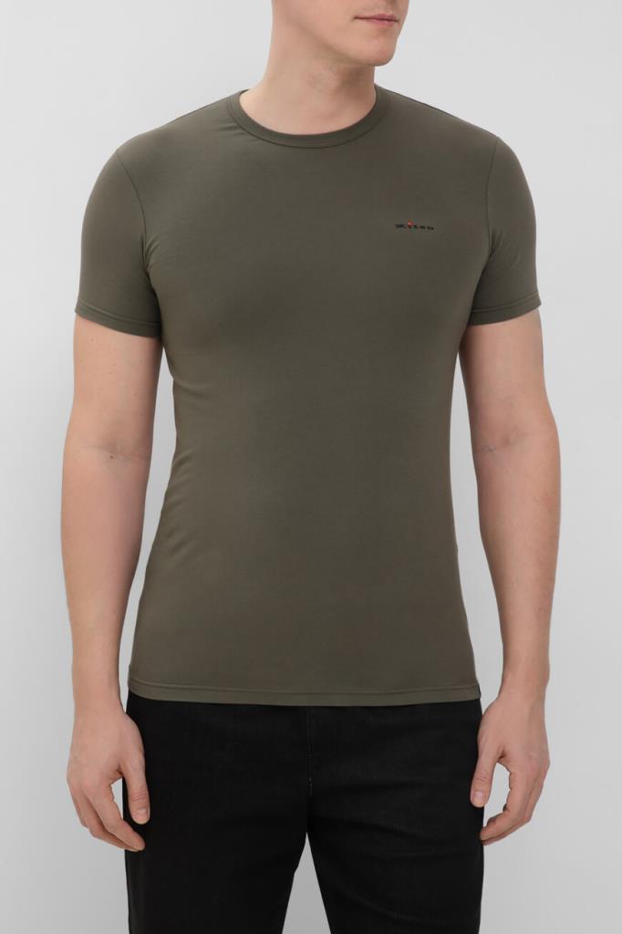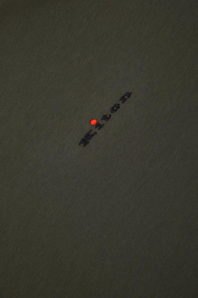 Трикотажная футболка Kiton в оттенке хаки безупречно садится по фигуре. Для пошива изделия прилегающего силуэта выбран гладкий хлопок стрейч. Слева на груди вышит минималистичный лого Дома, а спереди снизу размещена чёрно-белая вставка с логотипом. Модель с короткими рукавами смотрится выигрышно в тандеме с джинсами из той же коллекции.