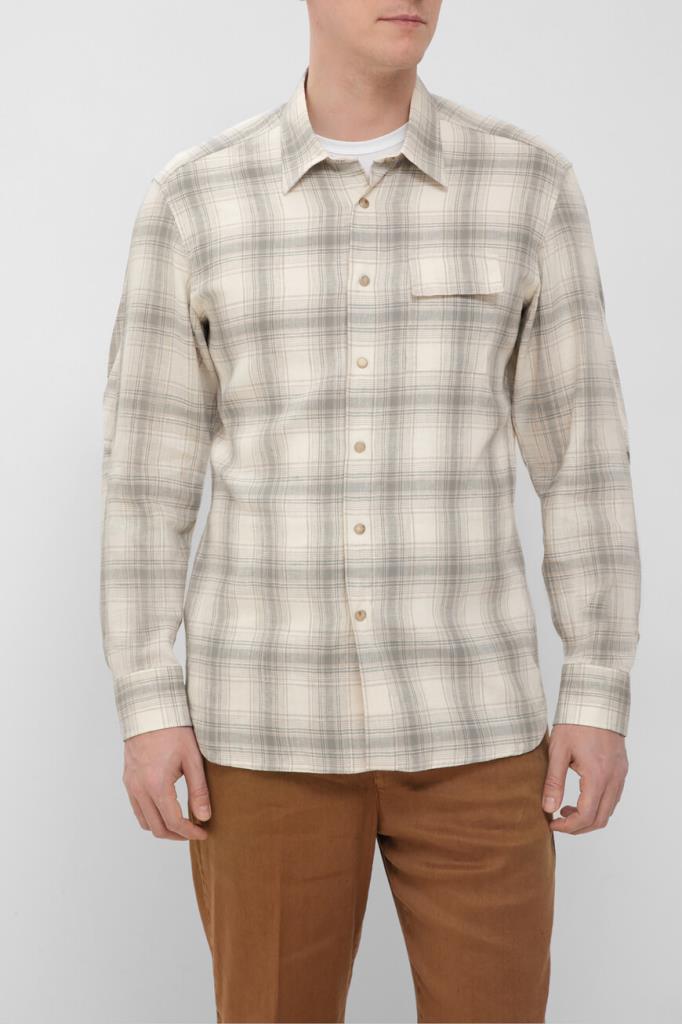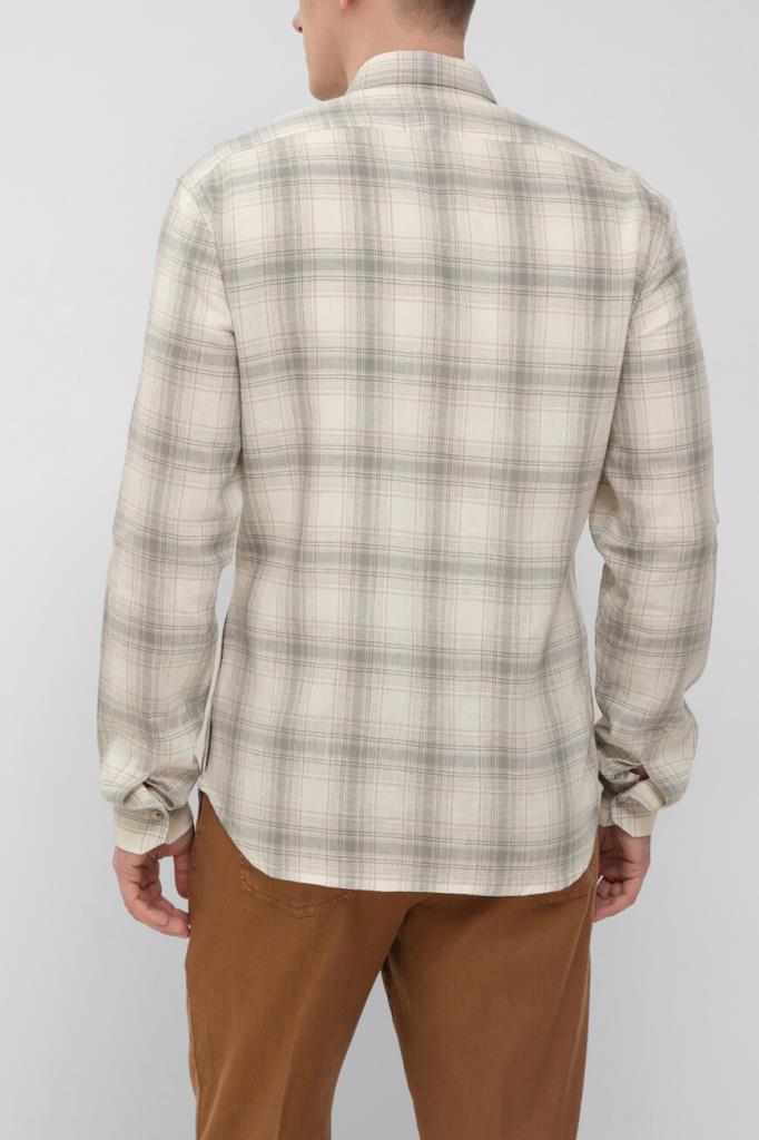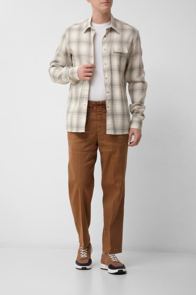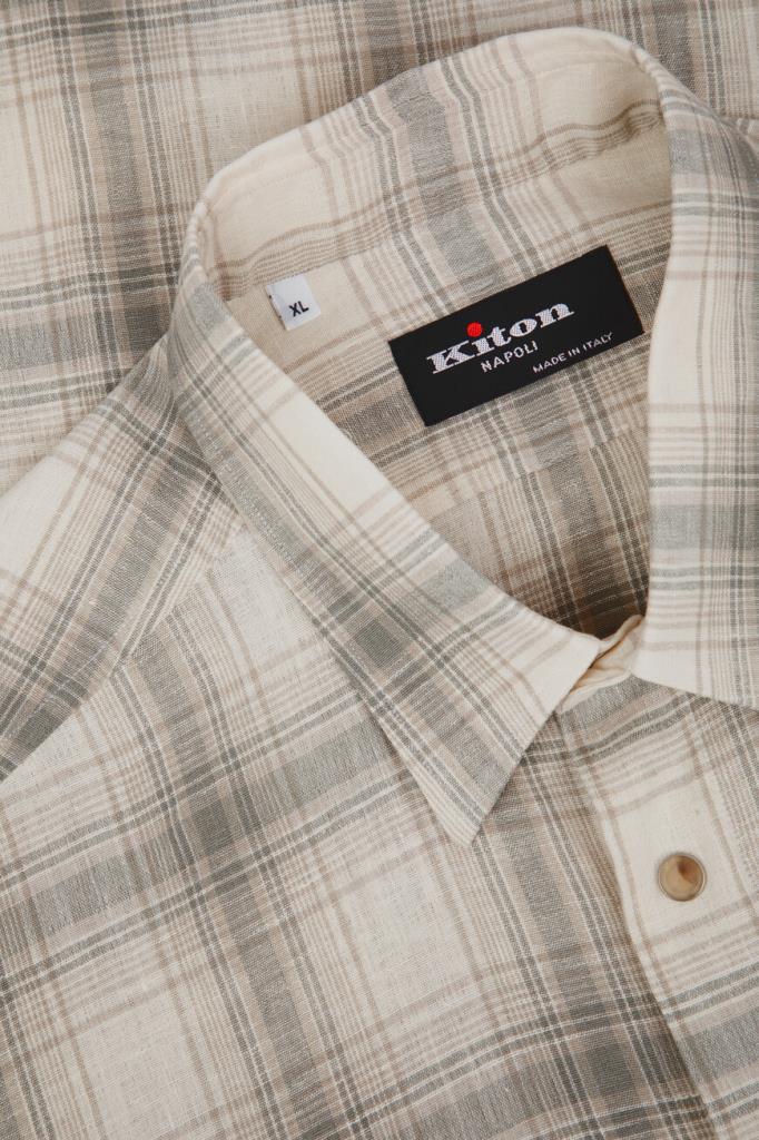 Рубашка Kiton с трёхцветным геометрическим мотивом в крупную клетку. Конструкция изделия из мягкого трикотажа на основе прочного эластичного полиэфира и льна характеризуется прямым силуэтом и наличием длинных рукавов с манжетами на клёпке. В модели предусмотрены три кармана: нагрудный накладной с клапаном слева и два основных в боковых швах. Рубашка с закруглённым низом комфортно садится по фигуре и с лёгкостью сочетается с другими предметами мужского casual-гардероба.