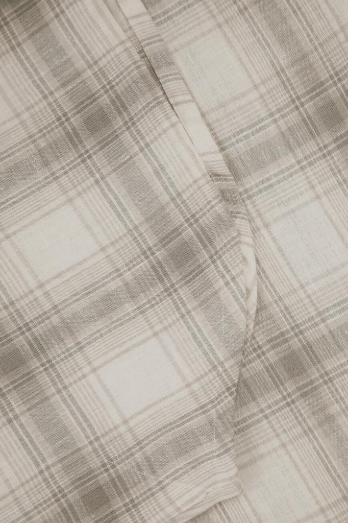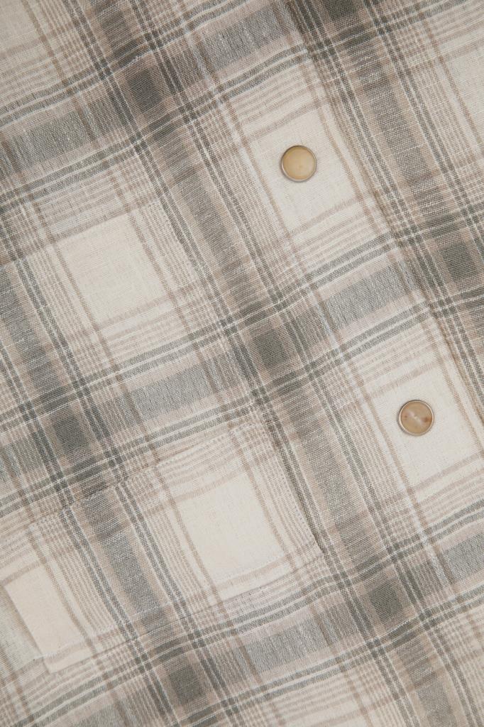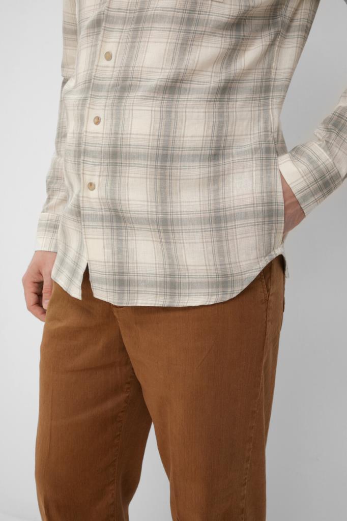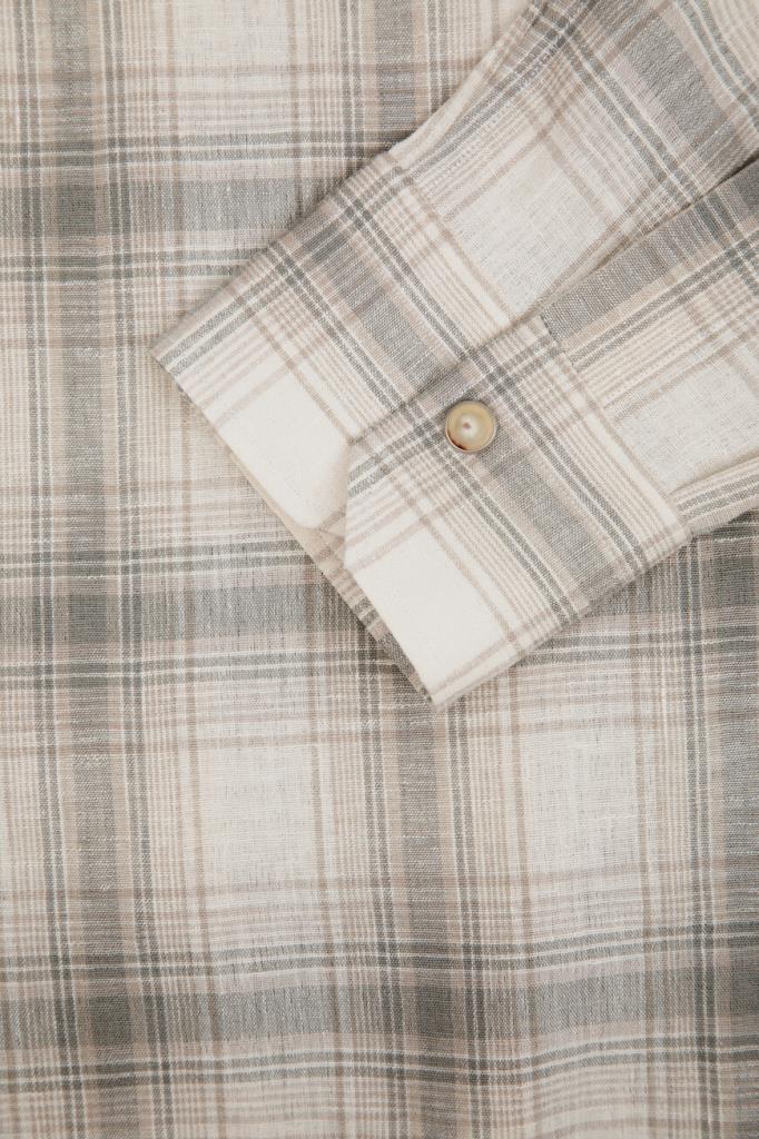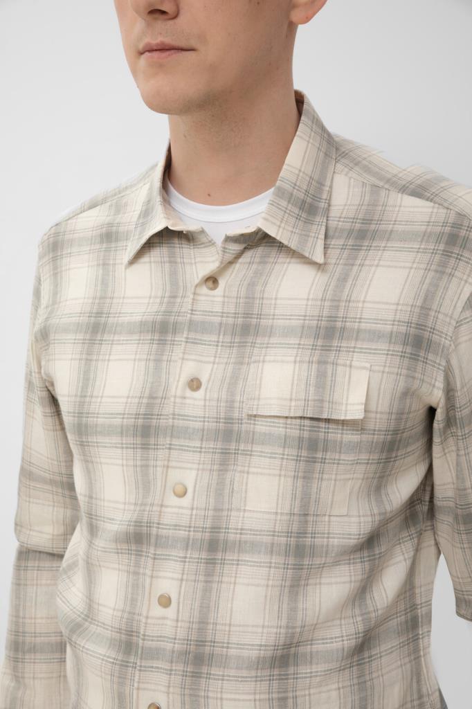 Рубашка Kiton с трёхцветным геометрическим мотивом в крупную клетку. Конструкция изделия из мягкого трикотажа на основе прочного эластичного полиэфира и льна характеризуется прямым силуэтом и наличием длинных рукавов с манжетами на клёпке. В модели предусмотрены три кармана: нагрудный накладной с клапаном слева и два основных в боковых швах. Рубашка с закруглённым низом комфортно садится по фигуре и с лёгкостью сочетается с другими предметами мужского casual-гардероба.