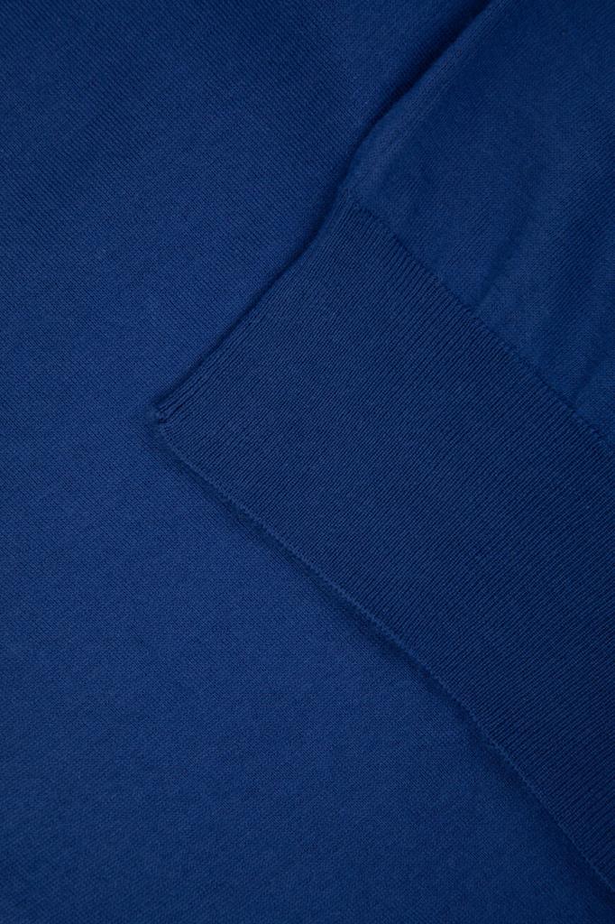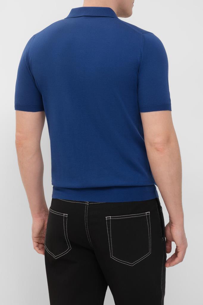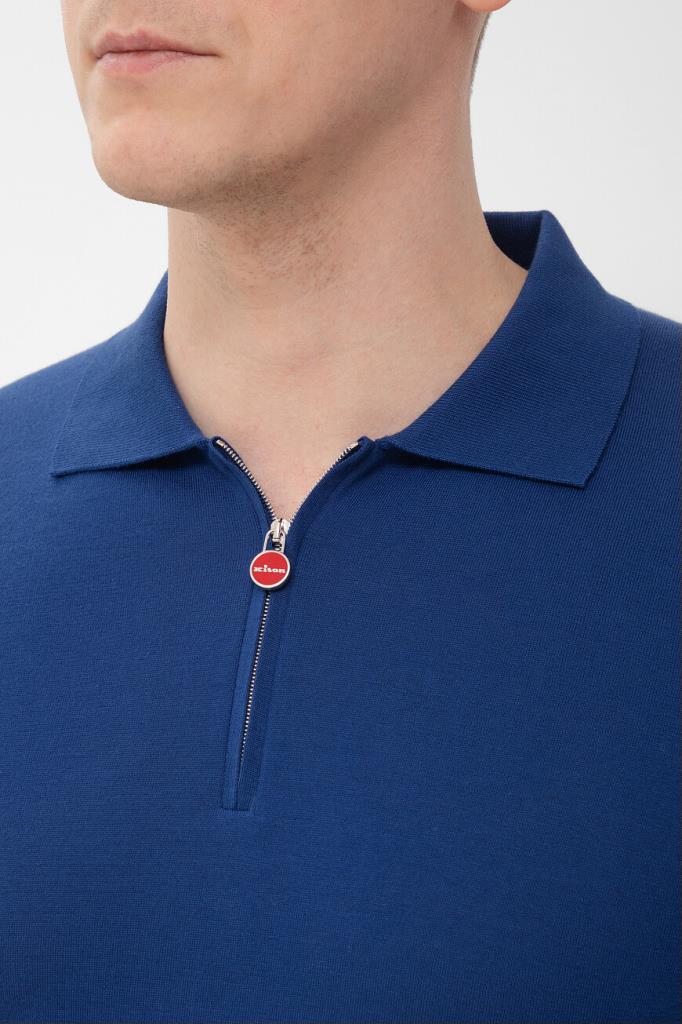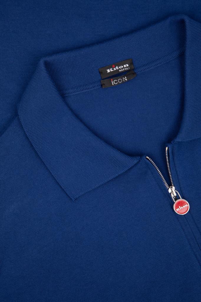 Прямое поло Kiton синего оттенка. Изделие выполнено из гладкого трикотажа на основе отборного длинноволокнистого хлопка, который внешне и на ощупь напоминает шёлк. Процесс пошива модели Icon состоит из 22 операций, половина из которых производится вручную, поэтому поло идеально садится по фигуре и надолго сохраняет безупречный внешний вид. Глубина горловины регулируется короткой молнией с брендированным эмалированным пуллером.