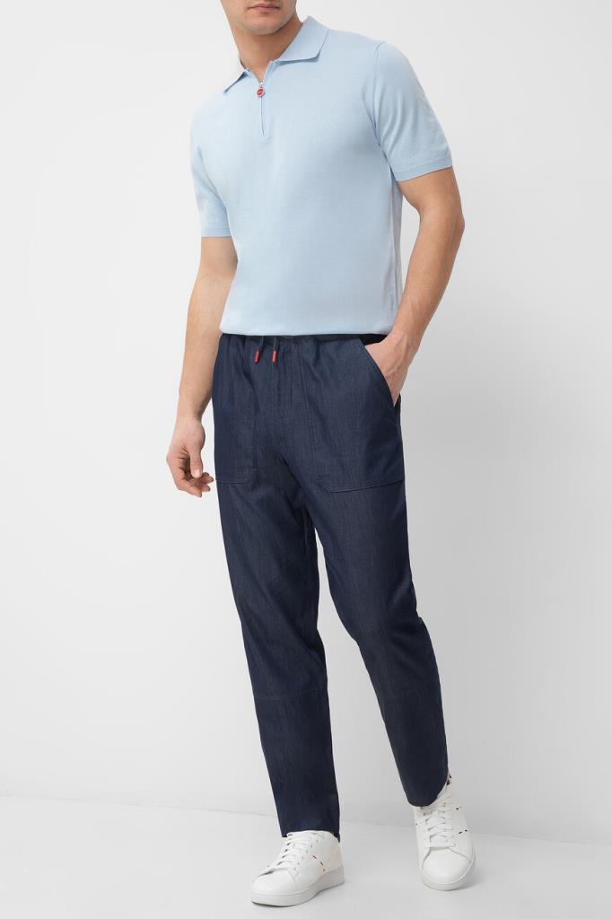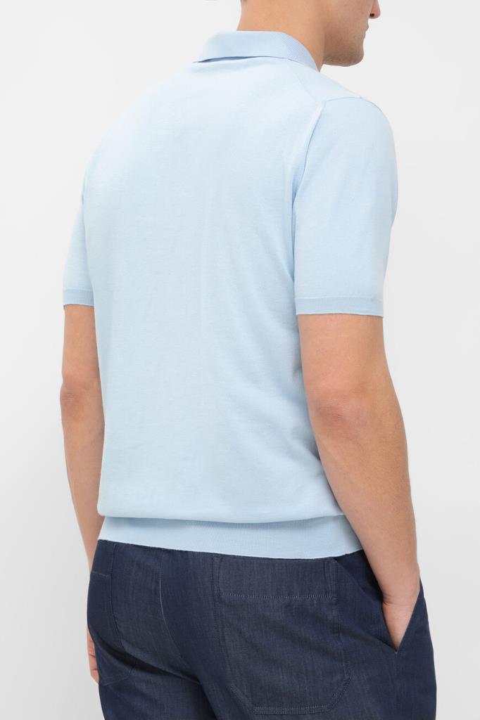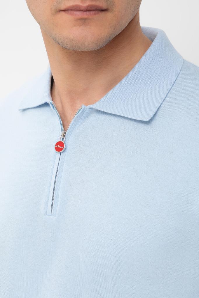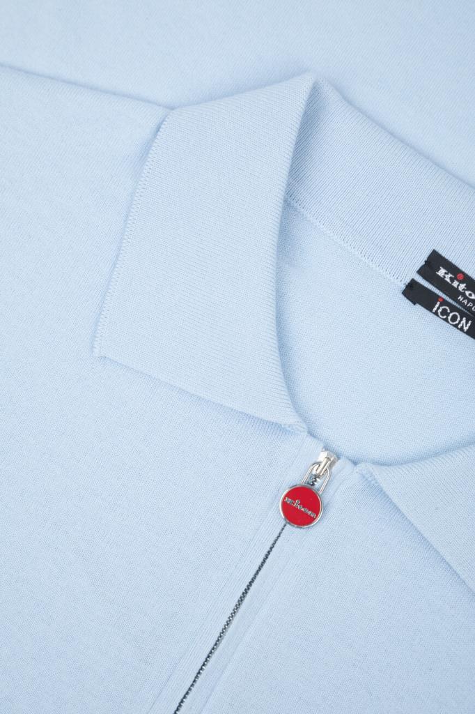 Голубое поло Icon от бренда Kiton со смещёнными назад плечевыми швами. Повседневная модель из мягкого хлопкового трикотажа застёгивается на молнию с брендированным эмалированным пуллером. Для оптимальной посадки в изделии прямого силуэта предусмотрены широкий эластичный пояс и манжеты-резинки.