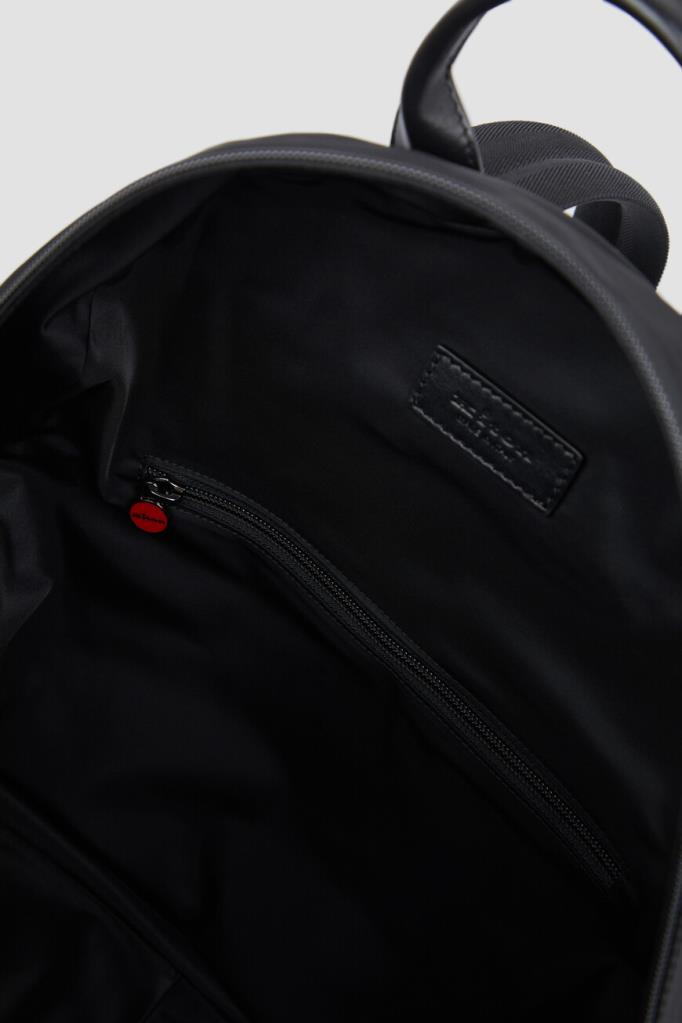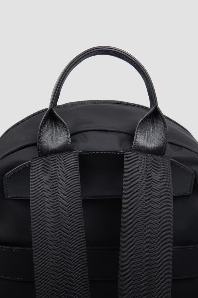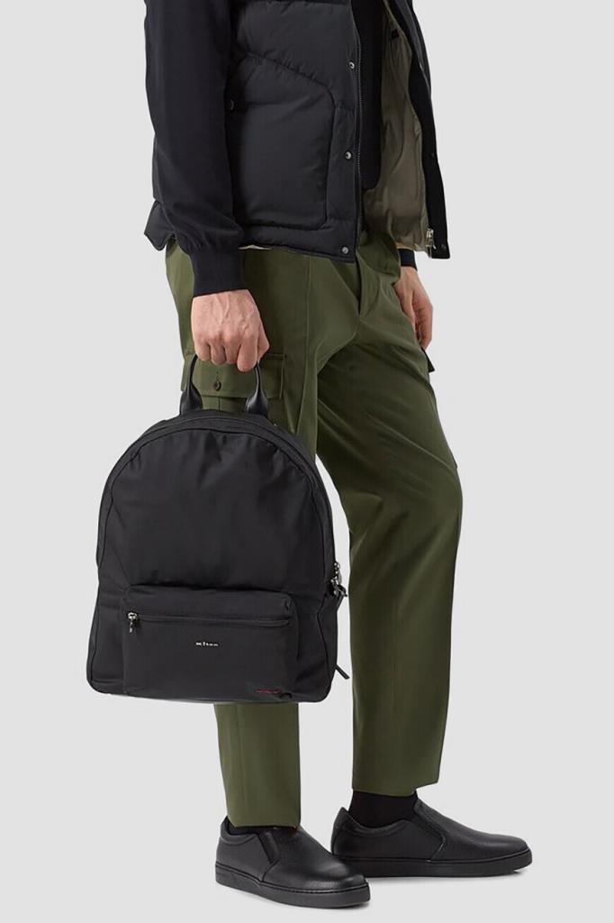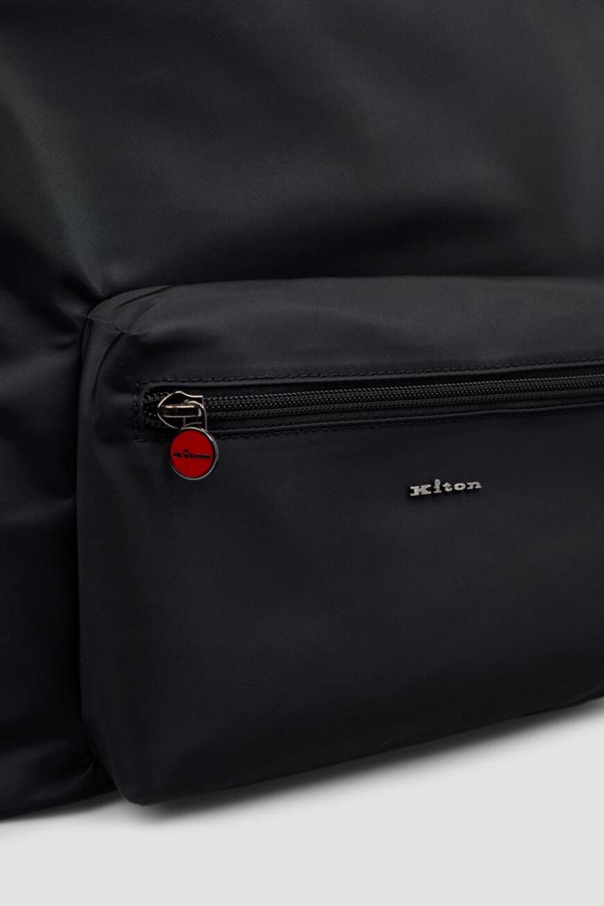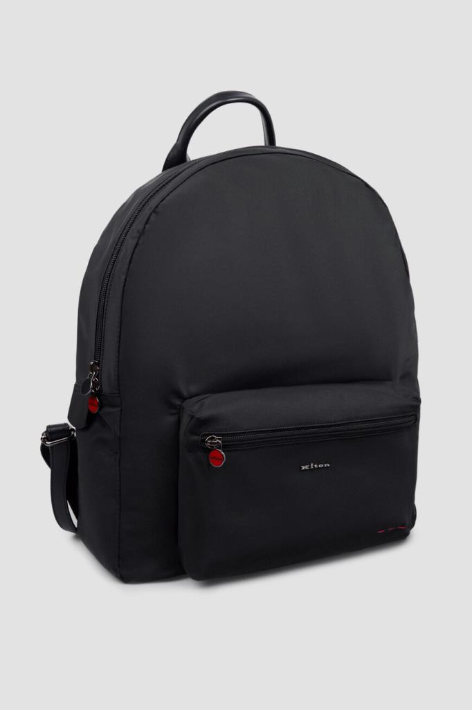 Текстильный рюкзак Kiton с просторным внутренним отделением. Изделие чёрного цвета, выполенное на основе прочного износостойкого нейлона и акрила, оснащено короткой округлой ручкой из телячьей кожи сверху и широкими регулируемыми ремнями для переноски. Отличительными деталями являются минималистичный рельефный логотип и три стежка фирменного алого оттенка на внешнем кармане спереди.