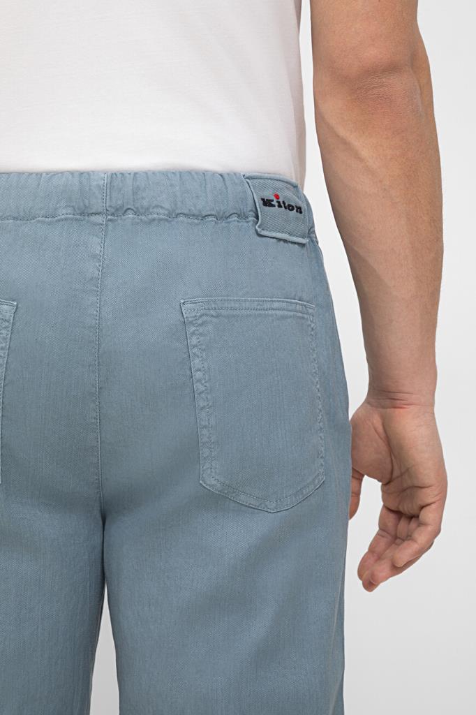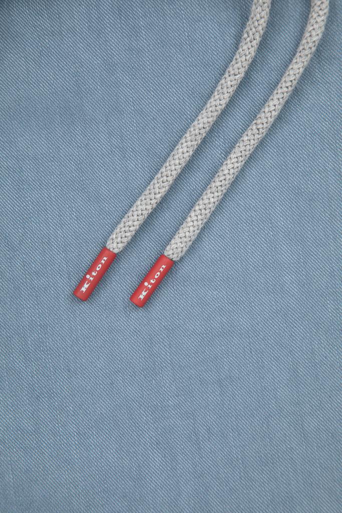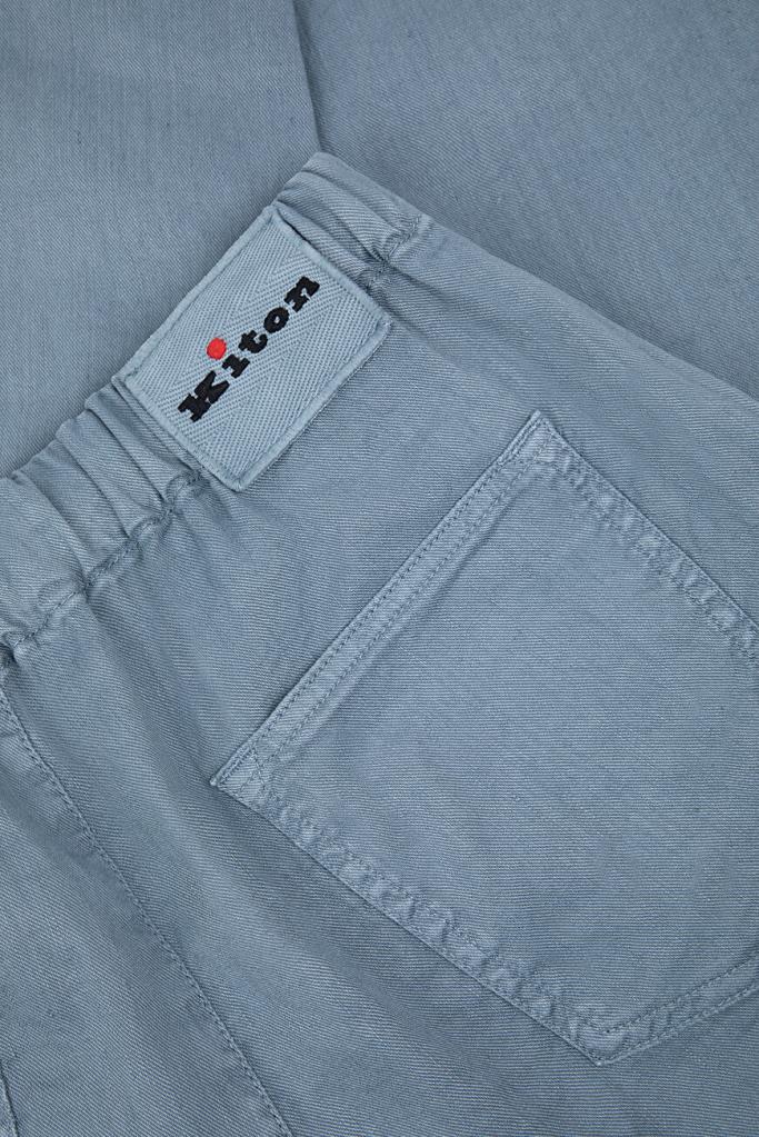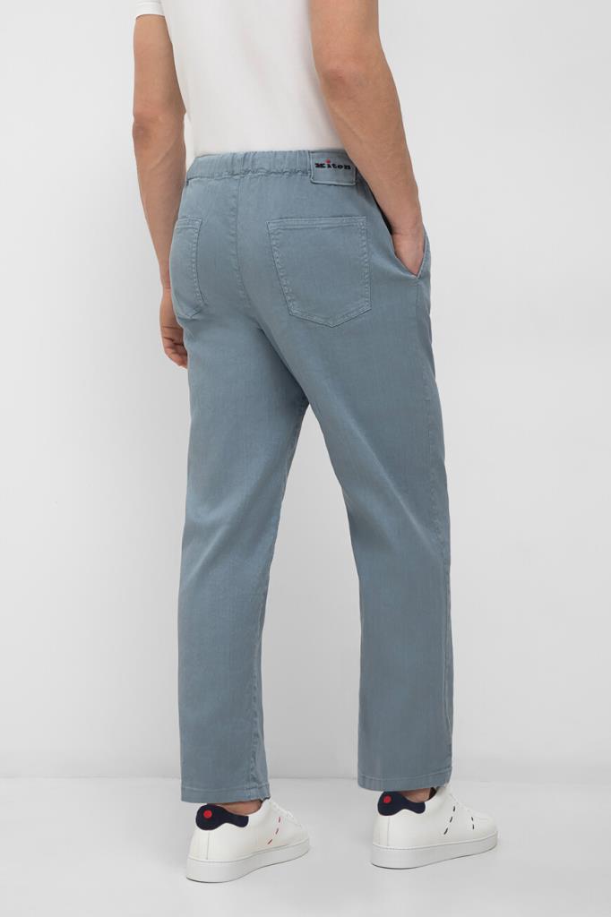 Брюки Kiton с плотным эластичным поясом на кулиске с брендированными эглетами. Для пошива изделия в спортивном стиле выбран мягкий трикотаж на основе хлопка стрейч и льна голубого оттенка. Модель прямого силуэта интересна наличием четырёх карманов и текстильного патча с вышитым чёрным логотипом Дома на поясе сзади.