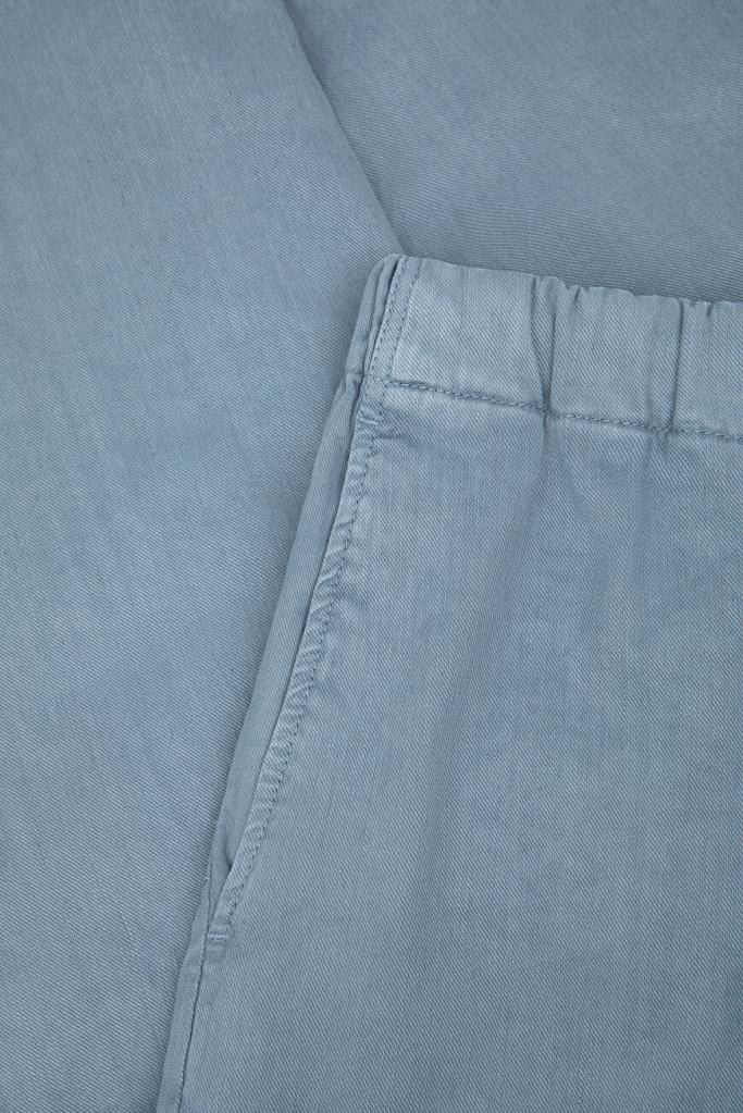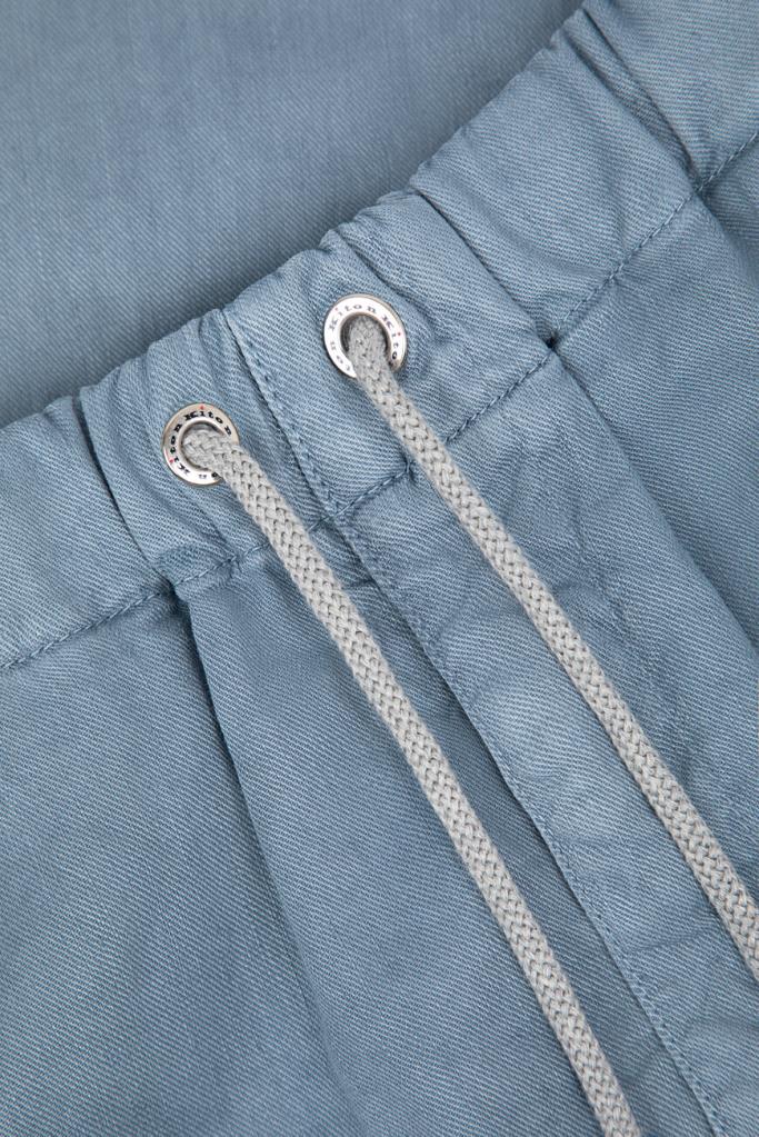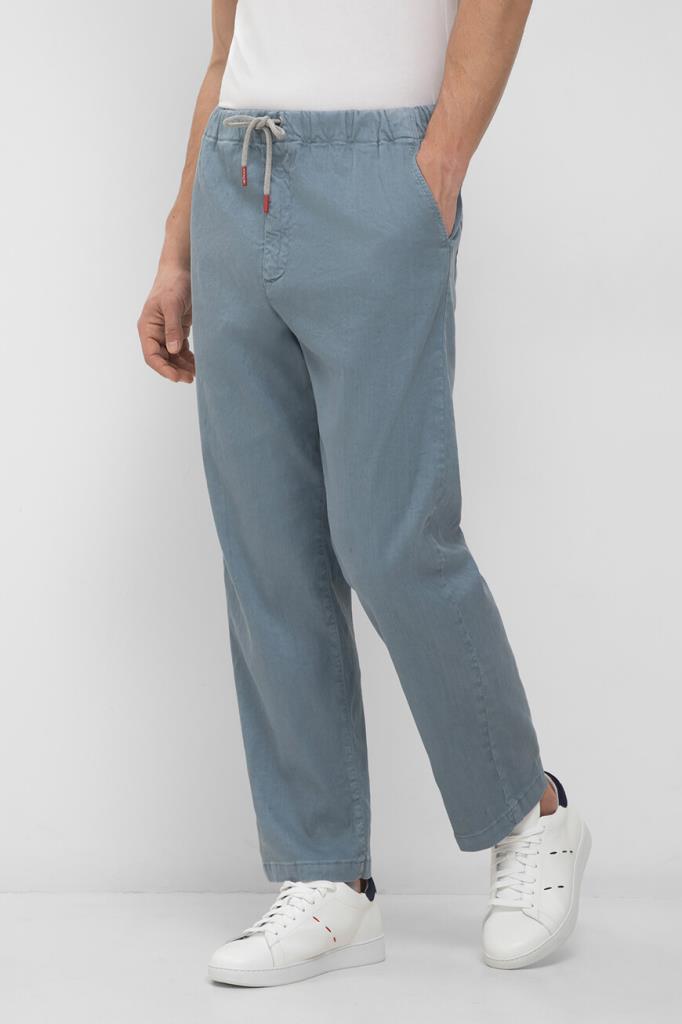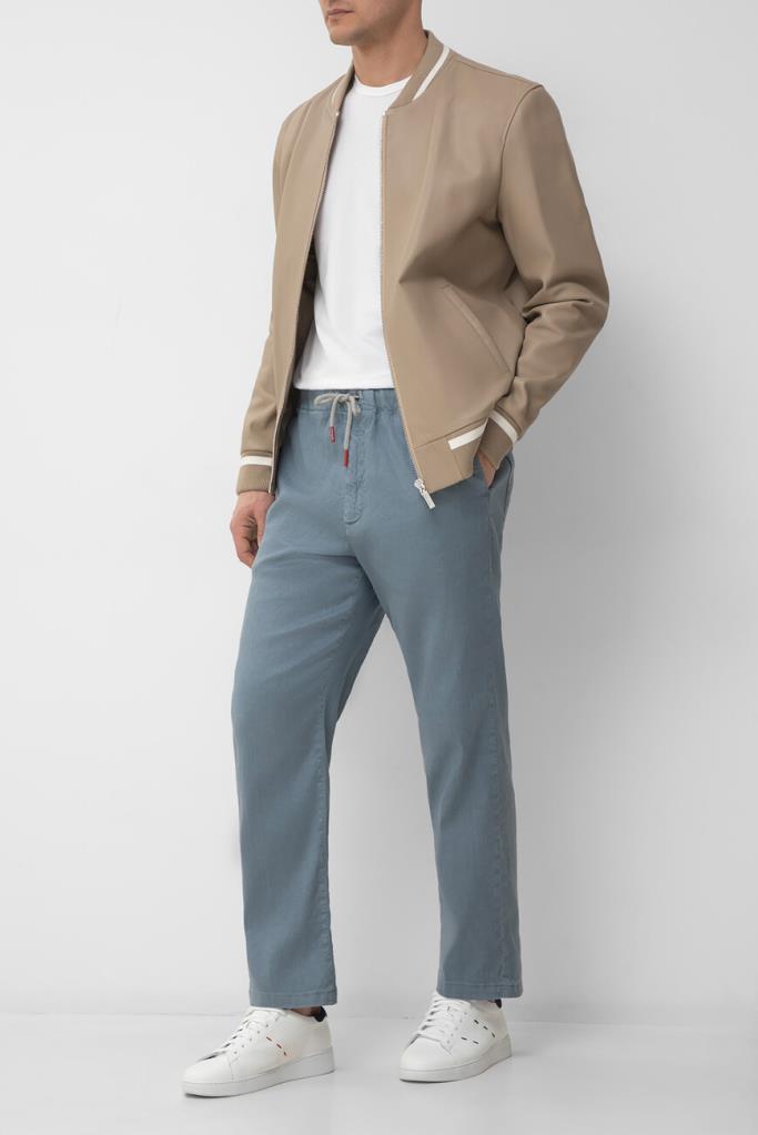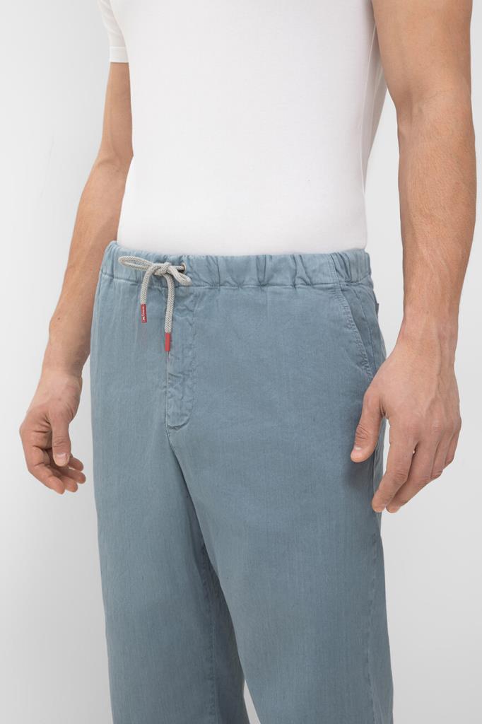 Брюки Kiton с плотным эластичным поясом на кулиске с брендированными эглетами. Для пошива изделия в спортивном стиле выбран мягкий трикотаж на основе хлопка стрейч и льна голубого оттенка. Модель прямого силуэта интересна наличием четырёх карманов и текстильного патча с вышитым чёрным логотипом Дома на поясе сзади.