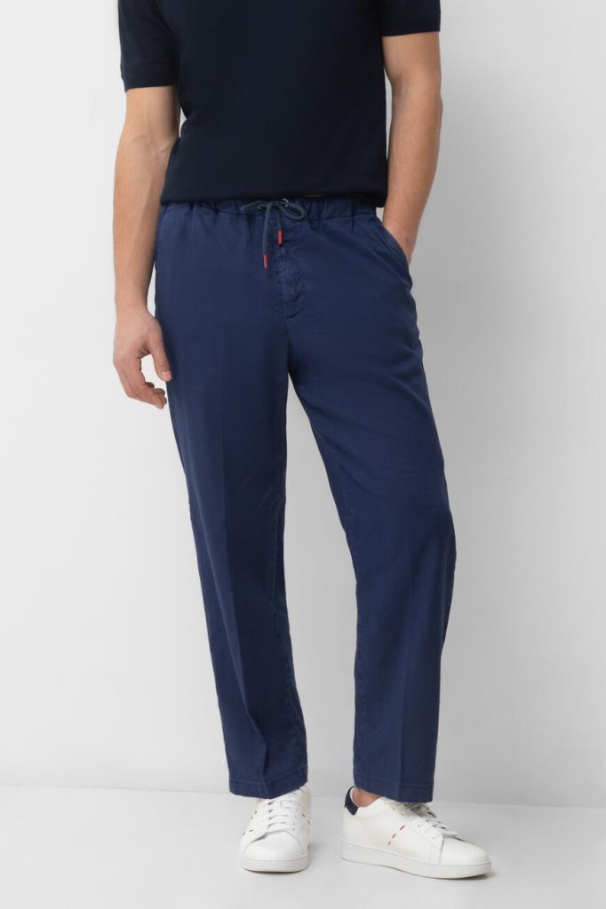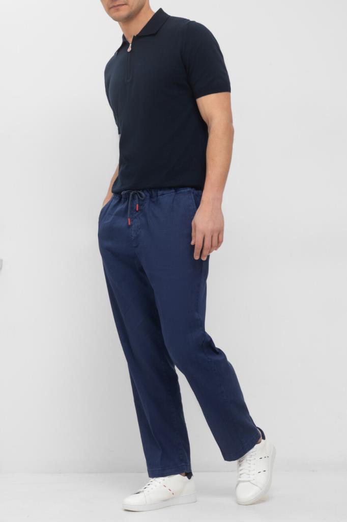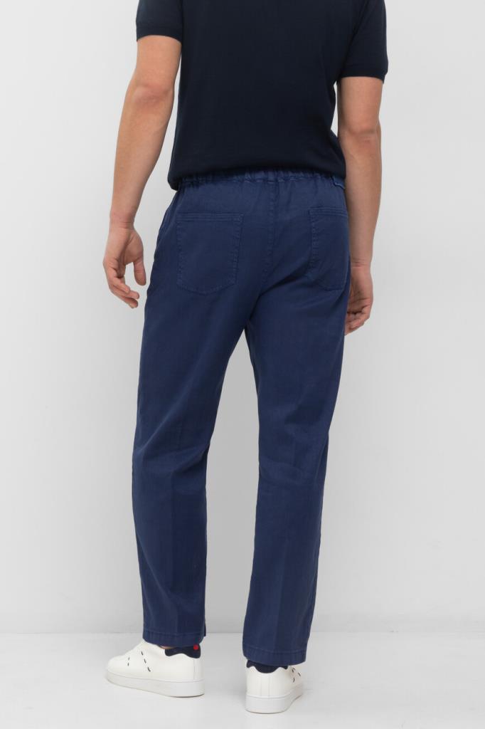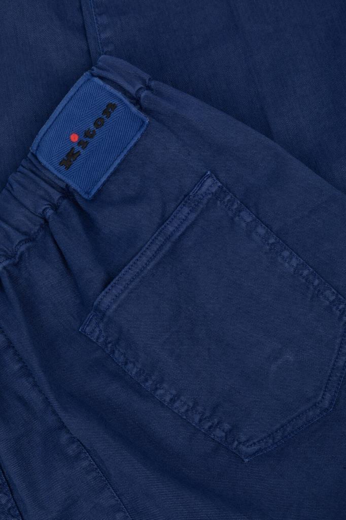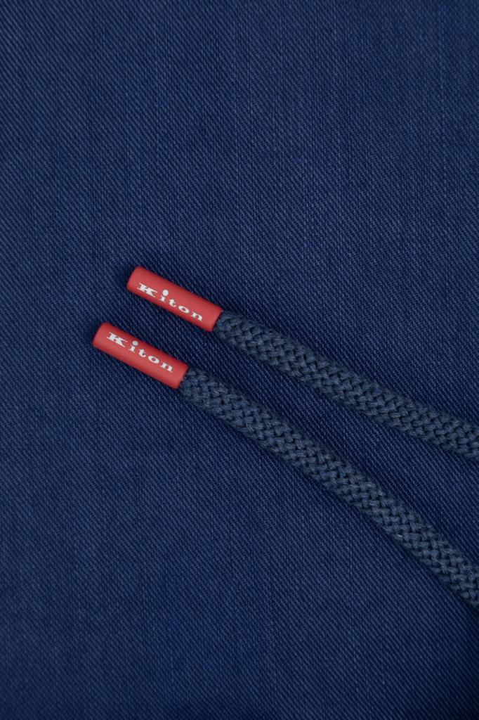 Тёмно-синие брюки Kiton в спортивном стиле. Модель изготовлена из смеси мягкого хлопка стрейч и льна с четырьмя карманами. Плотный эластичный пояс-кулиска обеспечивает оптимальную посадку изделия по фигуре. О принадлежности брюк с классическими стрелками Дому деликатно напоминает текстильный патч с вышитым чёрным логотипом.