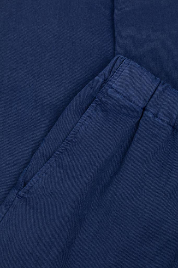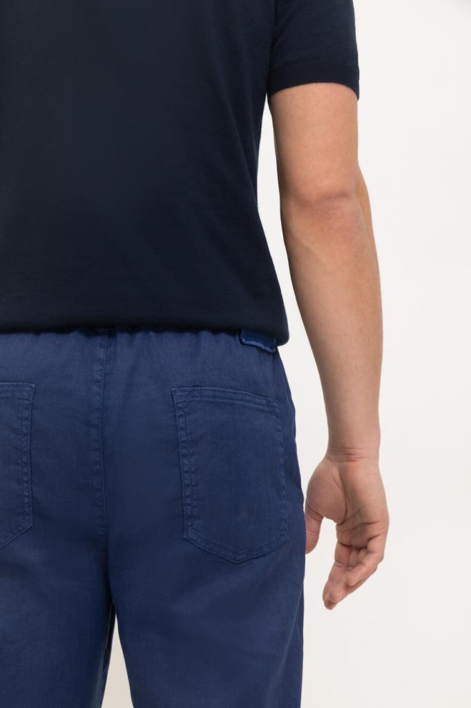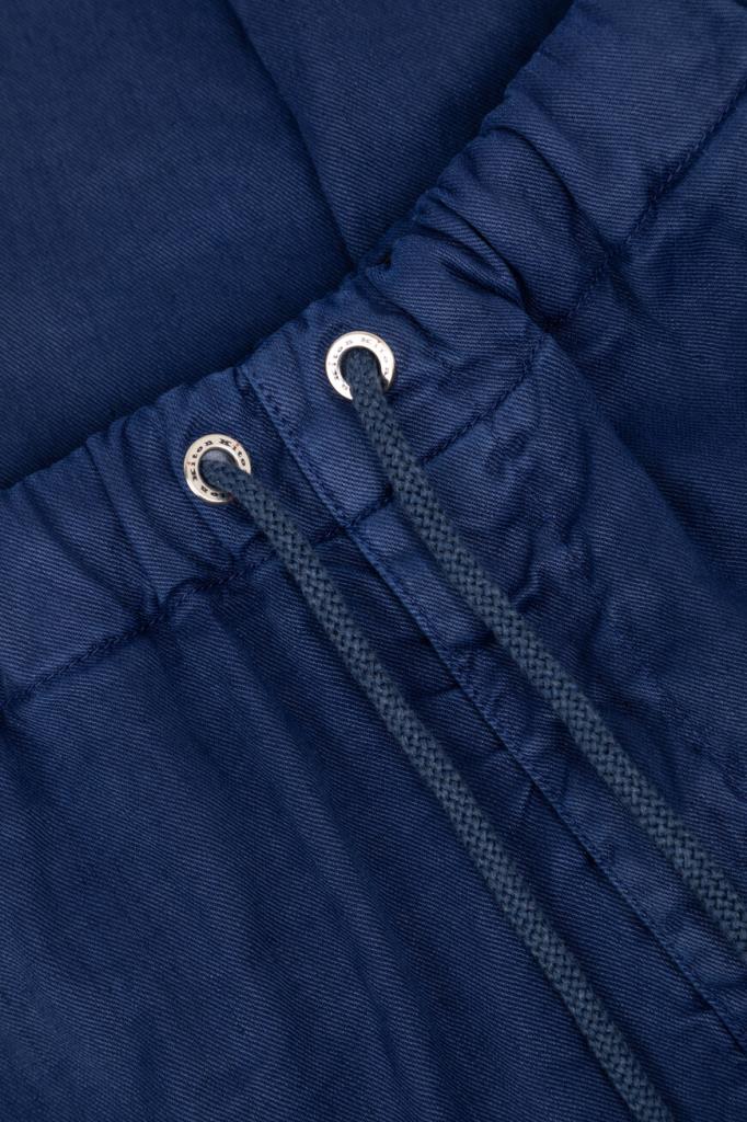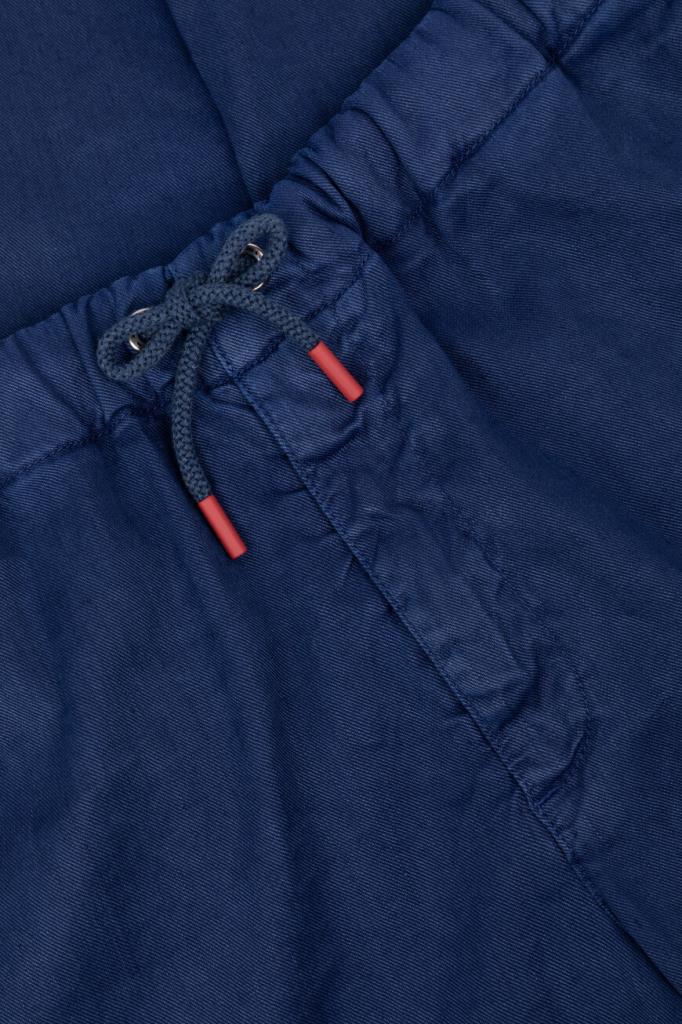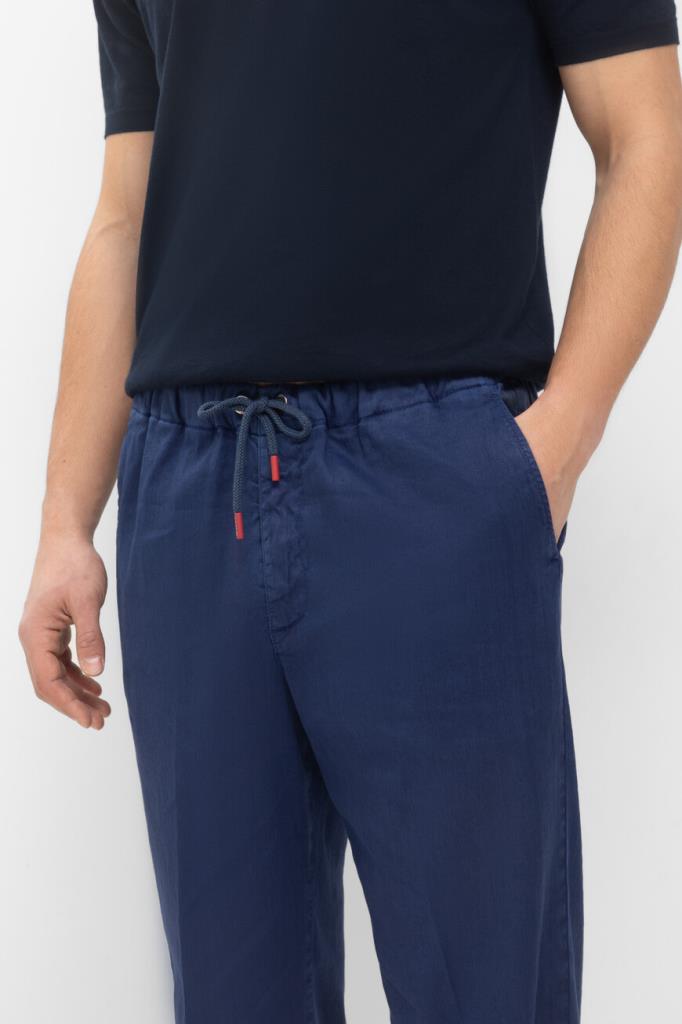 Тёмно-синие брюки Kiton в спортивном стиле. Модель изготовлена из смеси мягкого хлопка стрейч и льна с четырьмя карманами. Плотный эластичный пояс-кулиска обеспечивает оптимальную посадку изделия по фигуре. О принадлежности брюк с классическими стрелками Дому деликатно напоминает текстильный патч с вышитым чёрным логотипом.