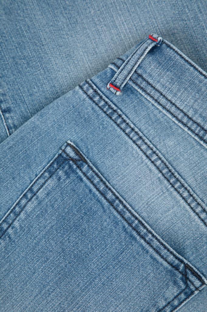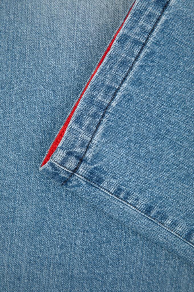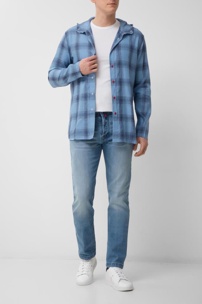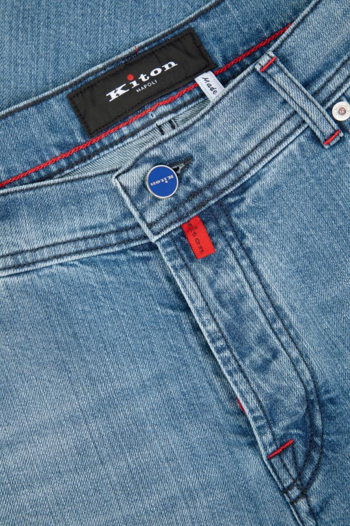 Светло-синие джинсы Kiton с пятью карманами. Для пошива изделия используется эластичный хлопковый деним с эффектом делаве и прострочкой на швах. Фасон повседневной модели характеризуется прямым кроем и застёжкой на брендированные эмалированные пуговицы с планкой. Отличительными деталями являются вышитая синяя надпись-лого на одной из шлевок и текстильная накладка с вышитым логотипом Дома на поясе сзади.