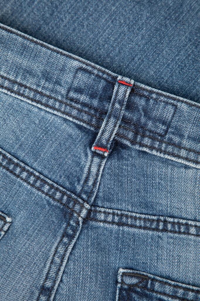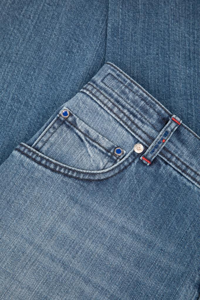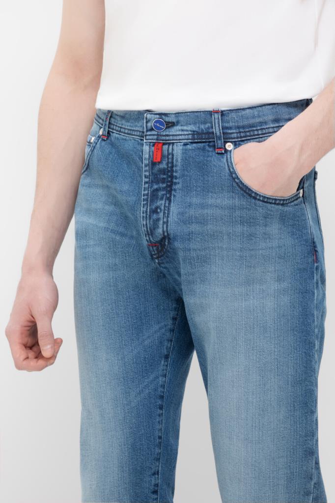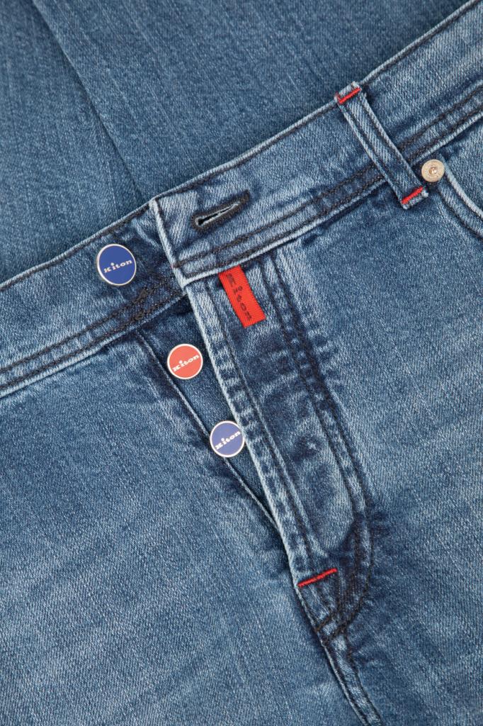 Прямые джинсы Kiton с минималистичной символикой Дома. Изделие сшито из мягкого денима на основе прочного премиального хлопка синего цвета с дизайнерскими потёртостями. Чтобы модель комфортно облегала фигуру и не деформировалась со временем, в состав материала добавлены тонкие эластановые волокна. Джинсы интересны прострочкой на швах, вышитой надписью-лого на одной из шлевок и текстильной накладкой с вышитым логотипом на поясе сзади.