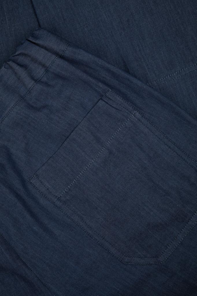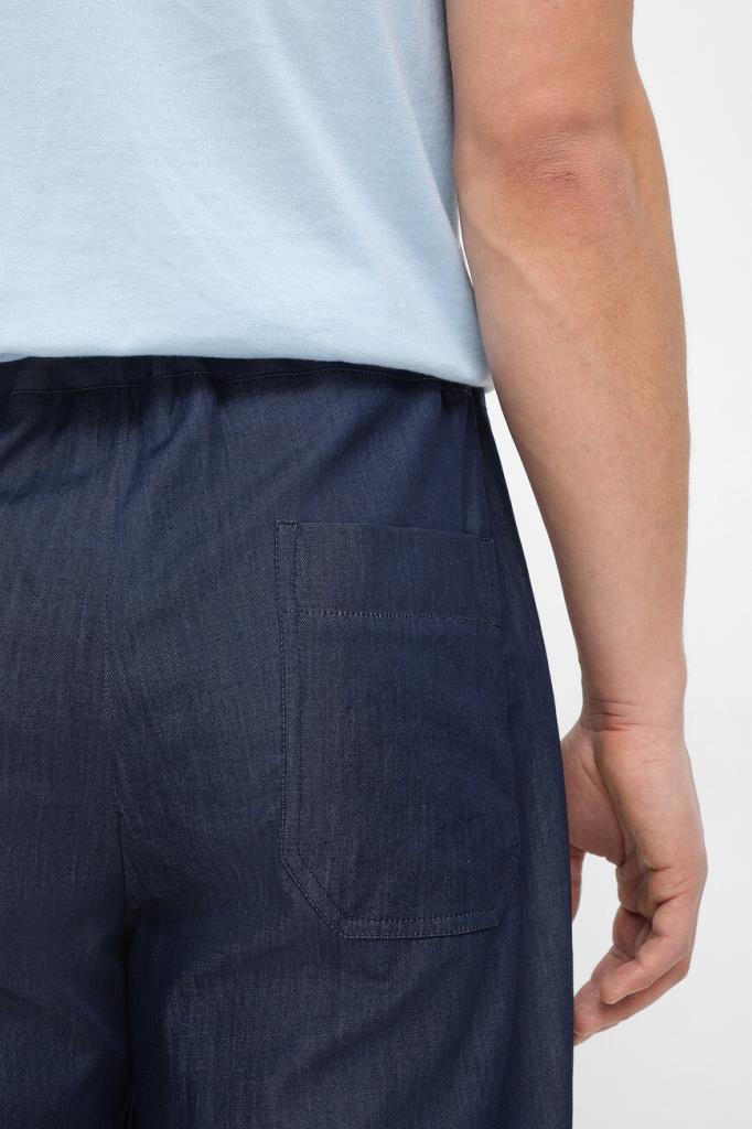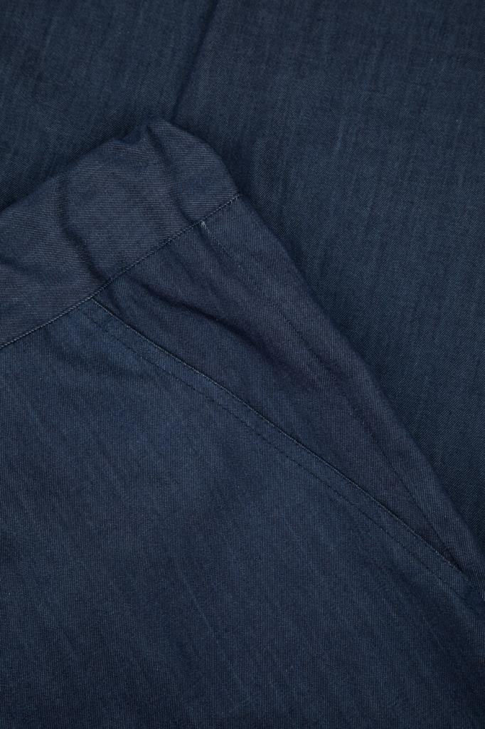 Хлопковые брюки Kiton на потайной молнии и перламутровой пуговице. Для создания изделия классической посадки выбрана плотная тёмно-синяя саржа. Дополнительную фиксацию обеспечивает плотный широкий пояс на кулиске с брендированными красными эглетами. Отличительной особенностью модели стало наличие четырёх крупных накладных карманов в стиле рабочей униформы.