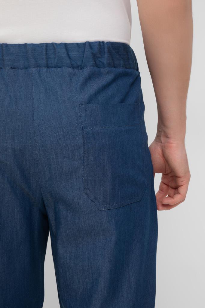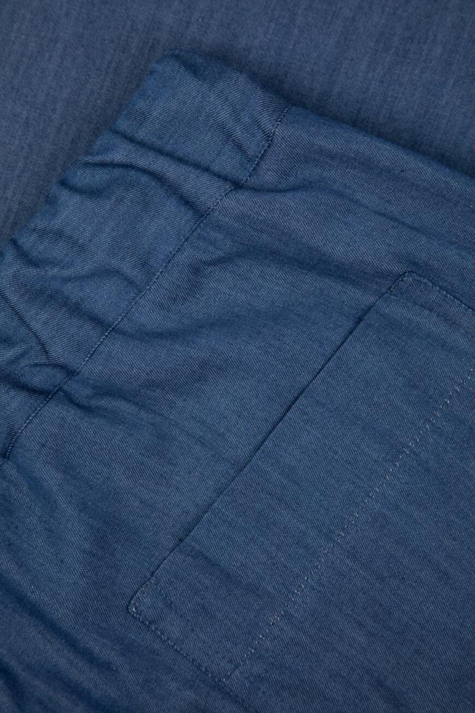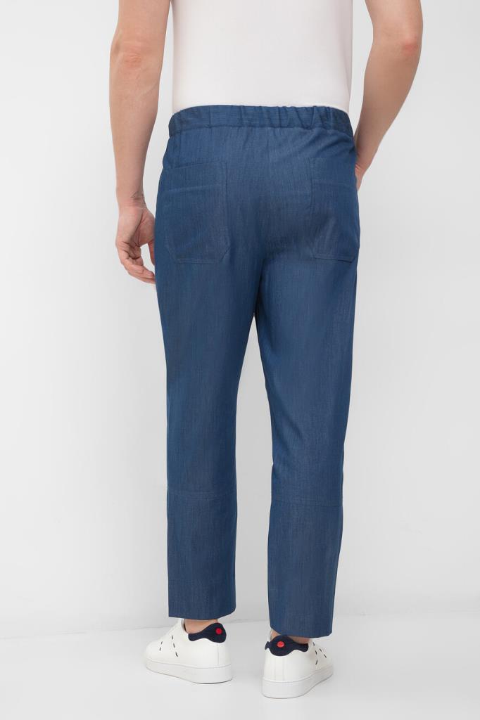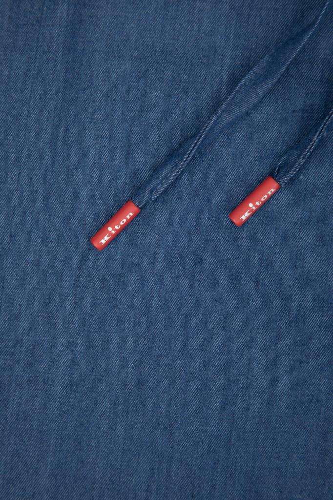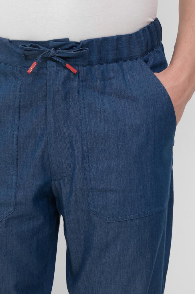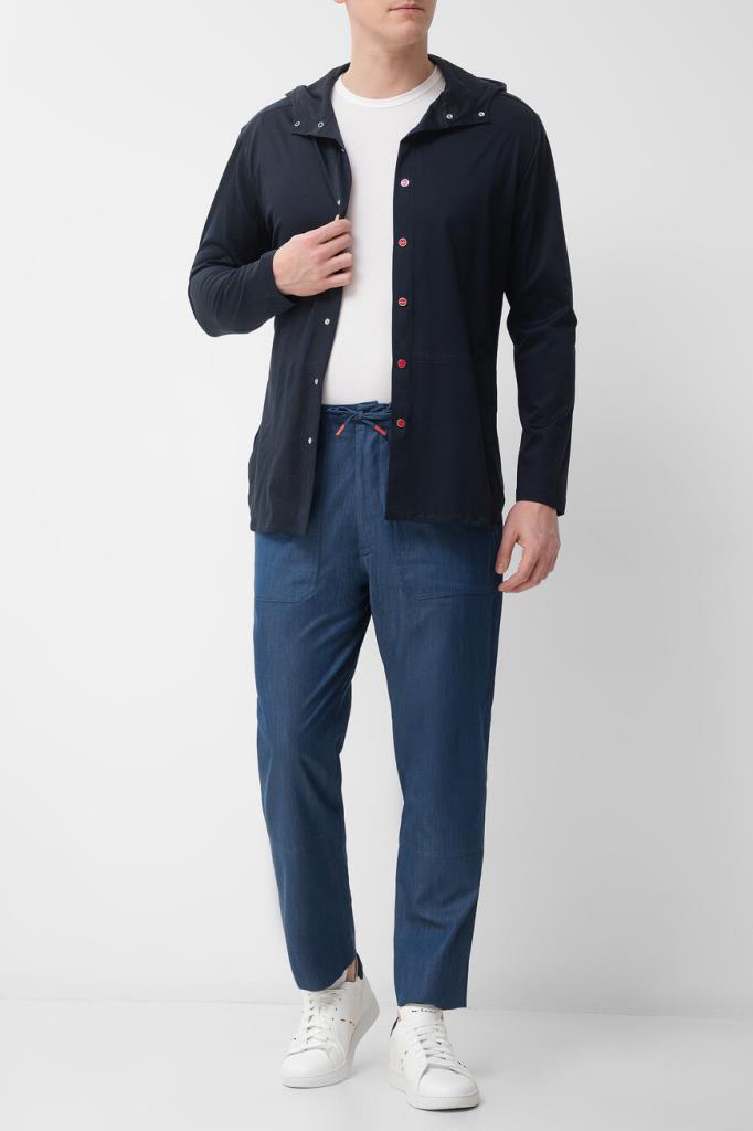 Брюки Kiton с четырьмя крупными накладными карманами в стиле рабочей униформы. Зауженная модель с классической посадкой выполнена из плотной хлопковой саржи. Акцентной деталью являются красные брендированные эглеты на шнуре, продетом в кулиску широкого пояса. Изделие синего цвета станет любимой базой непринуждённых повседневных комплектов.