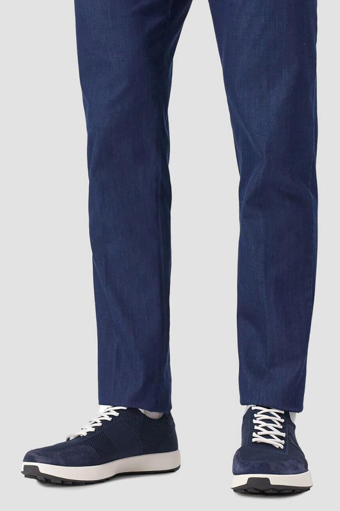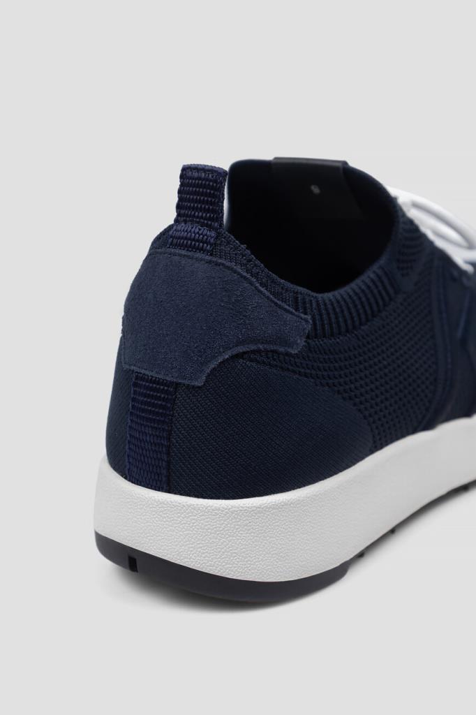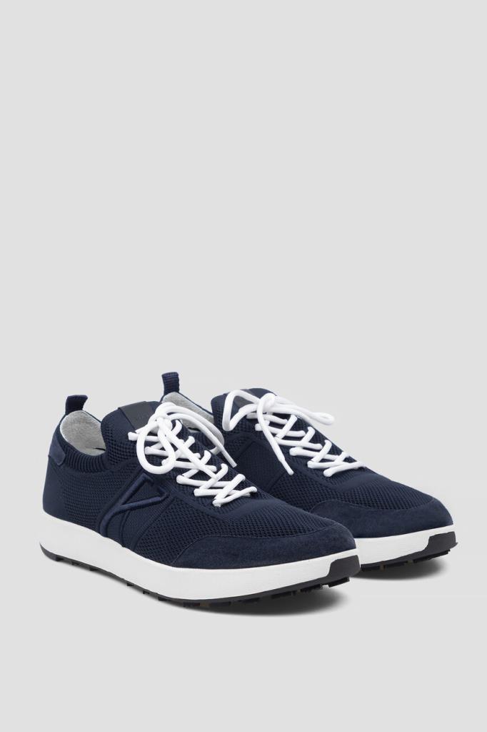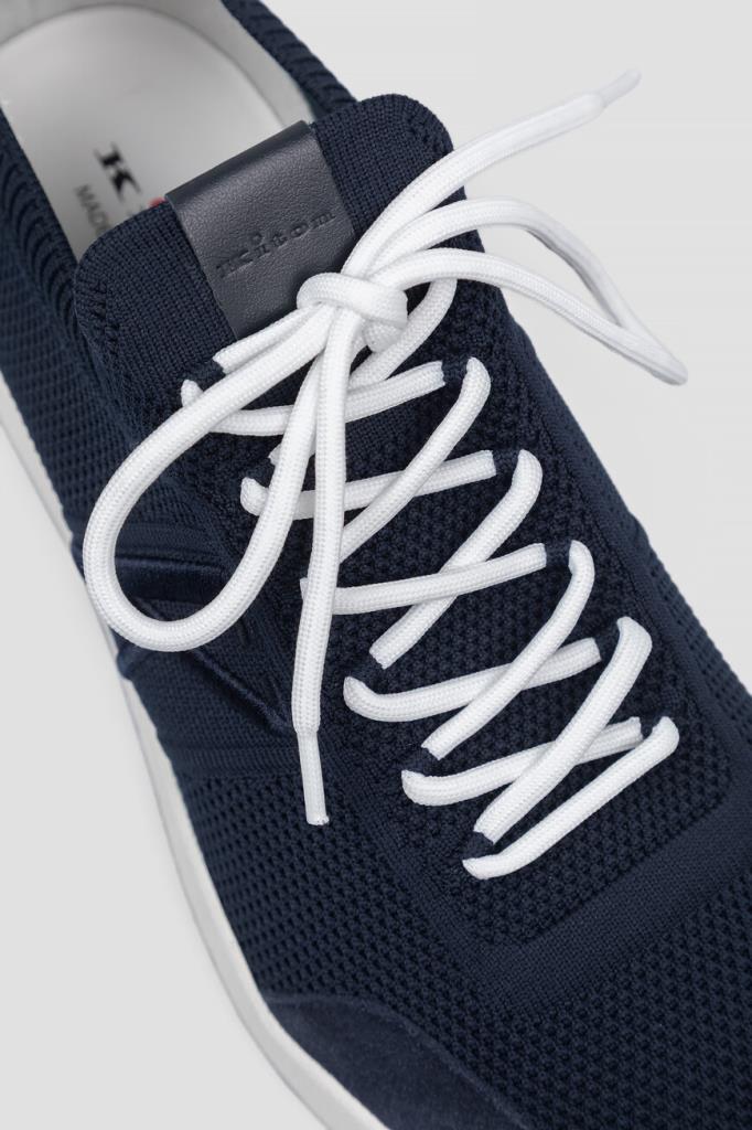 Комбинированные сникеры Kiton с разными текстурами. Основа модели тёмно-синего цвета изготовлена из сетчатого трикотажа на основе хлопка со вставками из бархатистой замши на носке и заднике в тон. Декором выступают вышитая знаковая литера «K» на боковинах и кожаный патч с тиснёным логотипом на язычке.