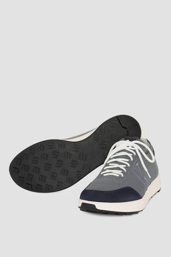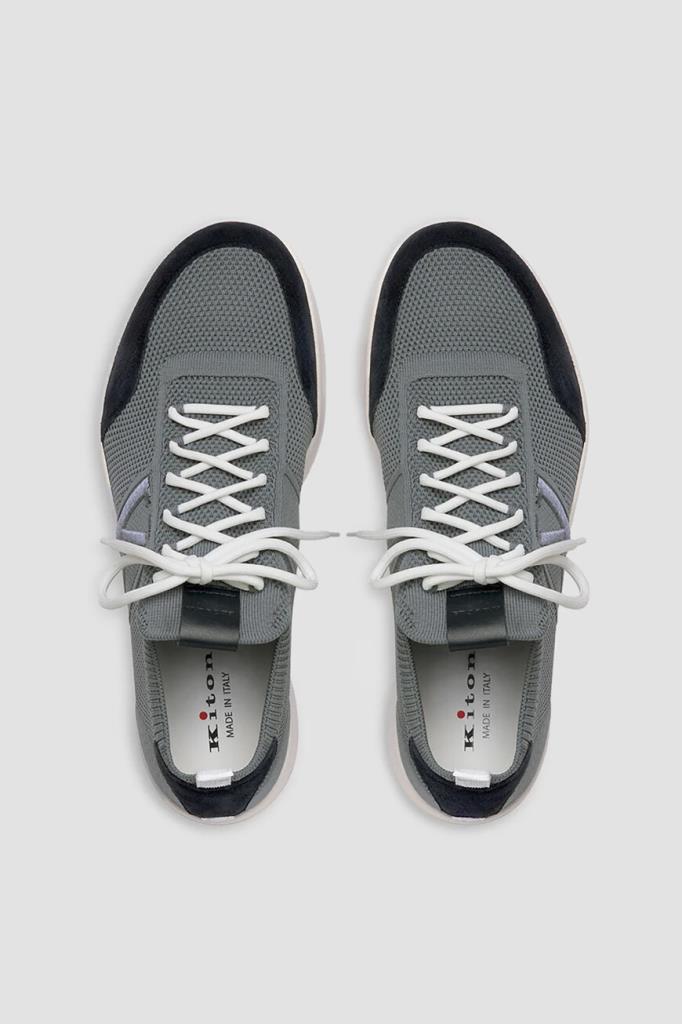 Сникеры из спортивного хлопкового текстиля от бренда Kiton. Модель серого цвета с широкой колодкой и разными текстурами оснащена вставками из бархатистой тёмно-синей замши на носке и в задней части. Принадлежность удобной пары Дому обозначена вышитой знаковой литерой «K» в тон на боковинах и кожаным патчем с тиснёным логотипом на язычке. Особенностями изделия выступают верх, подобранный на резинку, и двухслойная подошва из прочного полимера с протектором для дополнительной устойчивости.