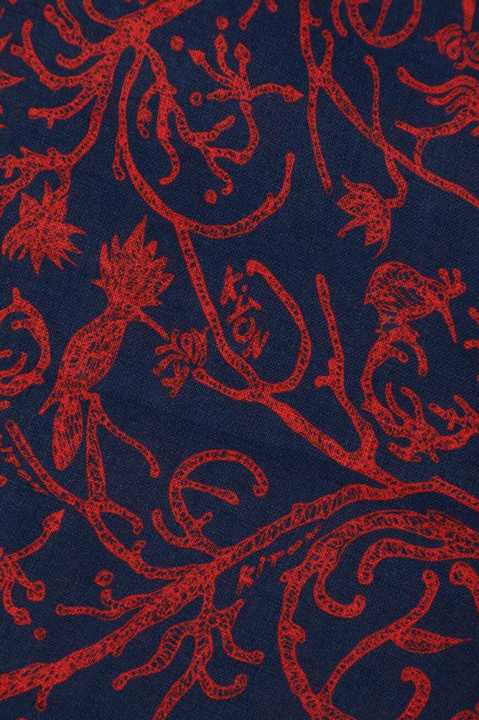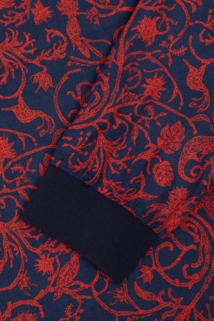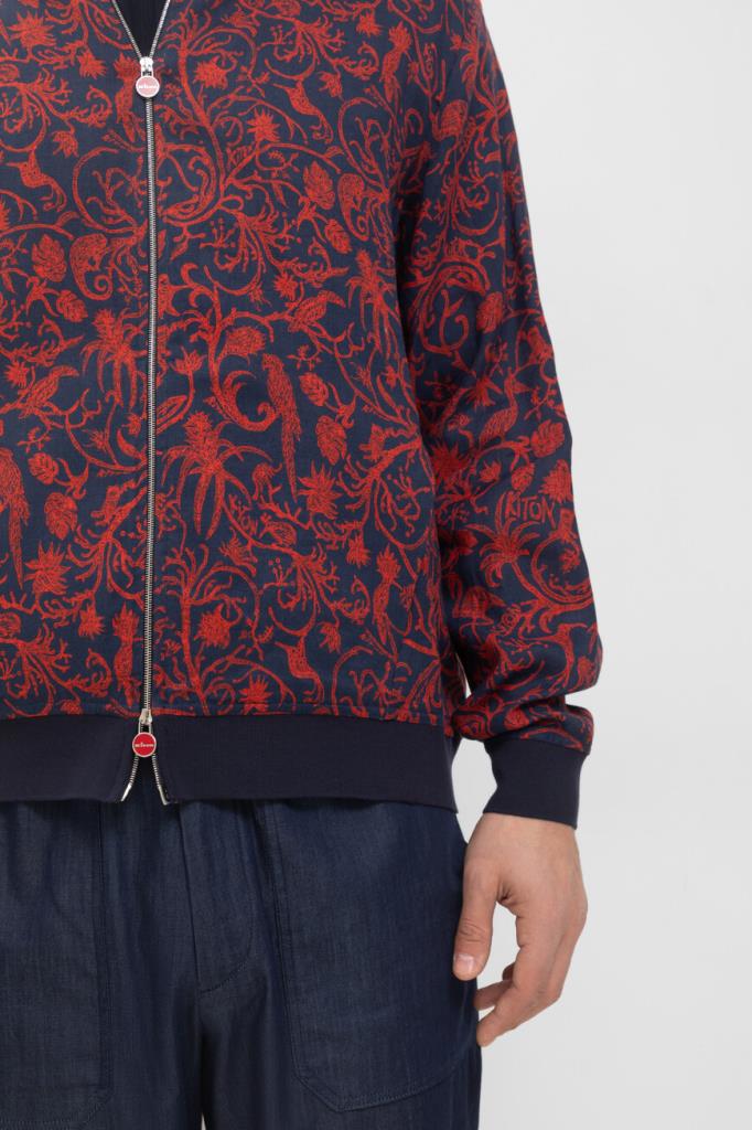 Принтованный блузон Kiton в красно-синей гамме. Фасон изделия из лёгкого мягкого льна характеризуется наличием невысокого воротника-стойки и застёжкой на встречную молнию с двумя брендированными пуллерами. Лубяные волокна обладают терморегулирующими свойствами, поэтому бомбер обеспечивает оптимальный микроклимат. Сложный процесс создания каждой куртки состоит из множества операций, большая часть которых выполняется вручную. Поверхность модели прямого силуэта покрыта растительным мотивом, дополненным изображениями экзотических птиц и животных. Однотонные трикотажные манжеты рукавов и широкий пояс оформлены резинкой для оптимальной посадки.