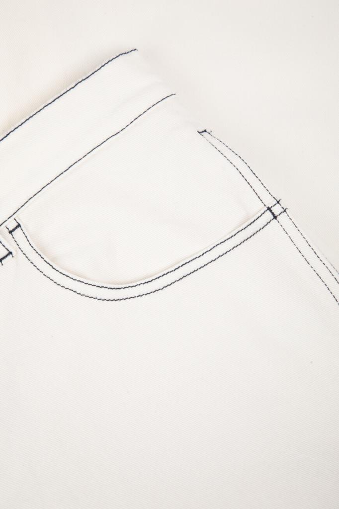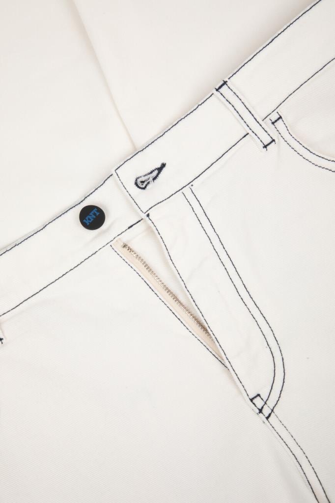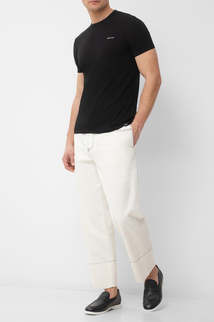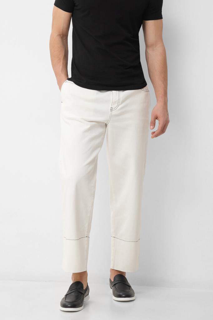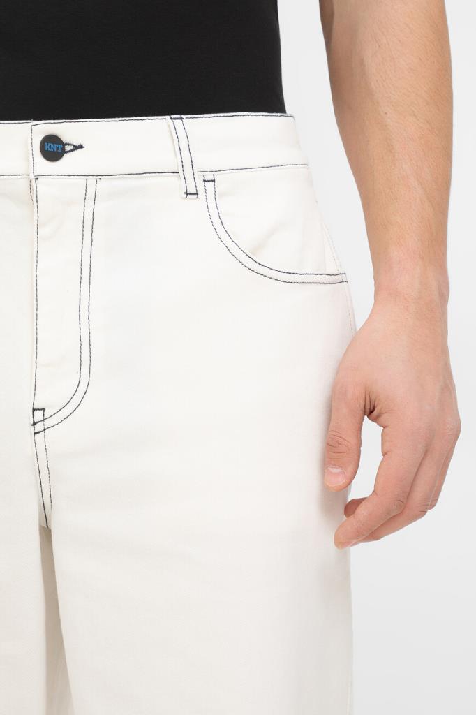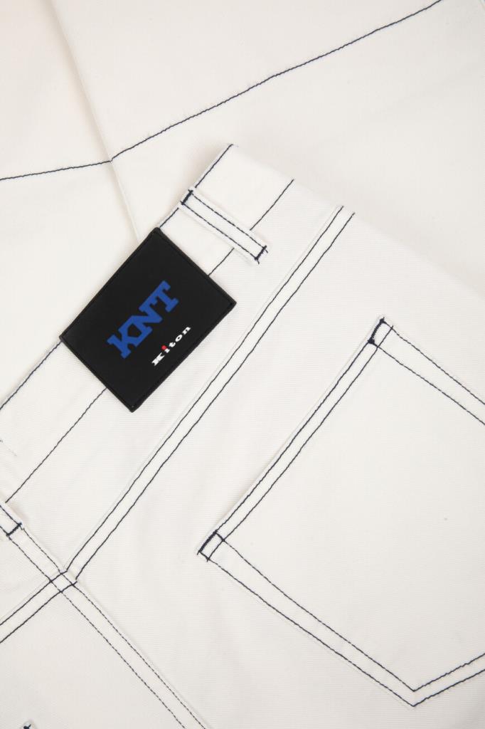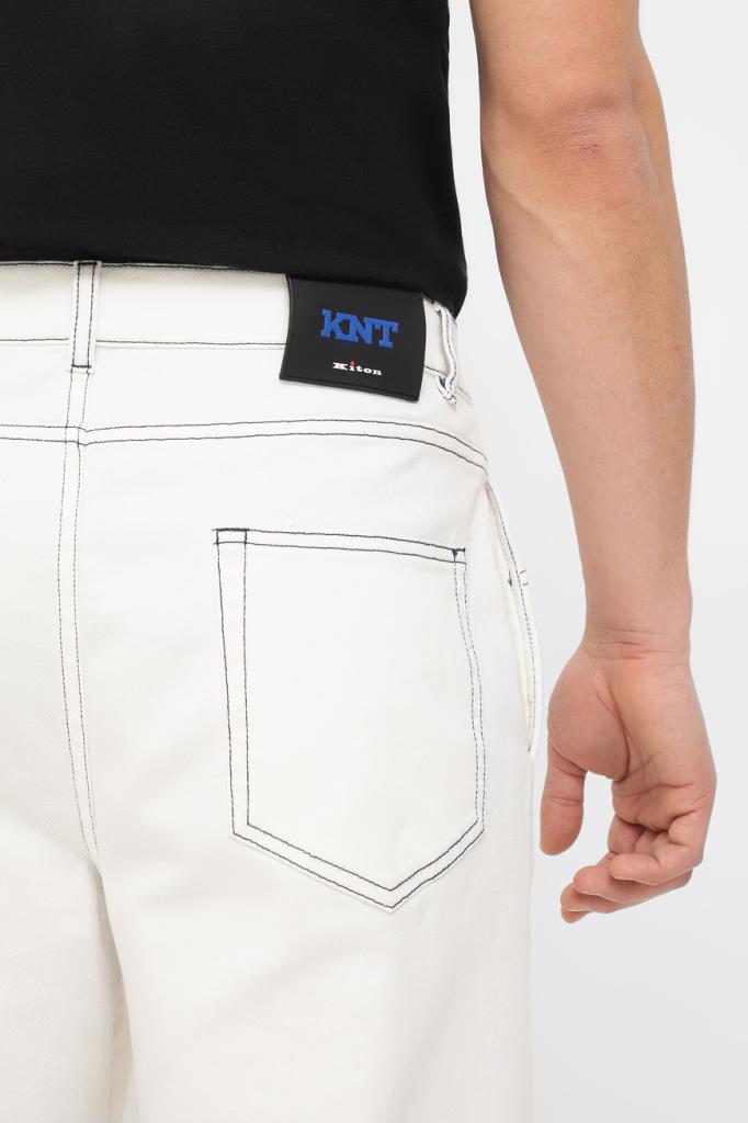 Широкие джинсы Kiton с заниженной линией шагового шва. Изделие выполнено из мягкого хлопкового денима белого цвета с добавлением стрейчевых волокон. Особенностями модели из коллекции KNT стали контрастная прострочка на швах, брендированный прямоугольный патч на поясе сзади и очерченные манжеты. Джинсы с пятью карманами станут основой мужских casual-комплектов.
