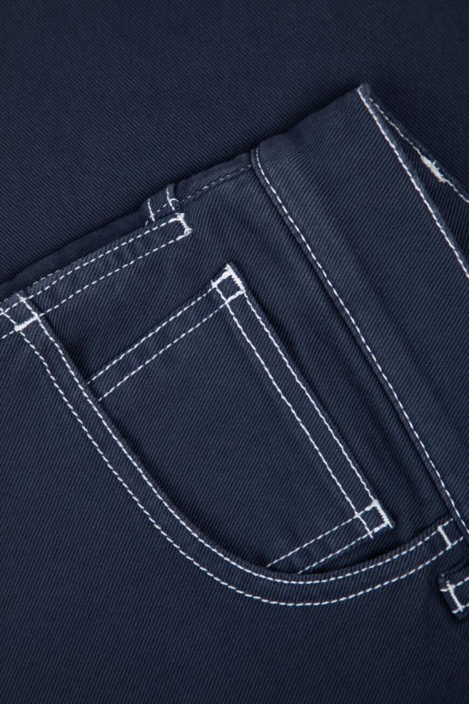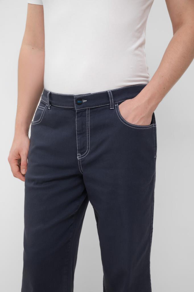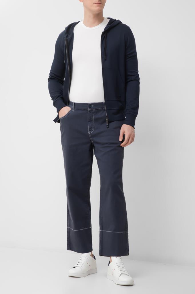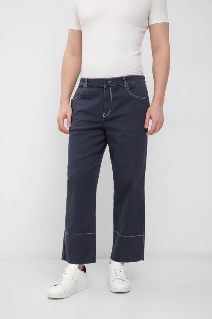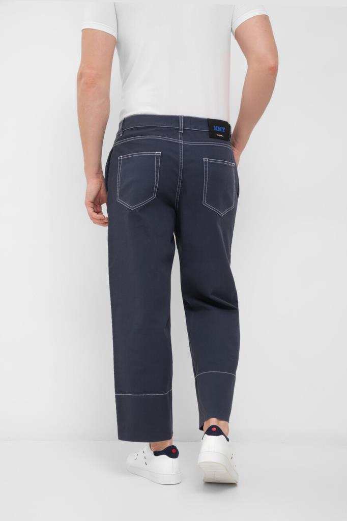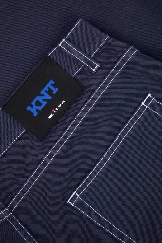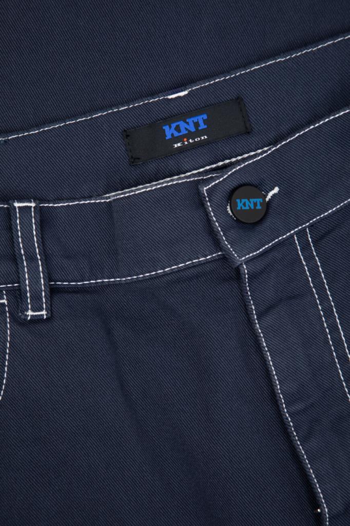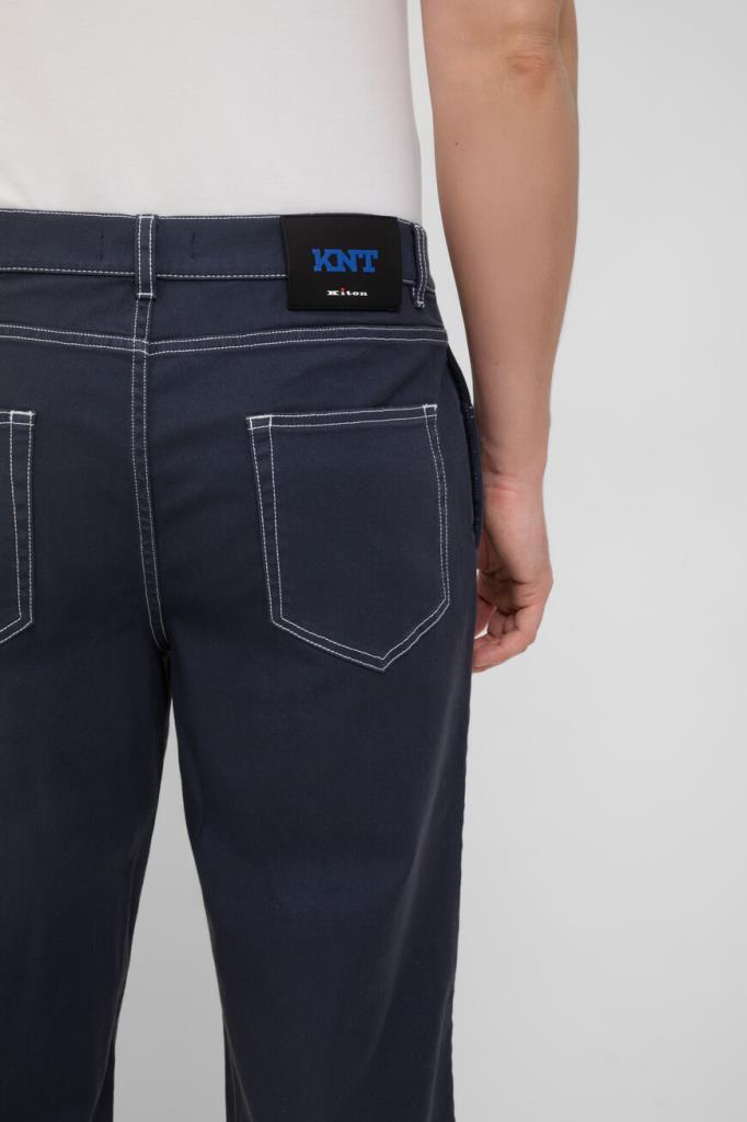Тёмно-синие джинсы Kiton входят в коллекцию городской одежды «KNT». Для изготовления изделия широкого силуэта используется эластичный хлопковый деним. С белой прострочкой на швах контрастирует прорезиненный патч с синей надписью-названием коллекции и белым логотипом на поясе сзади. Надёжную посадку модели по линии талии обеспечивает застёжка на потайную молнию и брендированную матовую пуговицу.