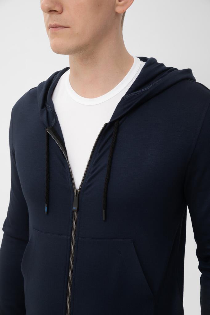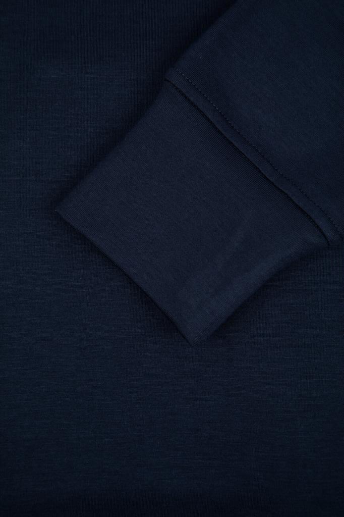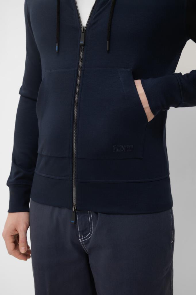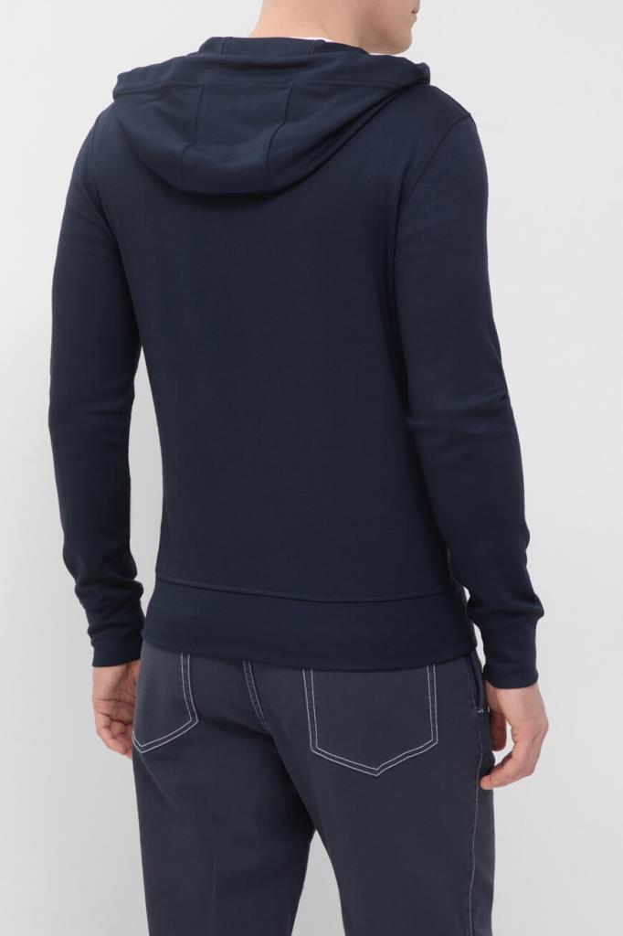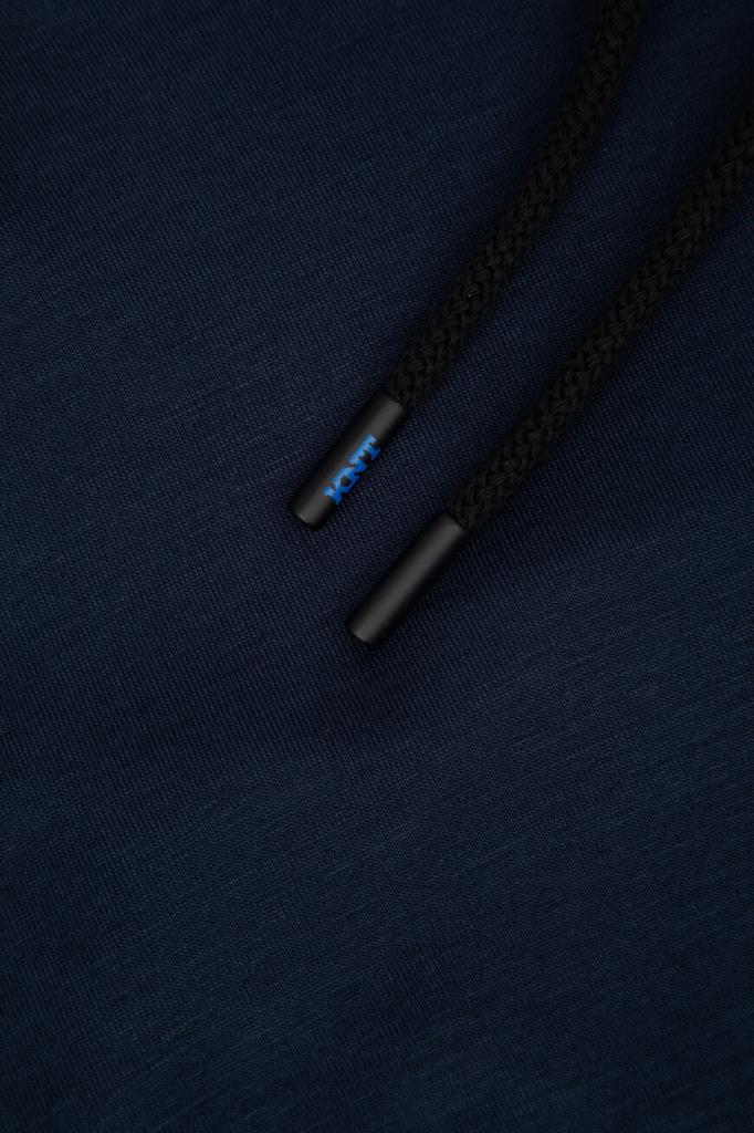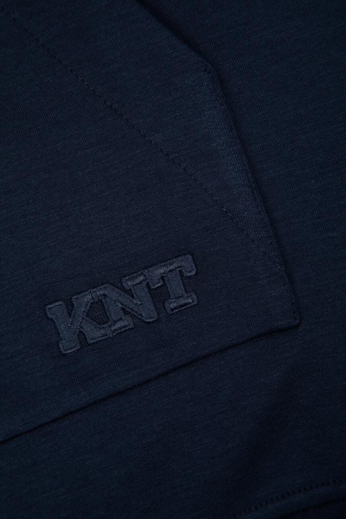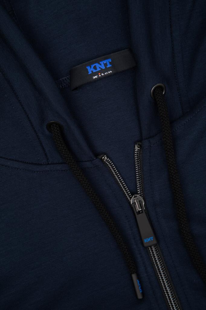 Трикотажная толстовка тёмно-синего цвета от бренда Kiton. Спортивная модель из эластичного вискозного волокна входит в коллекцию городской одежды KNT и застёгивается на встречную молнию с двумя брендированными пуллерами. Манжеты рукавов и пояс дополнены рельефным кантом вдоль верхнего края. Атрибутом Дома является рельефная знаковая символика - вышитая аббревиатура «KNT» на крупном накладном кармане слева.