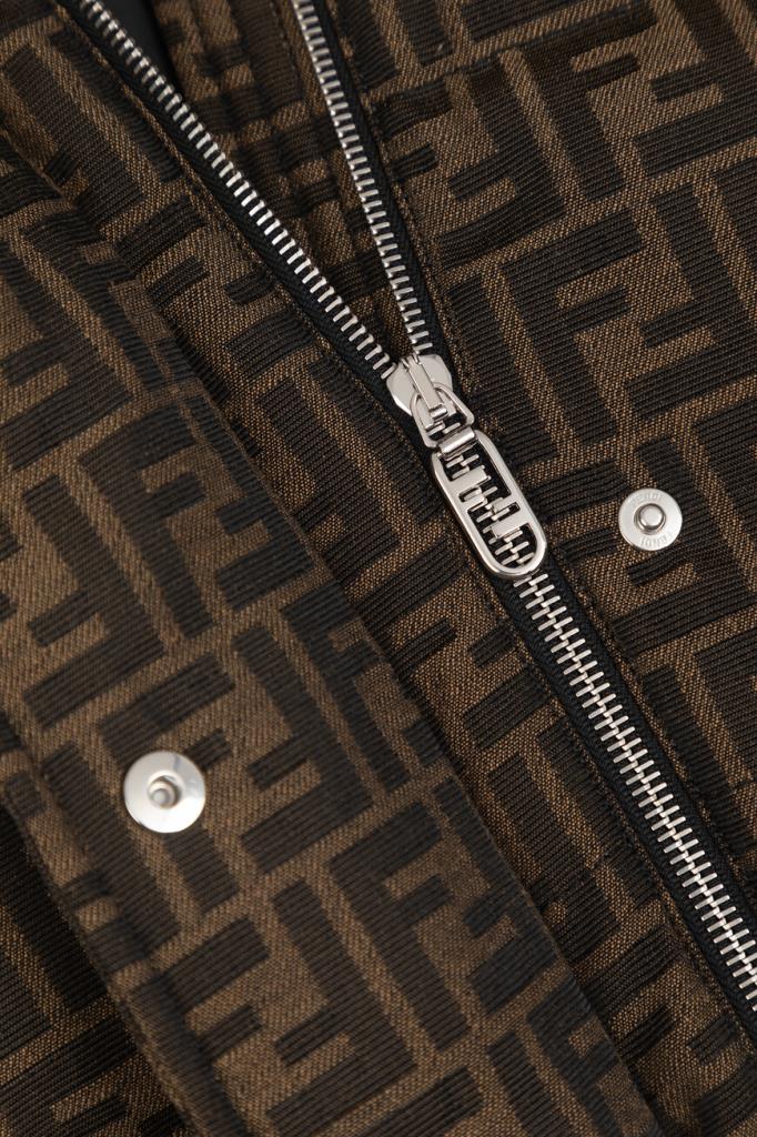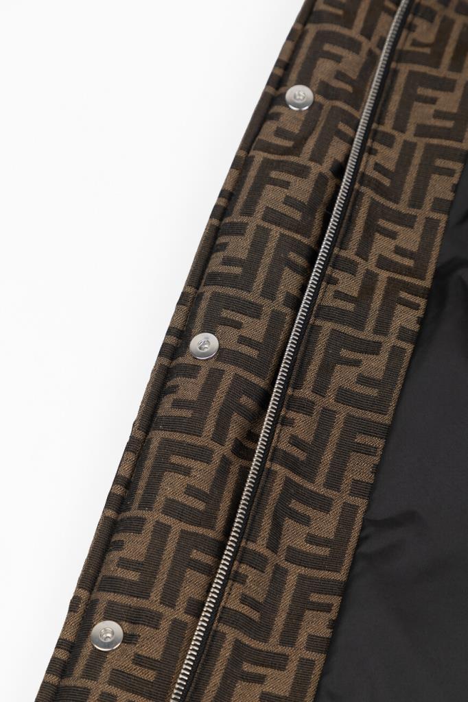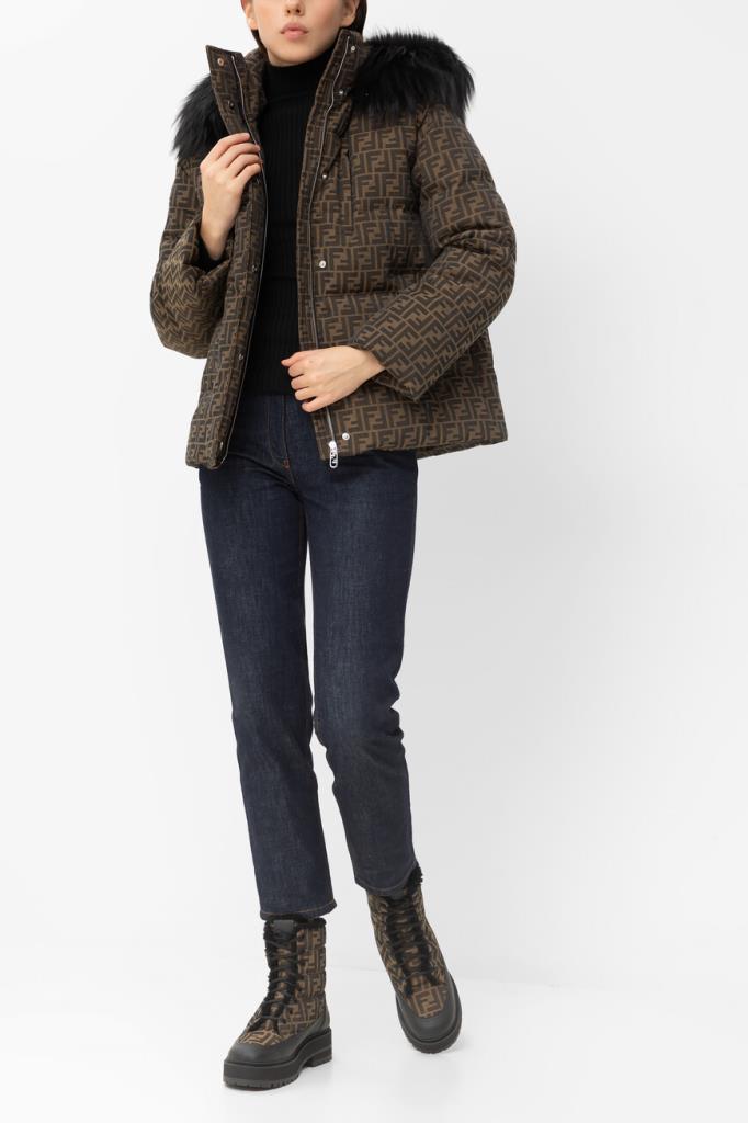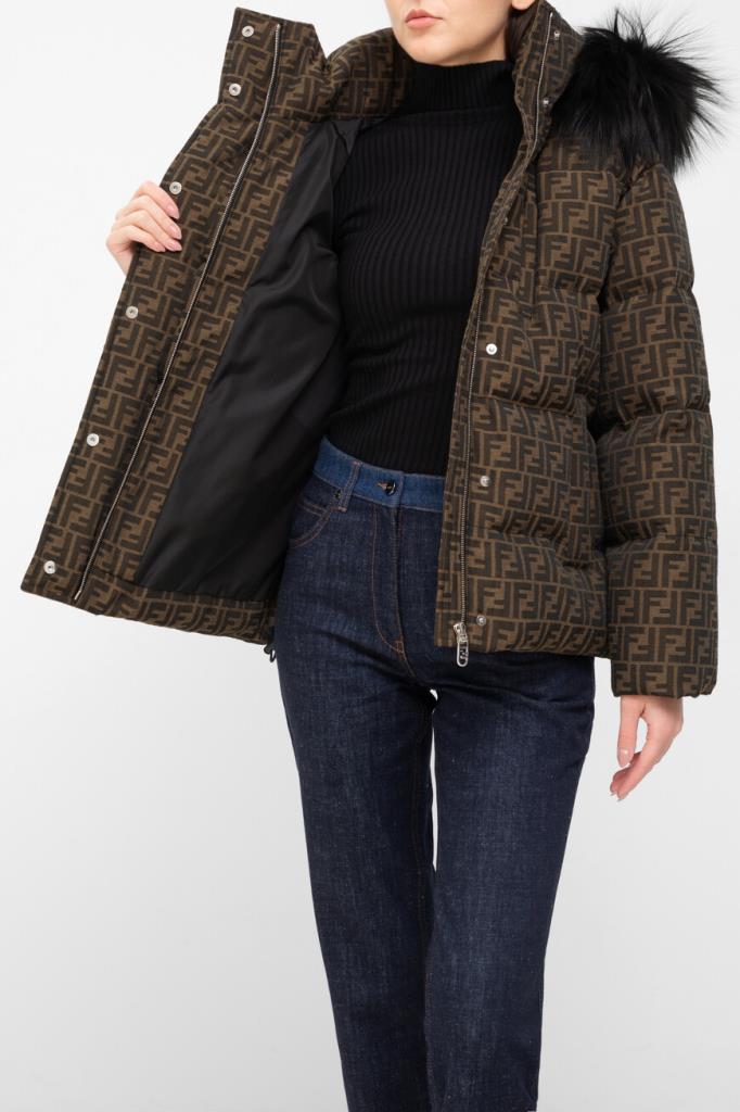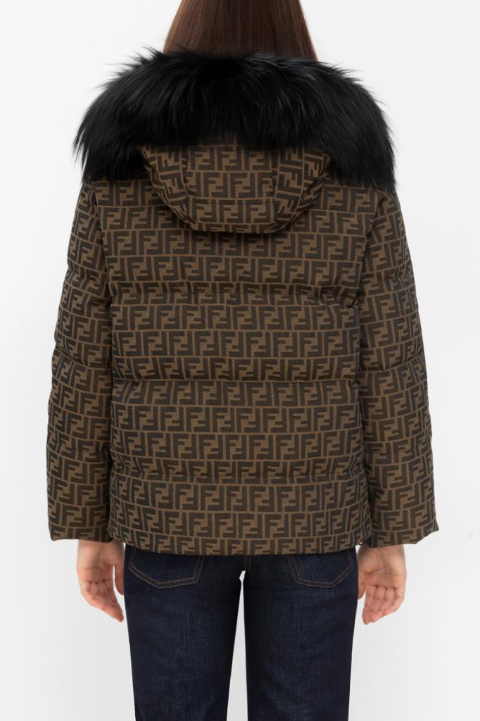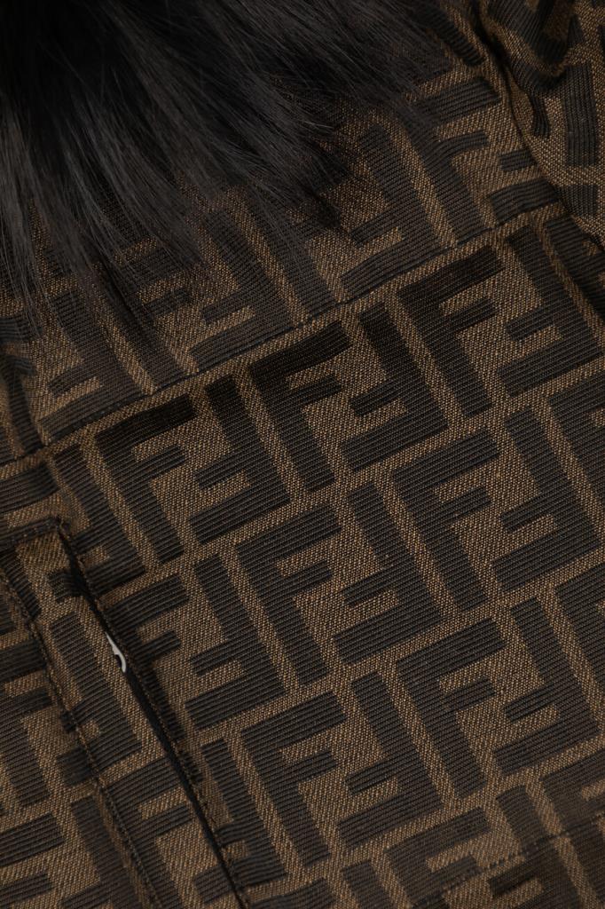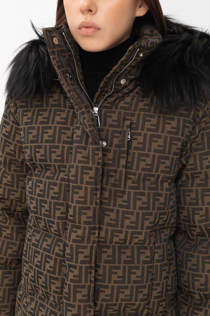 Брендированная лыжная куртка коричневого оттенка от бренда Fendi. Стёганая модель изготовлена из утеплённой холщовой ткани на основе хлопка и полиэфира с культовым мотивом «FF». Глубокий отстёгивающийся капюшон оторочен мягким мехом песца. Изделие прямого силуэта оснащено застёжкой на потайную молнию и клёпки с планкой и дополнено наполнителем на основе натурального утиного пуха и пера.