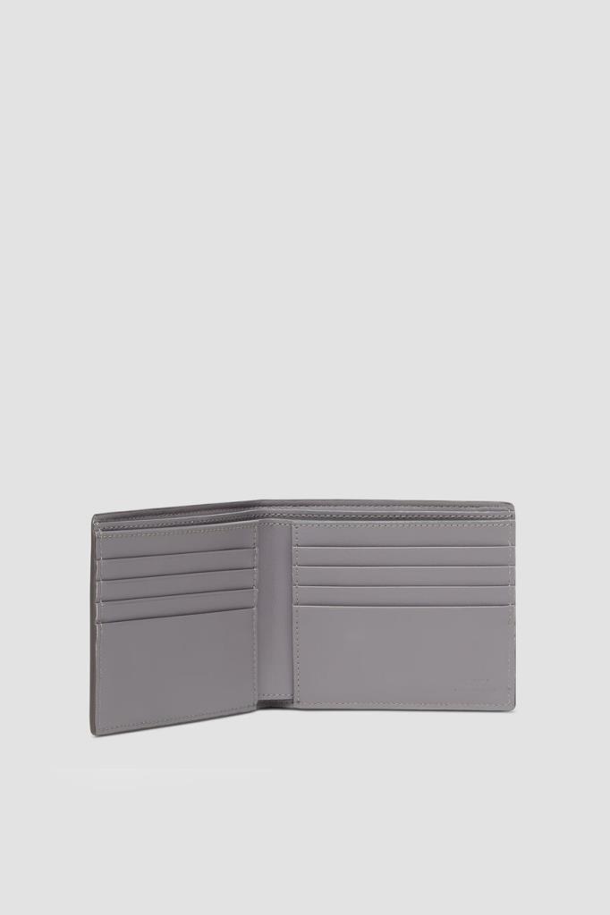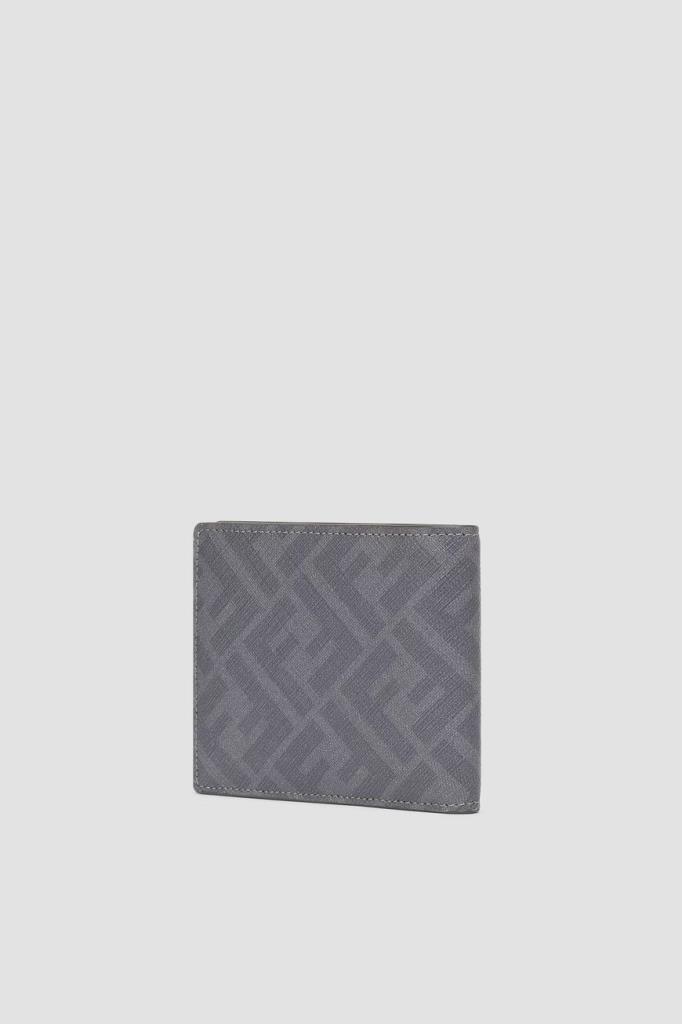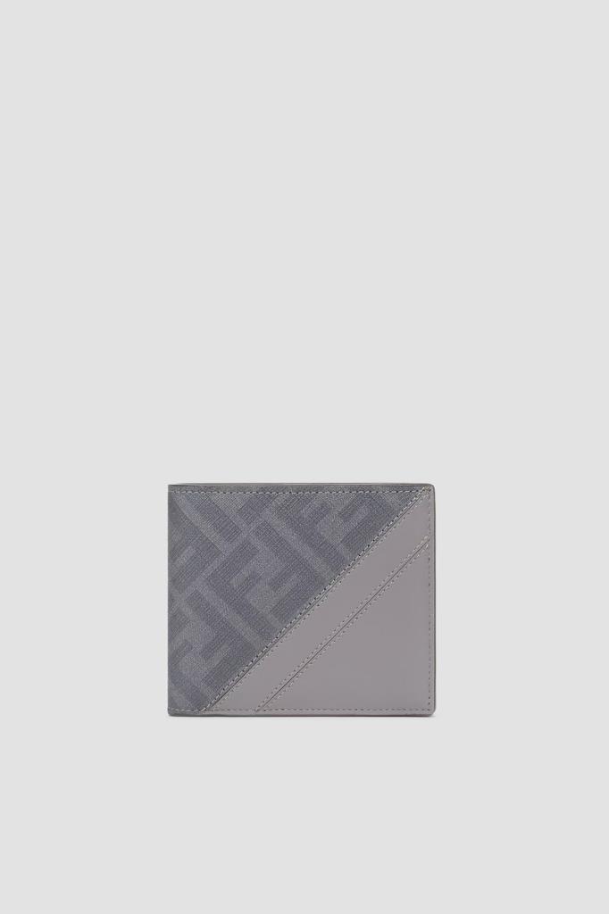 Кошелёк Fendi Diagonal выполнен в два сложения. Для изготовления компактного аксессуара используются плотный канвас с крупным геометрическим мотивом «FF» в серых тонах и гладкая телячья кожа. Комбинированная модель оснащена восьмью слотами для пластиковых карт, двумя дополнительными внутренними карманами для чеков и двумя плоскими отделениями сверху для банкнот.