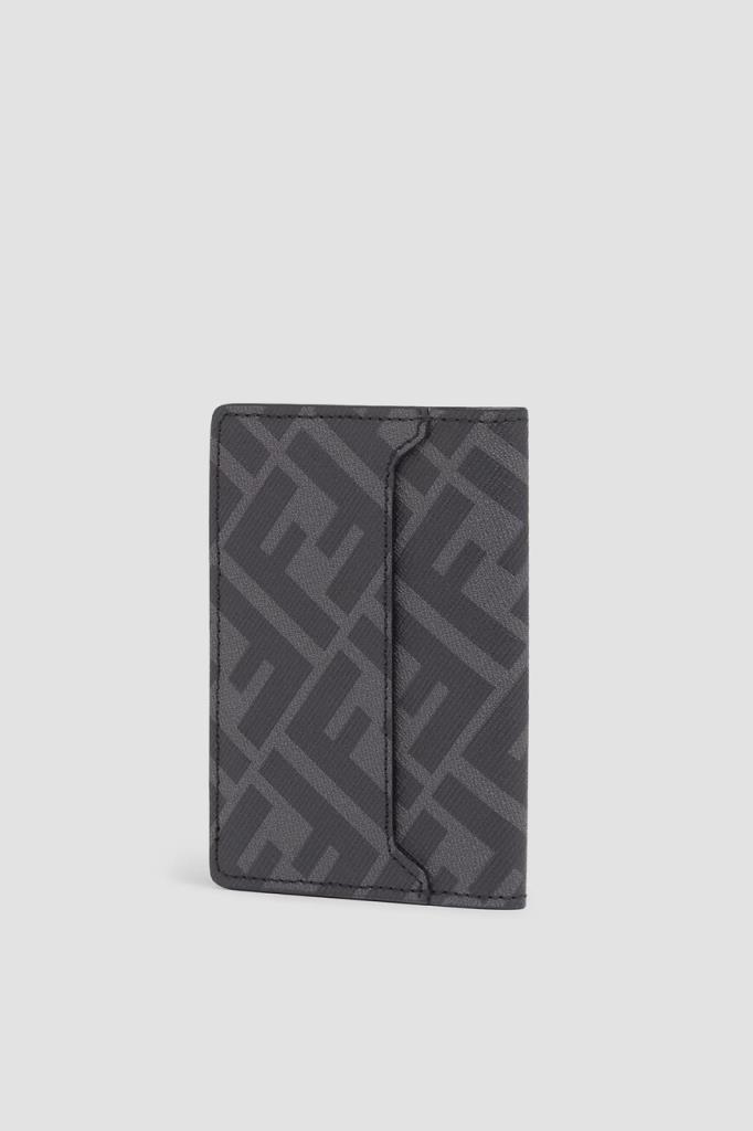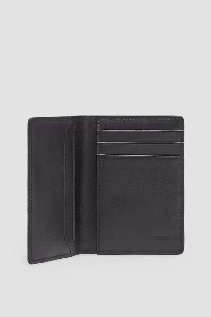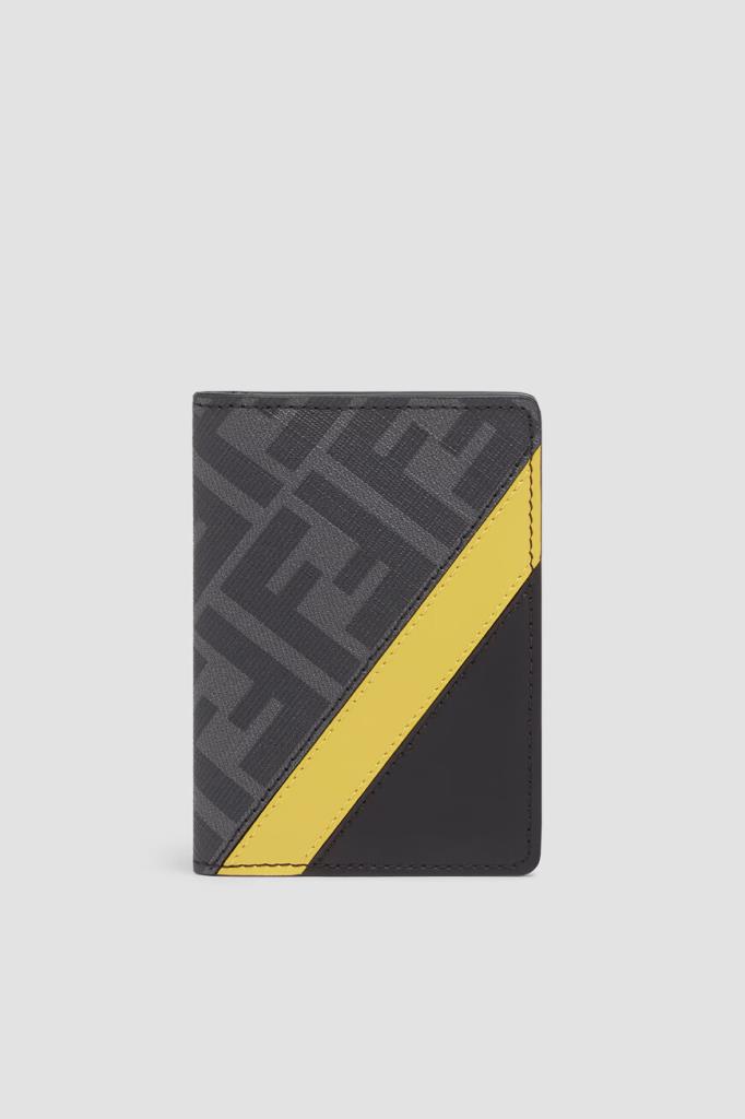 Кредитница Fendi Diagonal с жёлтой деталью-полосой в технике интарсия. Компактная модель прямоугольной формы, выполненная из гладкой телячьей кожа чёрного цвета и гофрированного канваса, украшена крупным геометрическим мотивом «FF» в серых тонах. Отличительными особенностями аксессуара стали конструкция в два сложения, отсутствие застёжки и тиснёный логотип во внутренней части.