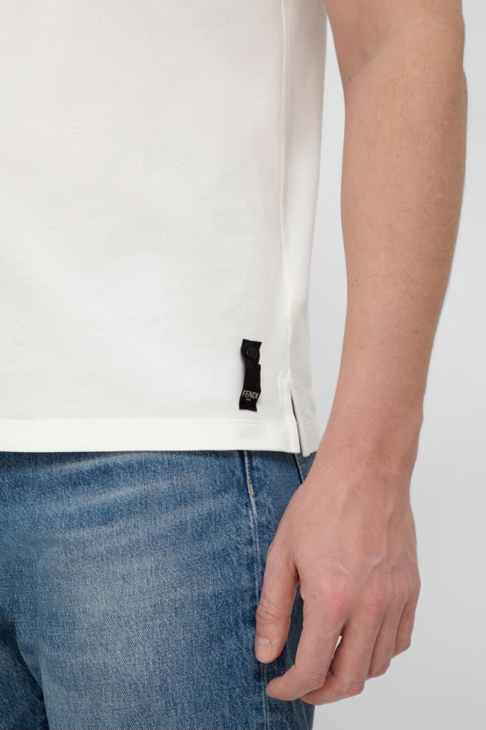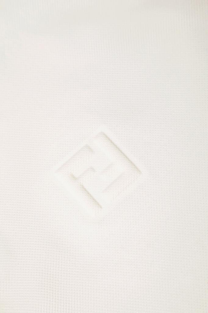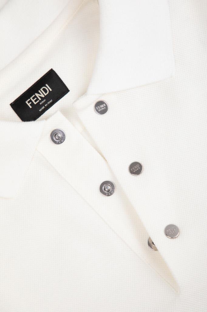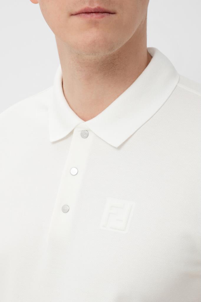 Поло с коротким рукавом от бренда Fendi. Для изготовления модели выбран эластичный хлопковый трикотаж-пике молочного оттенка с характерным фактурным узором. Изделие отличается прямым кроем и застёжкой на три брендированные металлические клёпки сверху. Декором выступает рельефная символика Дома «FF» слева на груди в тон. Для создания органичного комплекта носите поло с бермудами из плотной холщовой ткани того же бренда.