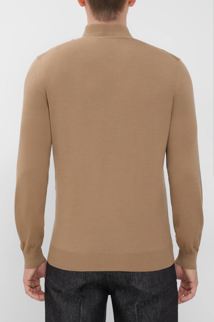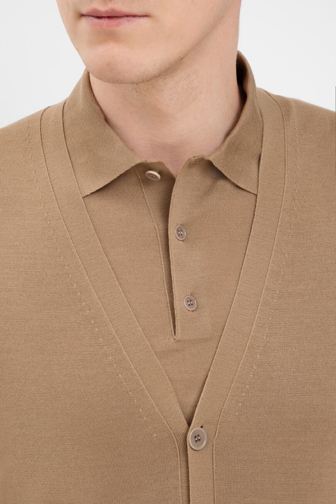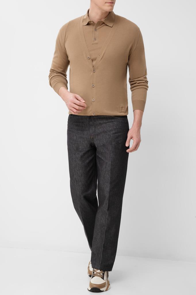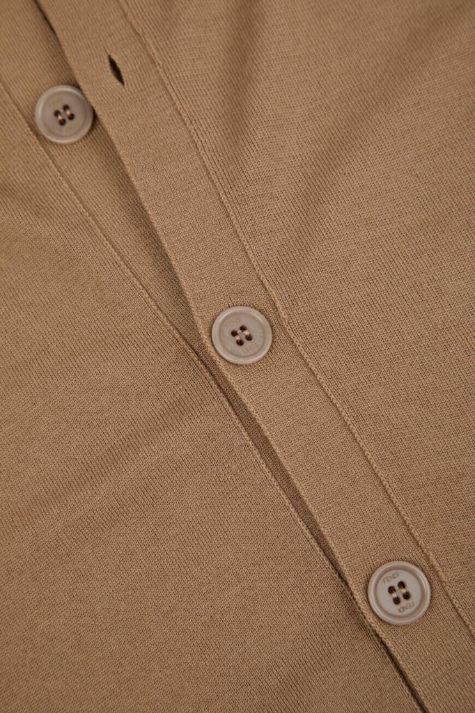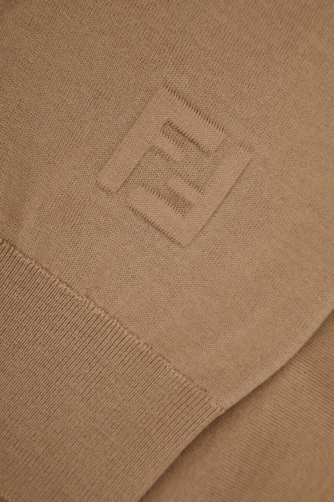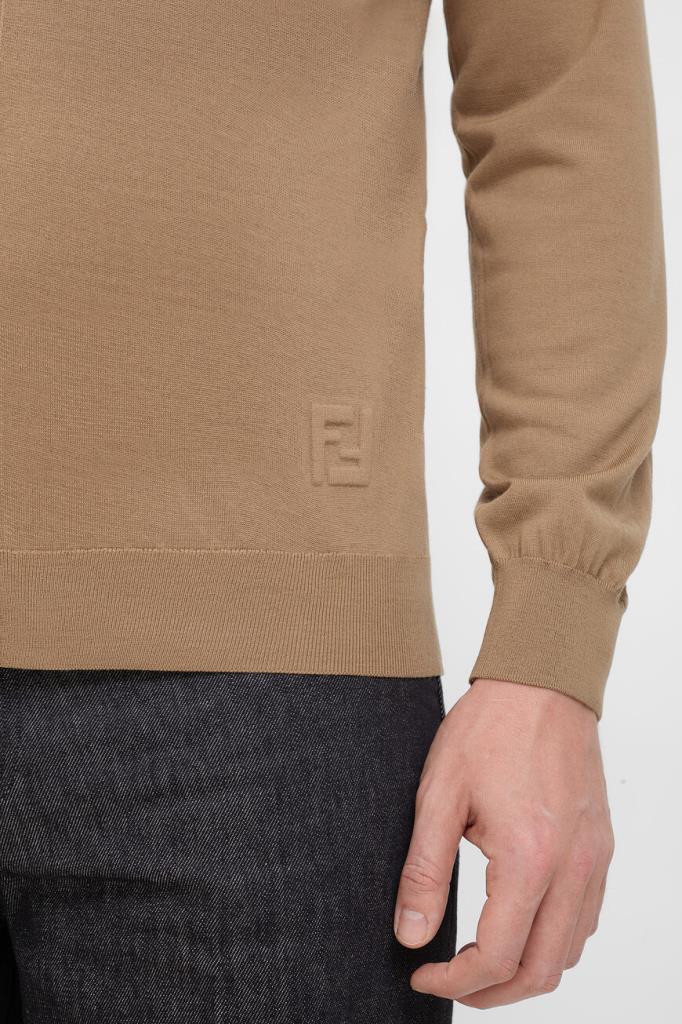 Кардиган с глубоким V-образным вырезом горловины от бренда Fendi. Модель изготовлена из лёгкой шерстяной пряжи светло-коричневого оттенка и декорирована крупной рельефной символикой Дома «FF» спереди снизу в тон. Изделие застёгивается на брендированные роговые пуговицы и сочетается с парным поло с короткими рукавами из той же коллекции.