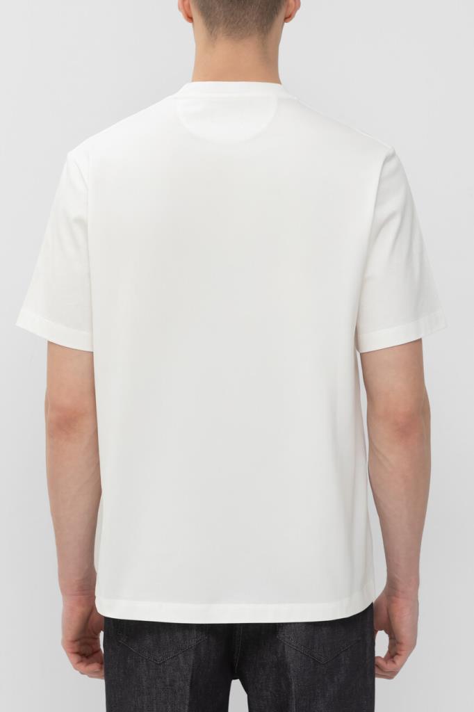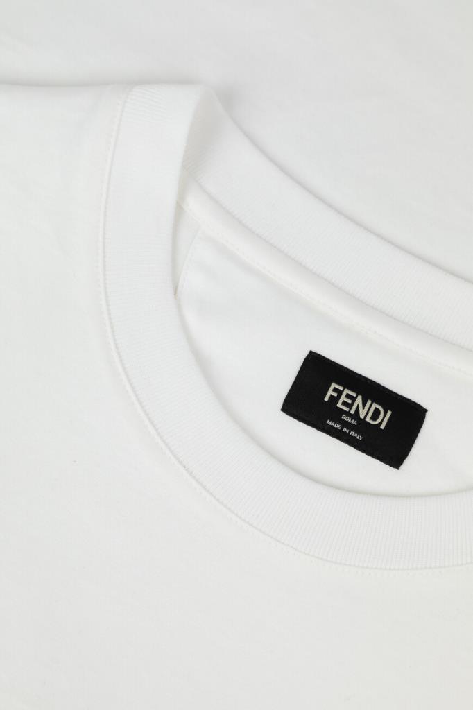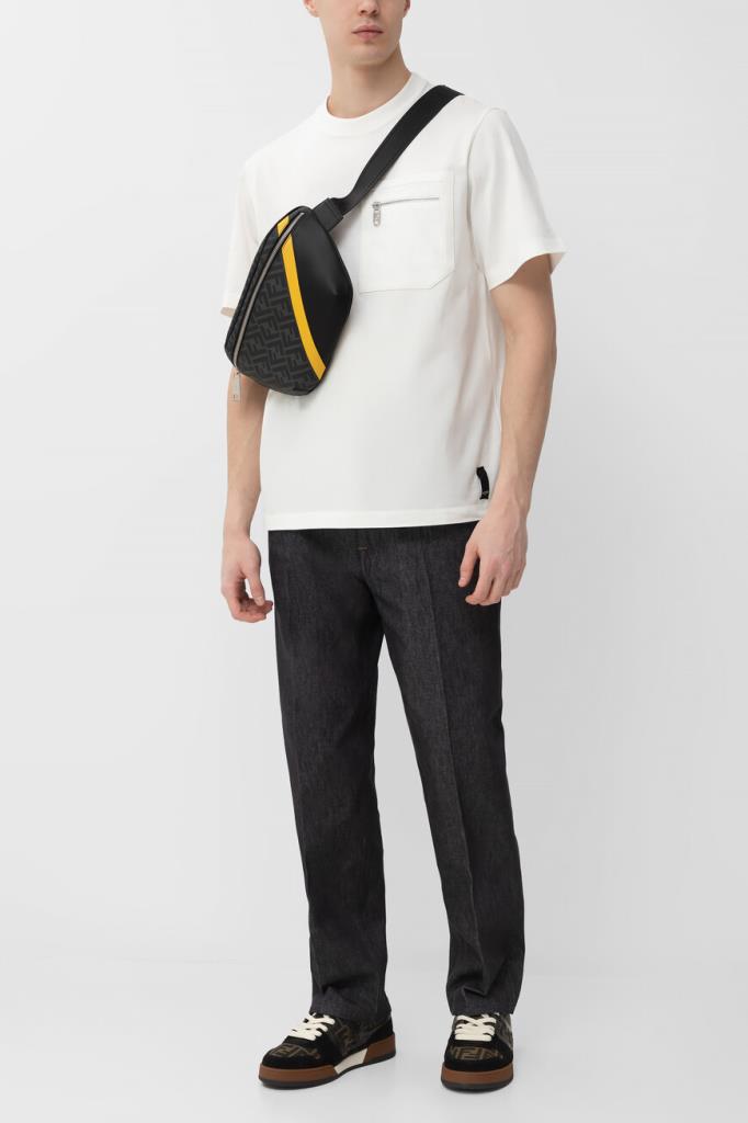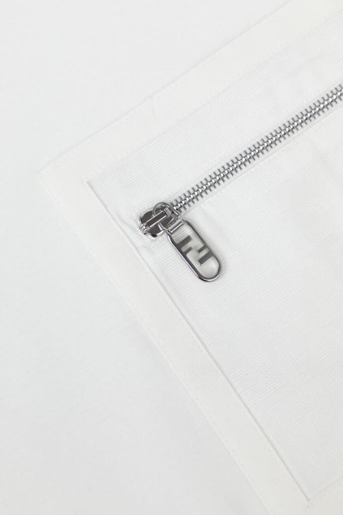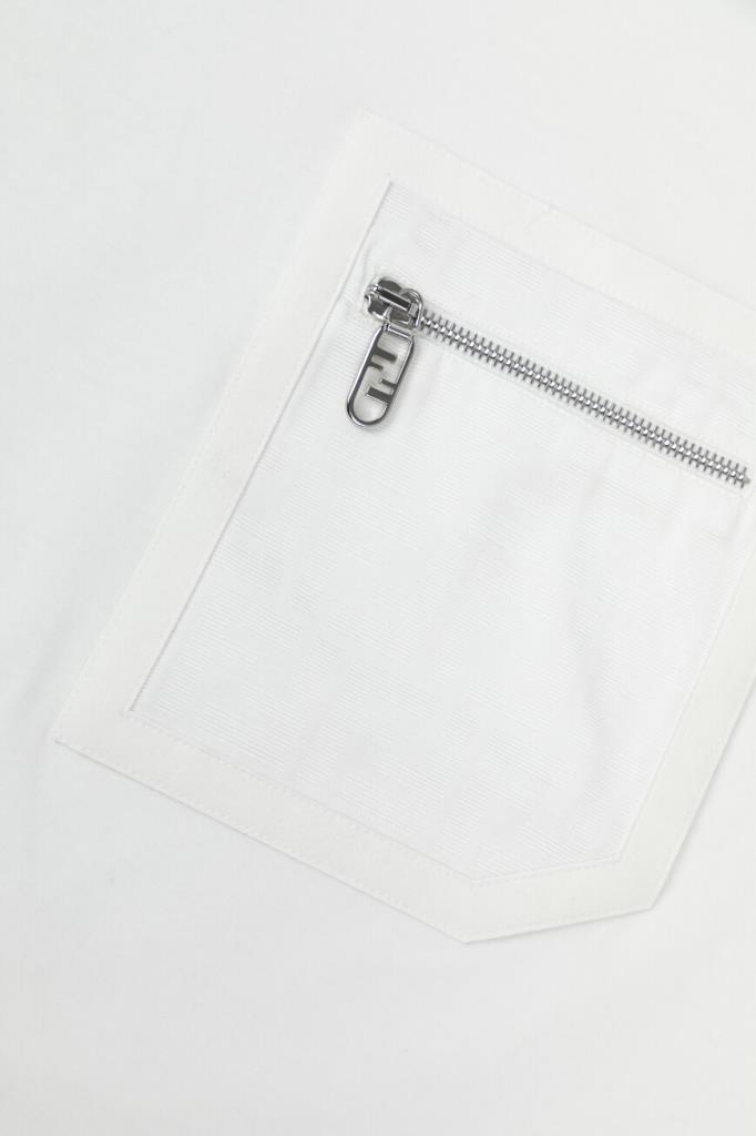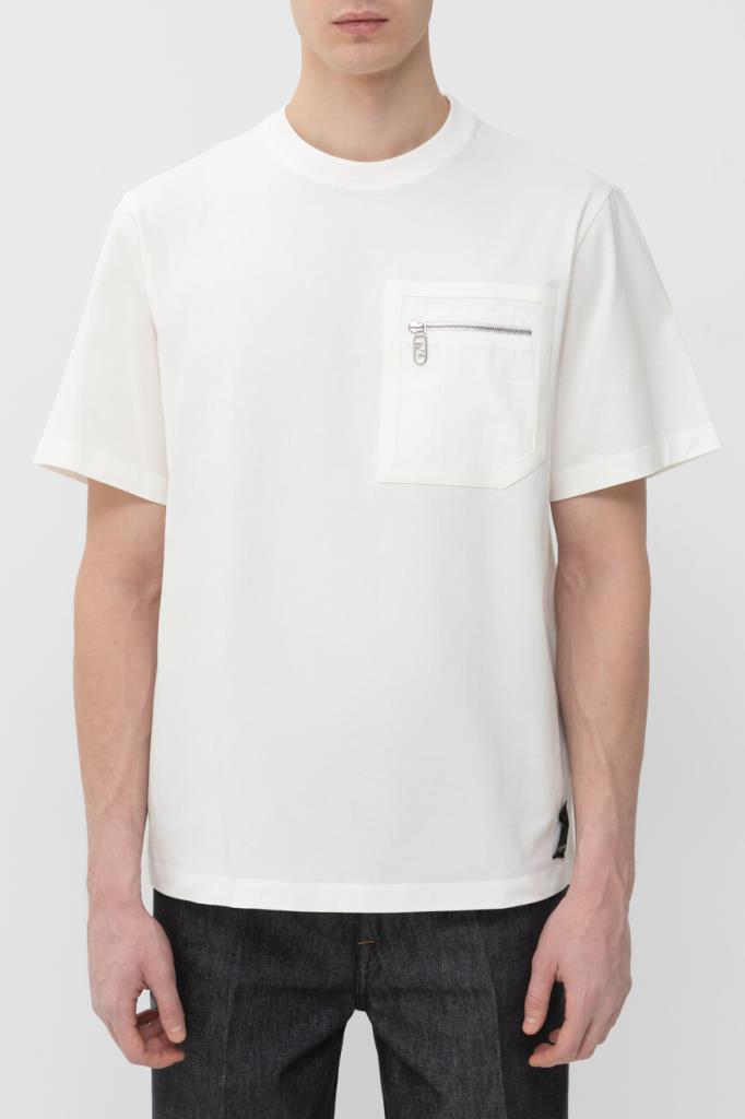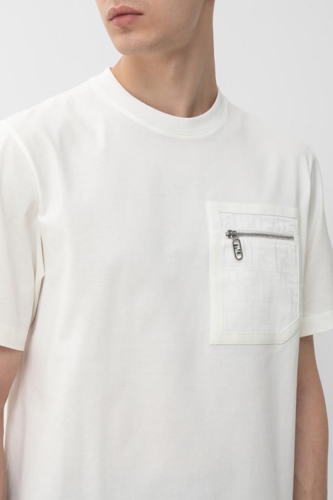 Прямая футболка Fendi белого цвета с неброским декором. Модель изготовлена из лёгкого хлопкового джерси и дополнена нагрудным накладным карманом на молнии слева. Карман украшает геометрический мотив в виде повторяющейся аббревиатуры «FF» в тон. О принадлежности изделия Дому также напоминает декоративная контрастная деталь-петля на пуговице с брендированием.