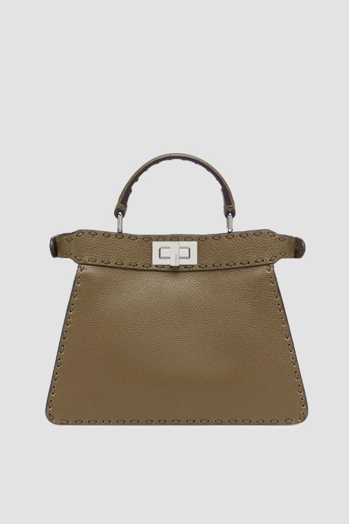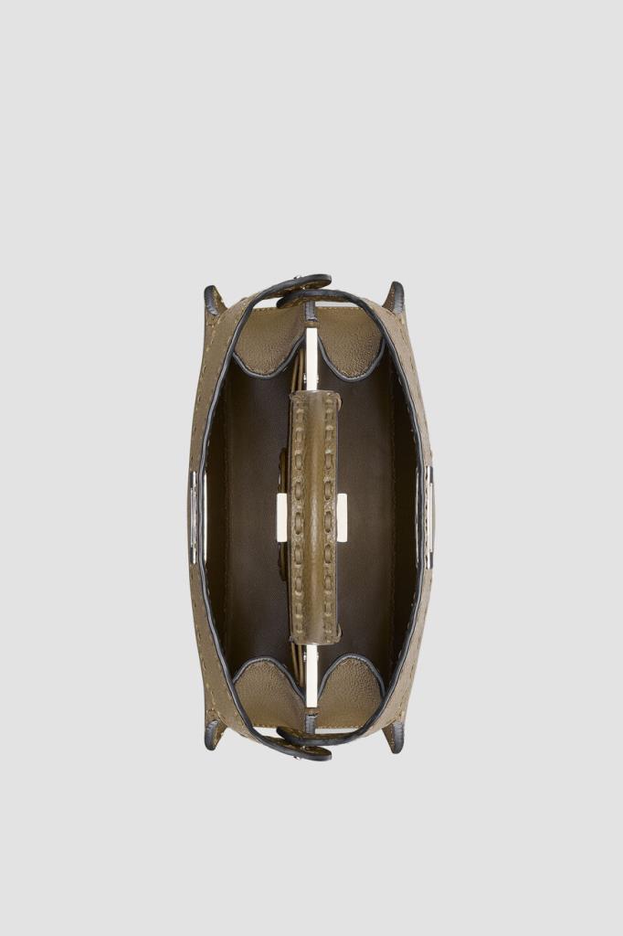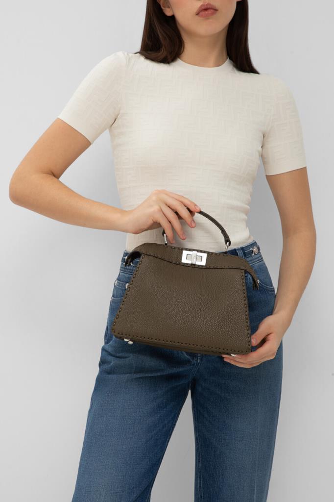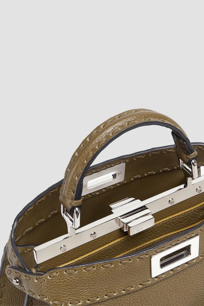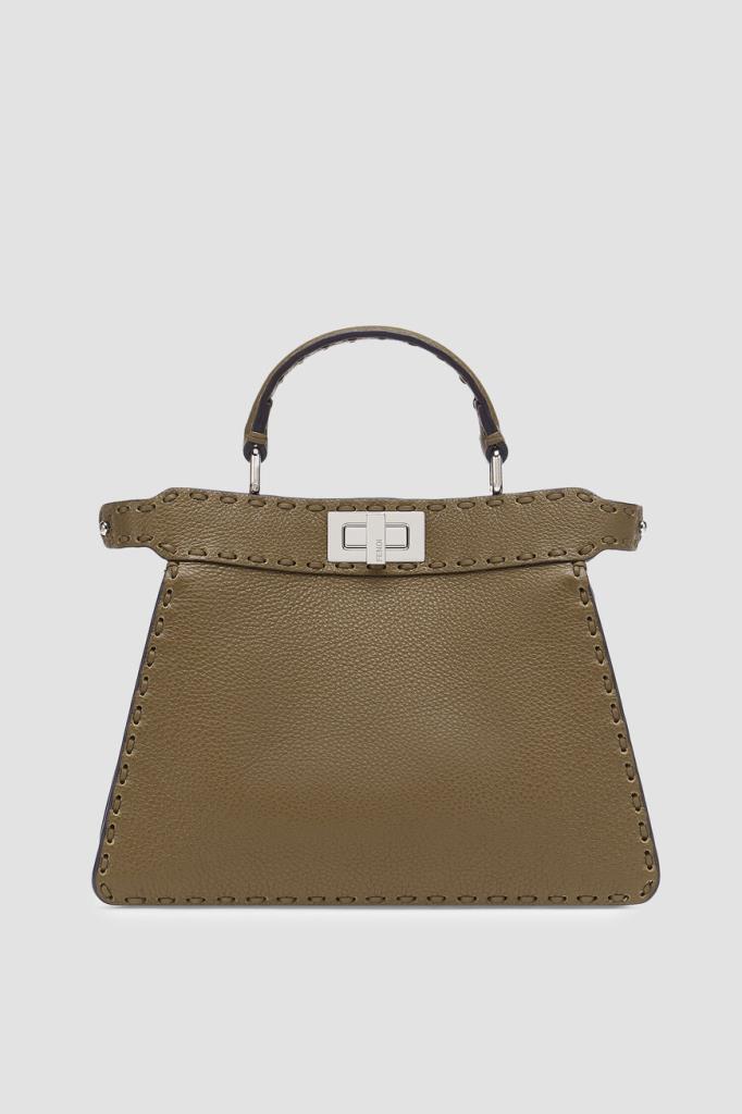 Кожаная сумка Peekaboo ISeeU Selleria маленького формата от бренда Fendi. Конструкция современной модели с характерной зернистой поверхностью, полученной благодаря особому процессу дубления без использования металлов, отличается наличием двух просторных внутренних отделений, разделённых между собой жёсткой перегородкой с металлической деталью и боковым карманом, а также культовым поворотным замком. Принадлежность аксессуара Дому подчёркивается прошивкой вручную 556 макро-стежками в тон - символом легендарной отделки Selleria, созданной мастерами Fendi в 1925 году, и округлым лейблом Selleria с палладиевым покрытием во внутренней части.
