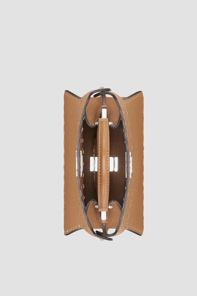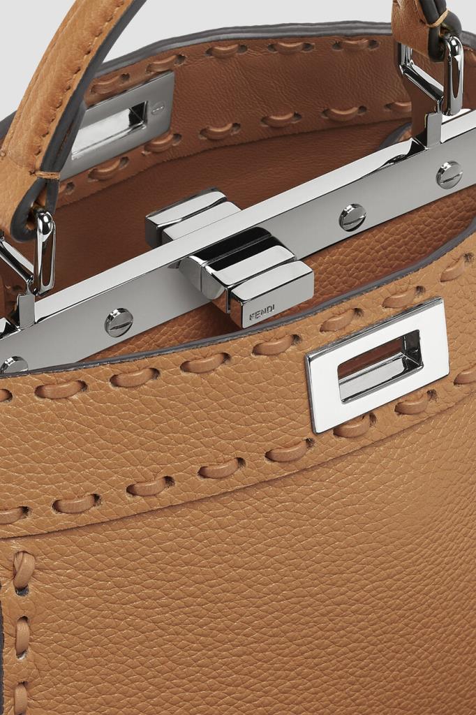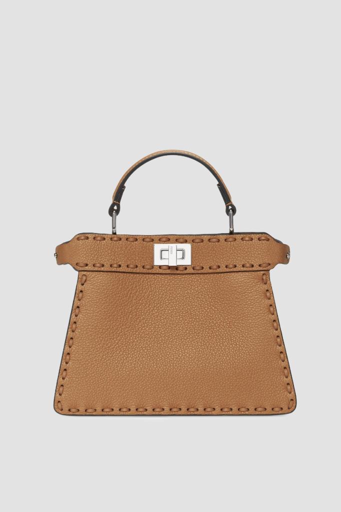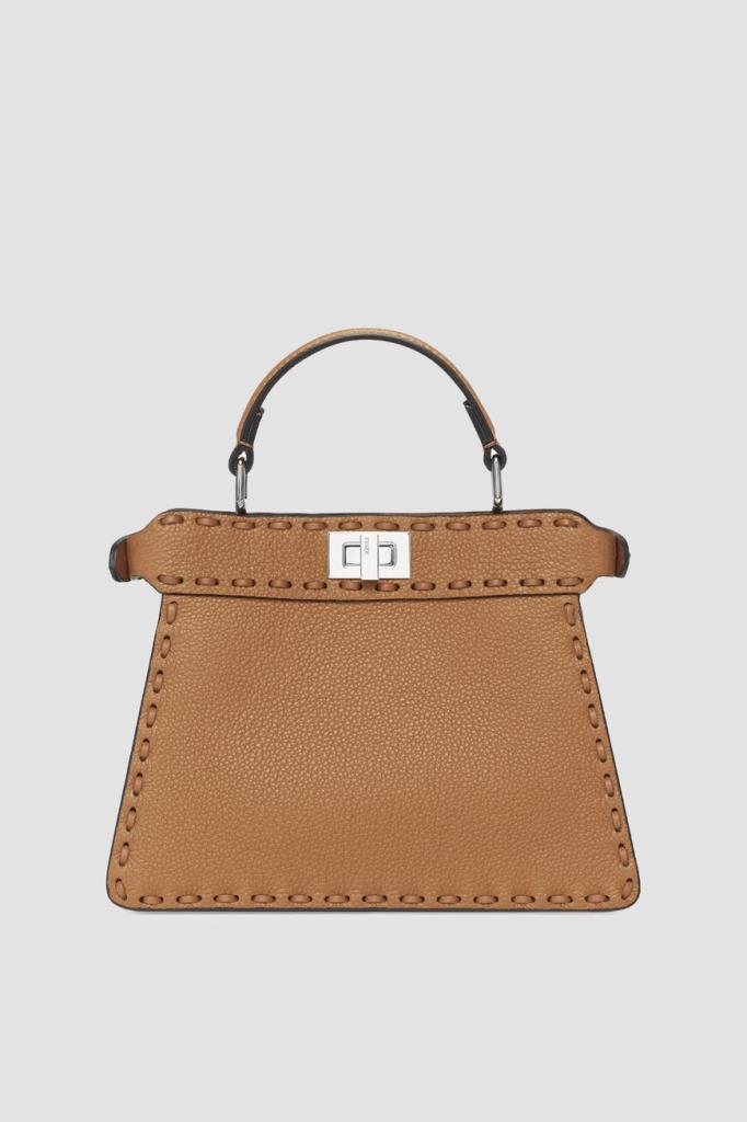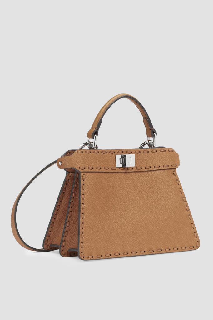Сумка Peekaboo ISeeU Selleria Petite от бренда Fendi в оттенке капучино. Модель из мягкой зернистой кожи телёнка Cuoio Romano интересна прошивкой вручную 306 макро-стежками в тон - символом легендарной отделки Selleria, созданной мастерами Fendi в 1925 году. Для удобства переноски в изделии предусмотрены округлая ручка с металлическими деталями у основания и регулируемый плечевой ремень с серебристыми карабинами.