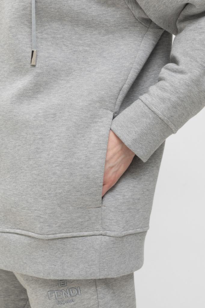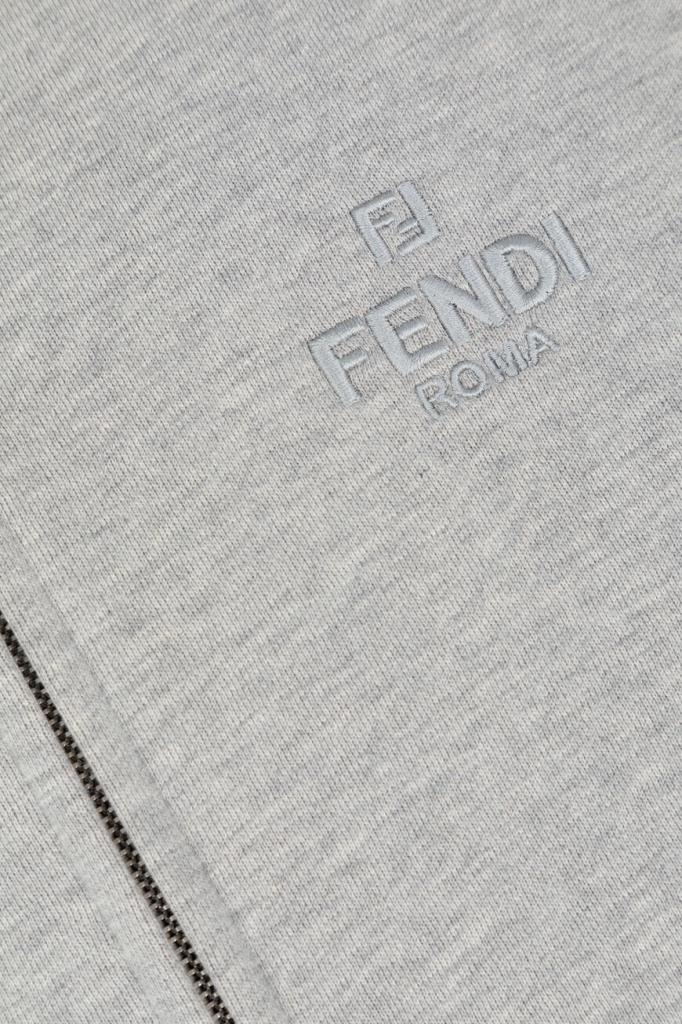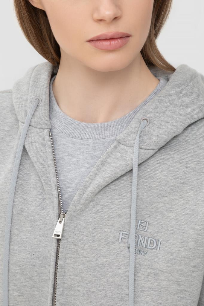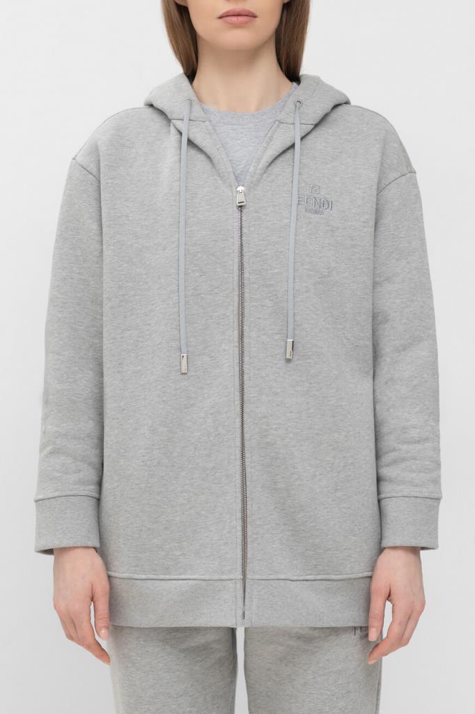 Хлопковая толстовка Fendi на серебристой молнии с брендированным бегунком. Фасон серой меланжевой модели прямого силуэта предполагает глубокий капюшон на завязках и длинные рукава с приспущенной линией плеч. Грудь украшает тональная вышивка-декор в виде надписи-логотипа «Fendi Roma» и знаковой символики «FF». Отличительной особенностью изделия стала коричневая подкладка из того же материала, что и толстовка. Модель составит идеальный тандем с джоггерами из той же коллекции.