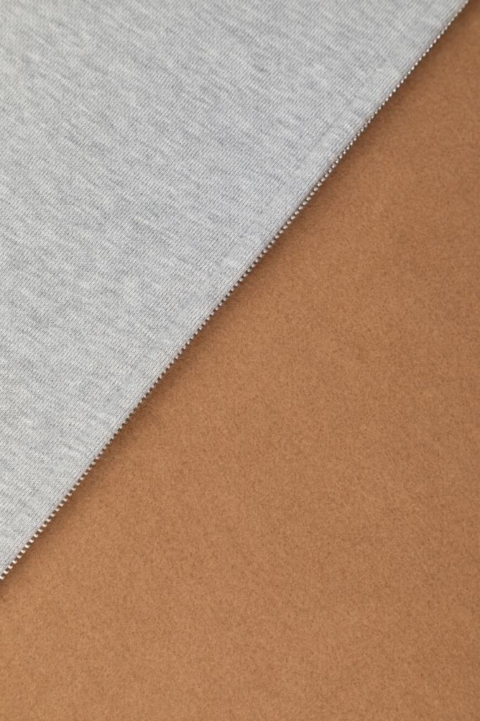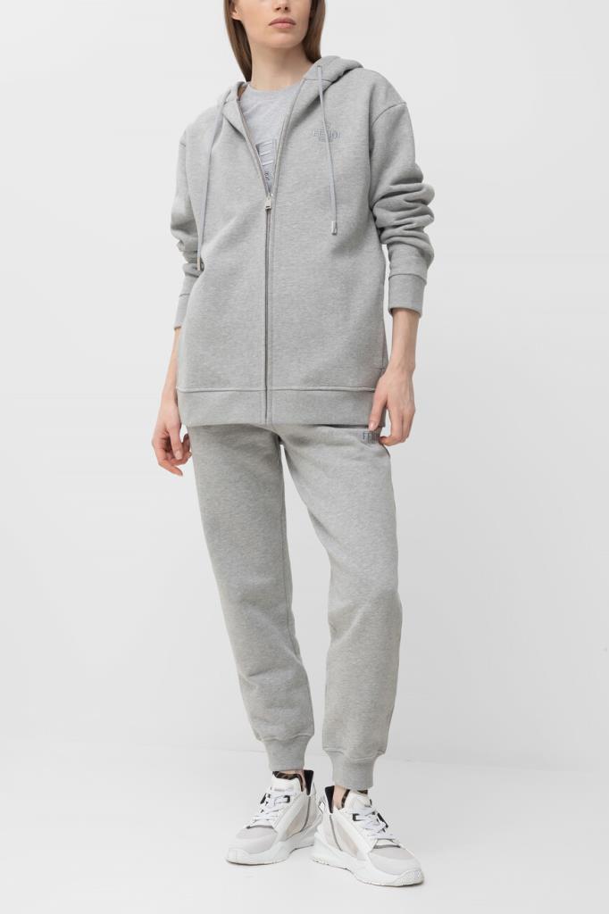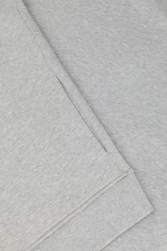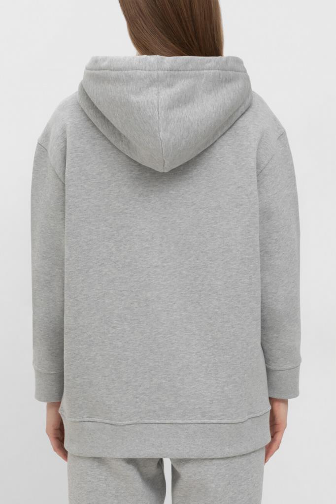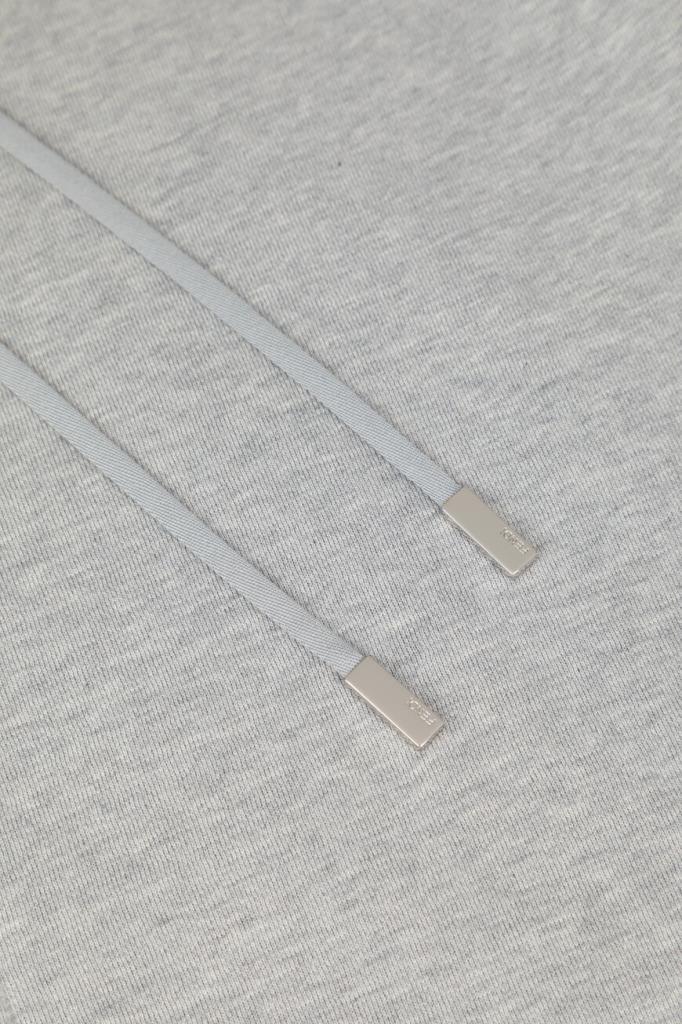 Хлопковая толстовка Fendi на серебристой молнии с брендированным бегунком. Фасон серой меланжевой модели прямого силуэта предполагает глубокий капюшон на завязках и длинные рукава с приспущенной линией плеч. Грудь украшает тональная вышивка-декор в виде надписи-логотипа «Fendi Roma» и знаковой символики «FF». Отличительной особенностью изделия стала коричневая подкладка из того же материала, что и толстовка. Модель составит идеальный тандем с джоггерами из той же коллекции.