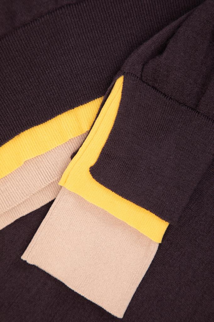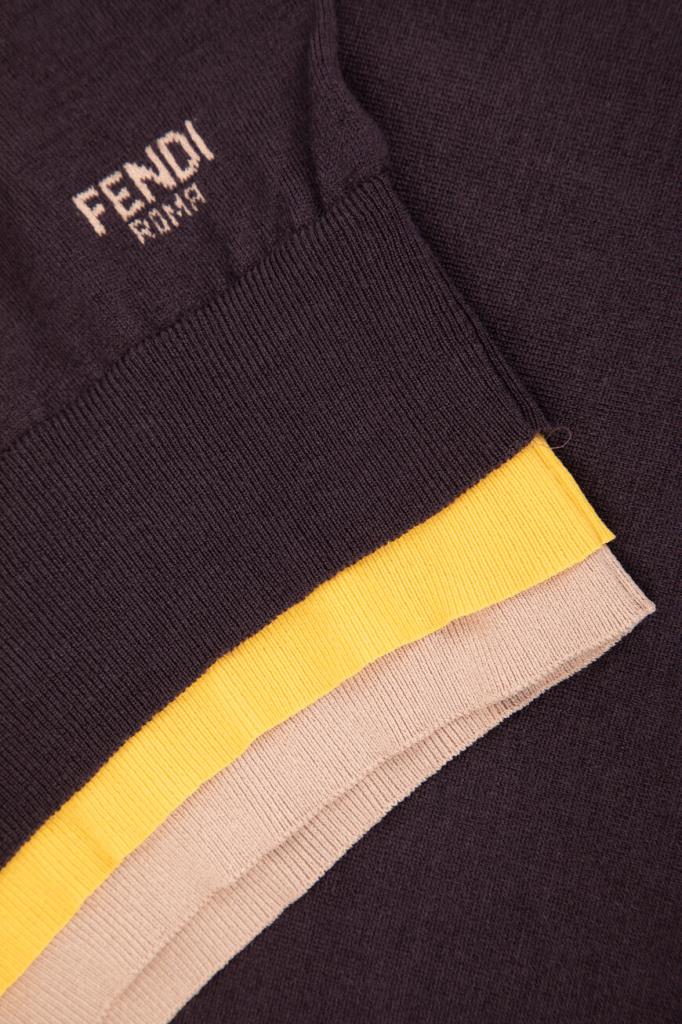 Тёмно-фиолетовое платье Fendi с деталями-декором в жёлтых и бежевых тонах. Для изготовления короткой модели облегающего силуэта используется мягкая флисовая шерсть. Особенностями изделия являются многослойные вставки в наборную резинку на высоком воротнике-стойке, манжетах рукавов и широком поясе, создающие эффект оптической иллюзии. На принадлежность платья Дому указывает минималистичная надпись «Fendi Roma», выполненная в технике интарсия.
