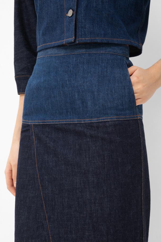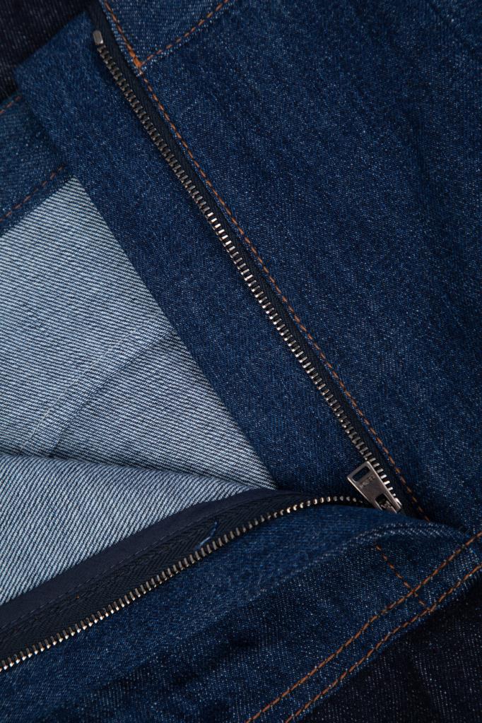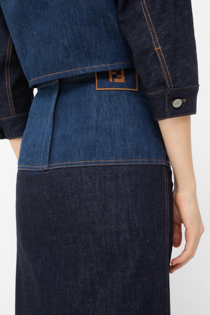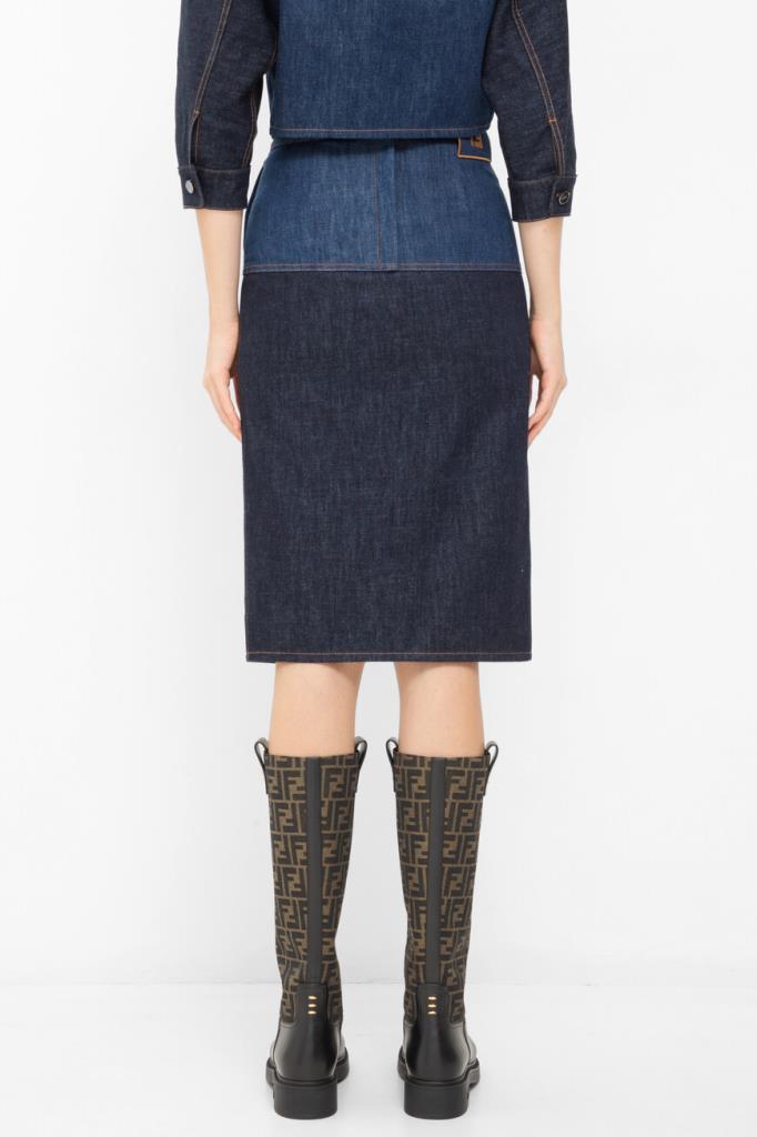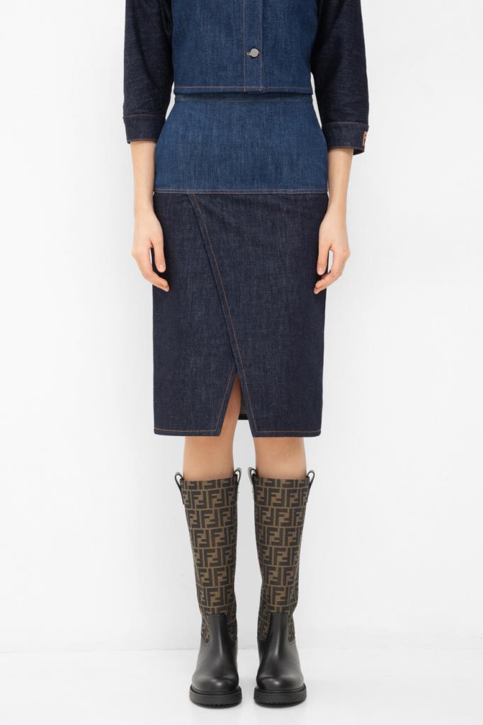 Юбка-миди от бренда Fendi с высокой линией талии. Для пошива модели на потайной молнии с планкой сзади выбран мягкий хлопковый деним. Изделие окрашено в тёмно-синий оттенок и дополнено баской синего цвета, создающей эффект колор-блок. Атрибутом Дома является прямоугольная накладка со знаковой символикой «FF» и прошитой оранжевой окантовкой. Дополните образ total denim укороченной курткой с невысоким воротником-стойкой из той же коллекции.