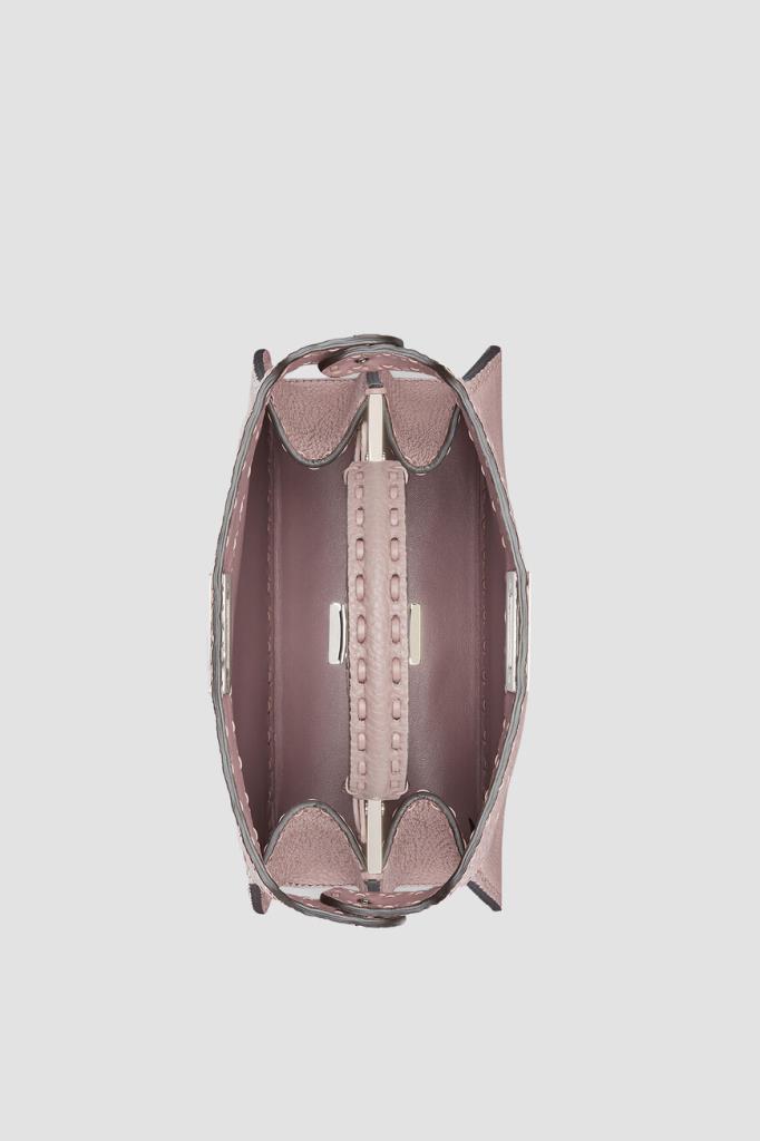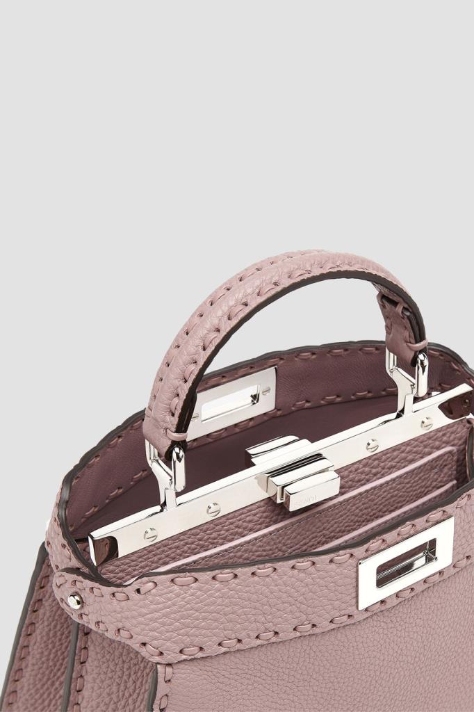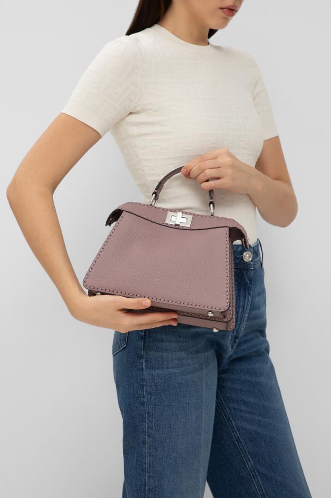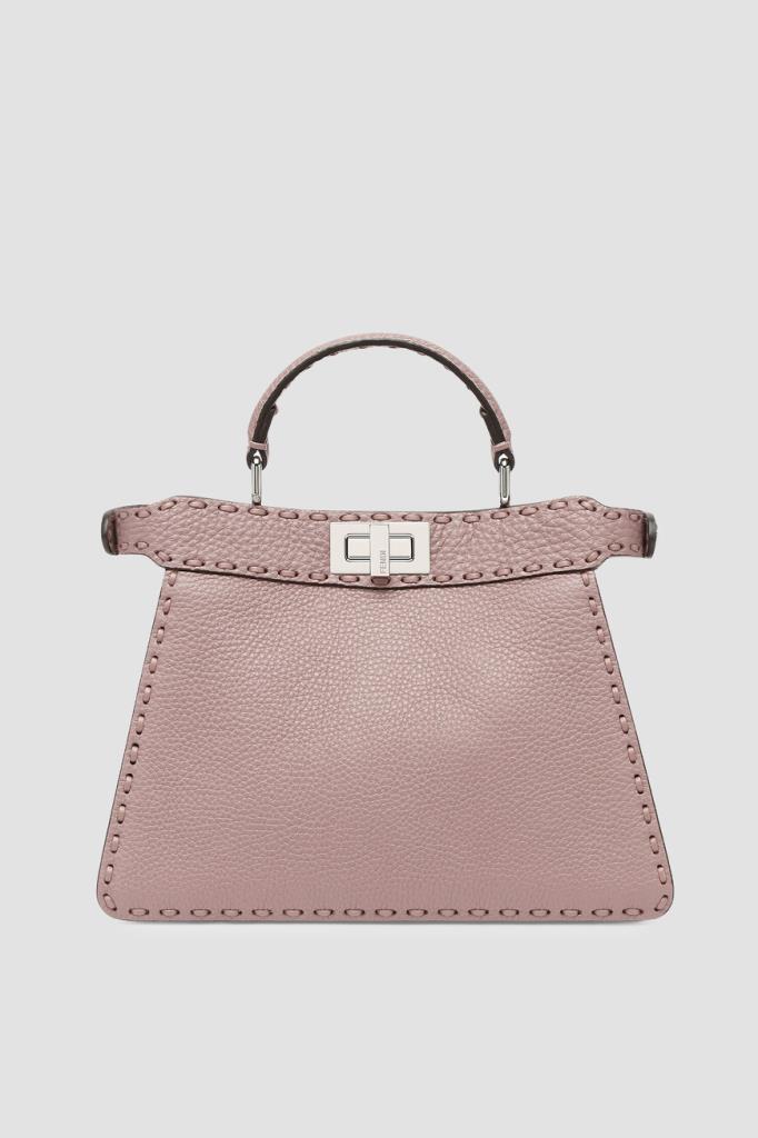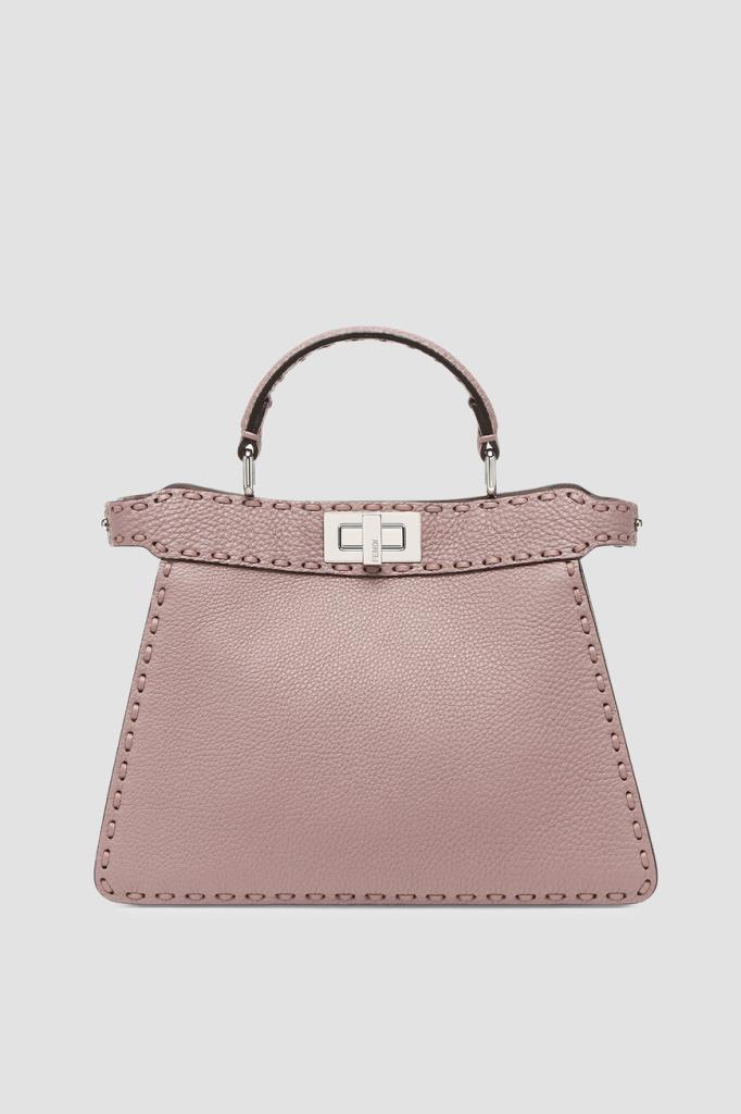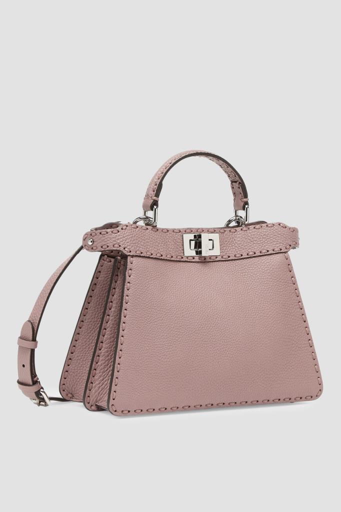 Пудрово-розовая сумка Peekaboo ISeeU Selleria от бренда Fendi. Аксессуар изготовлен из мягкой телячьей кожи Cuoio Romano с характерной зернистой поверхностью, полученной благодаря особому процессу дубления без использования металлов. Изделие маленького формата отличается прошивкой вручную 556 макро-стежками в тон - символом легендарной отделки Selleria, созданной мастерами Fendi в 1925 году, и культовым поворотным замком.