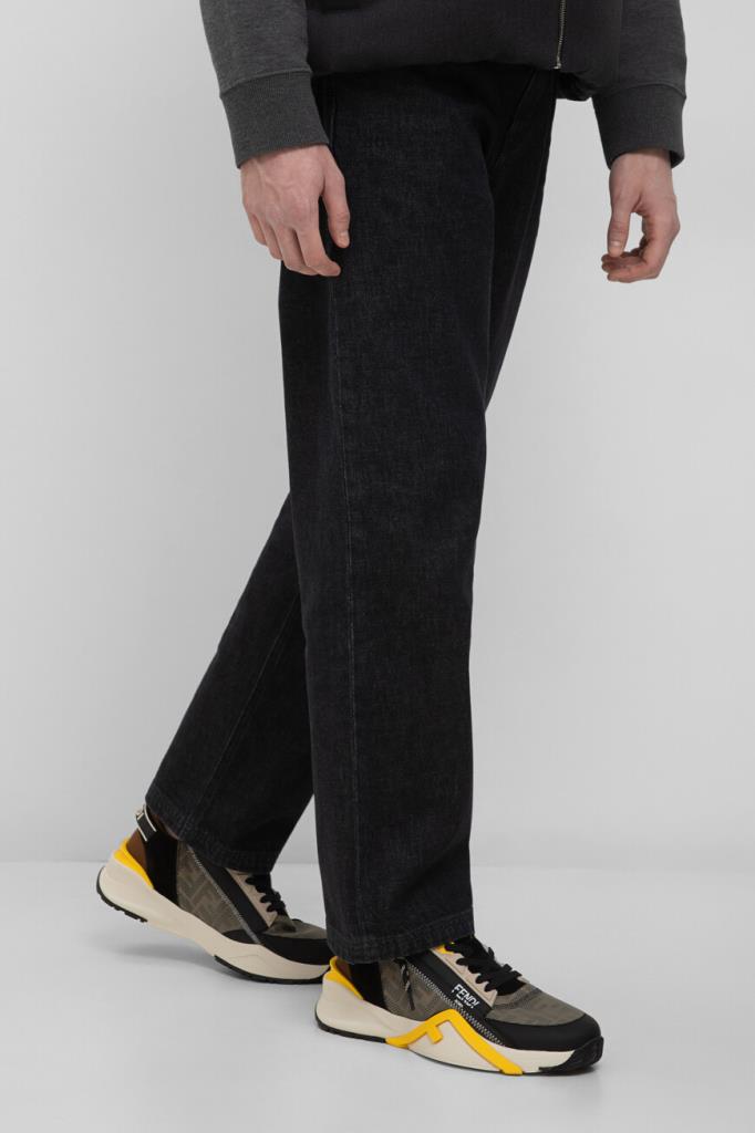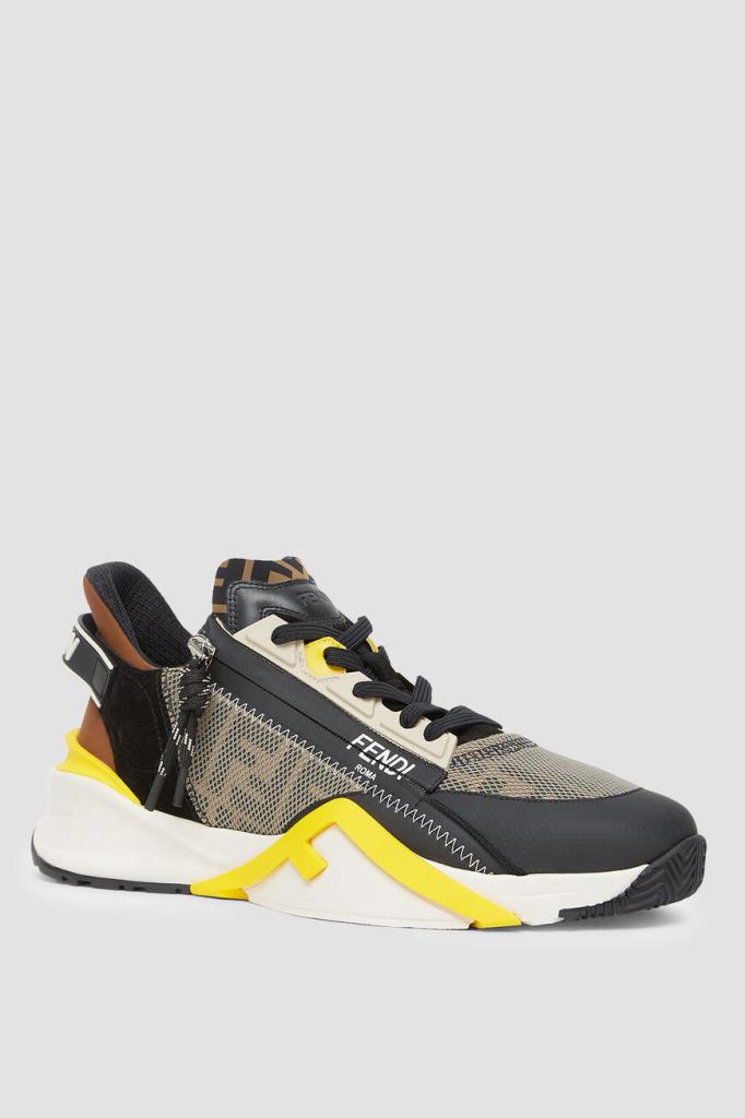 Комбинированные кроссовки Fendi Flow с закрытой шнуровкой и молнией сбоку. Модель изготовлена из гладкой телячьей кожи чёрного и коричневого оттенков, прочной эластичной ткани LYCRA® на основе прочного полиэфира и нейлона со вставками в сетку и бархатистой чёрной замши. Атрибутами Дома являются вставки с геометрическим мотивом «FF» на язычке, носке и боковинах, белый логотип Fendi Roma сбоку на шнуровке, а также ремешки с окантовкой, лого и названием модели в задней части.