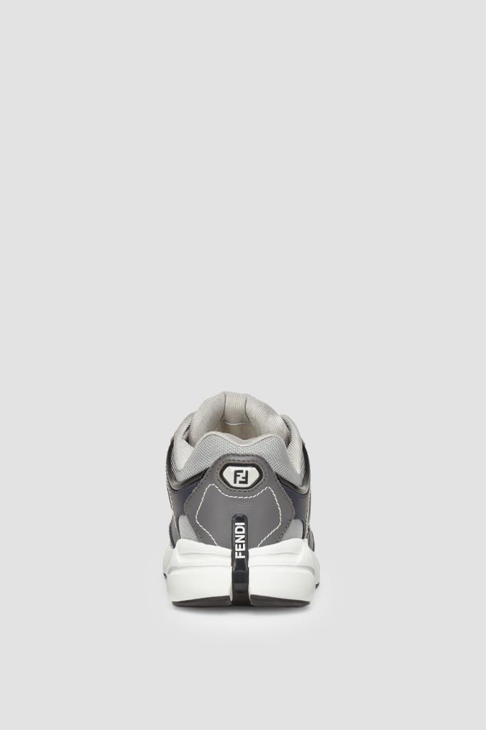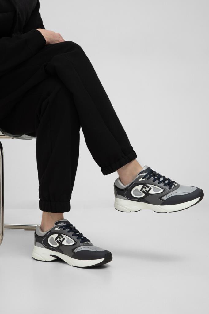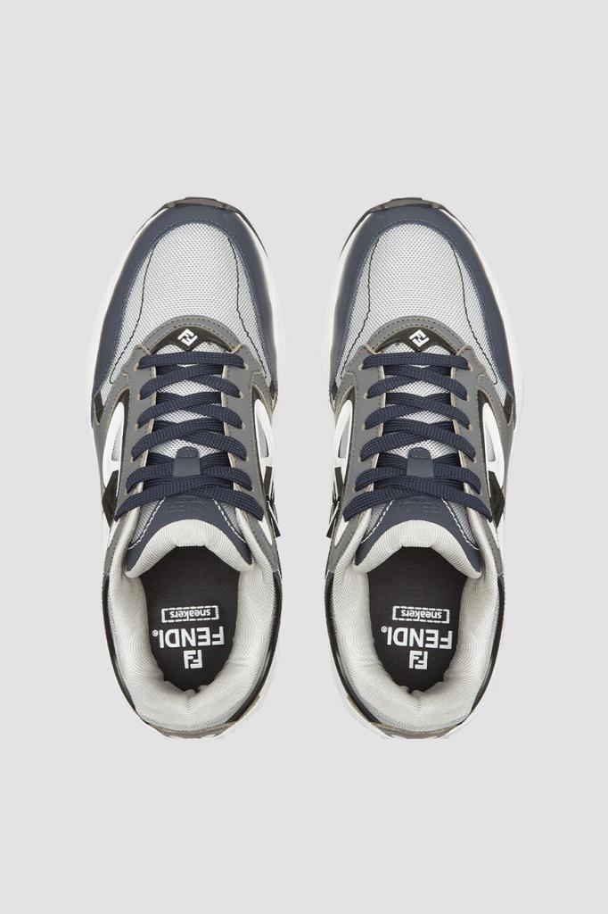 Сникеры Fendi Forward на формованной подошве с рифлением снизу. Комбинированная модель изготовлена из двух видов материалов в серо-синей гамме: плотного сетчатого текстиля на основе прочного полиэфира и полиуретана и гладкой телячьей кожи. Конструкция удобной пары предполагает наличие укреплённого округлого носка и закрытого типа шнуровки. Атрибутами Дома являются знаковые аббревиатуры FF спереди, на уровне планки шнуровки, боковинах (прорезиненные с трёхмерным эффектом) и заднике, а также белая символика на чёрных стельках.