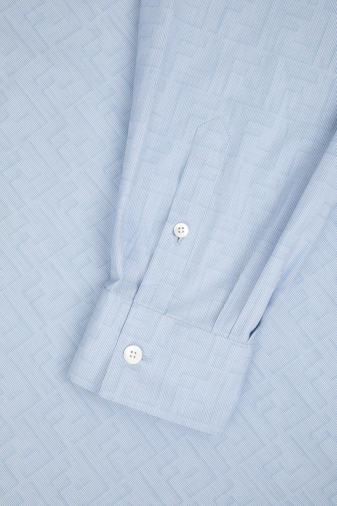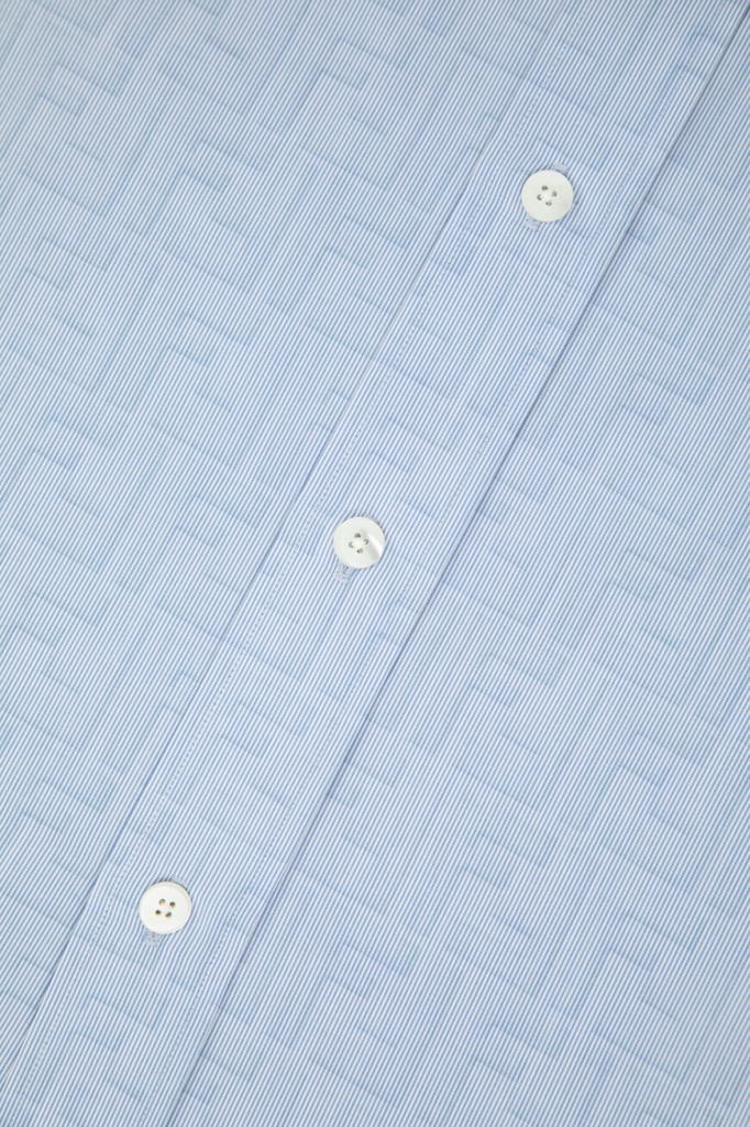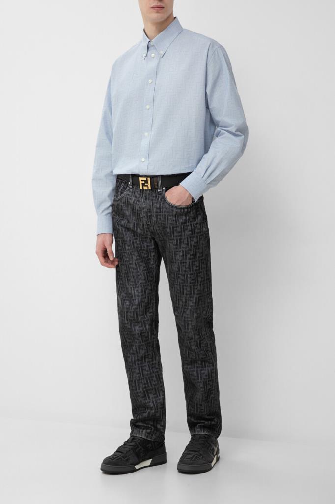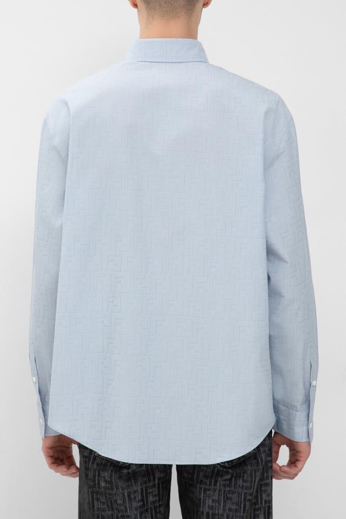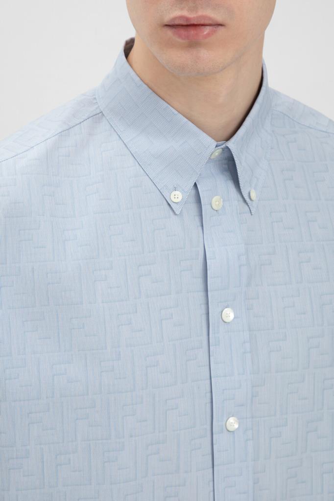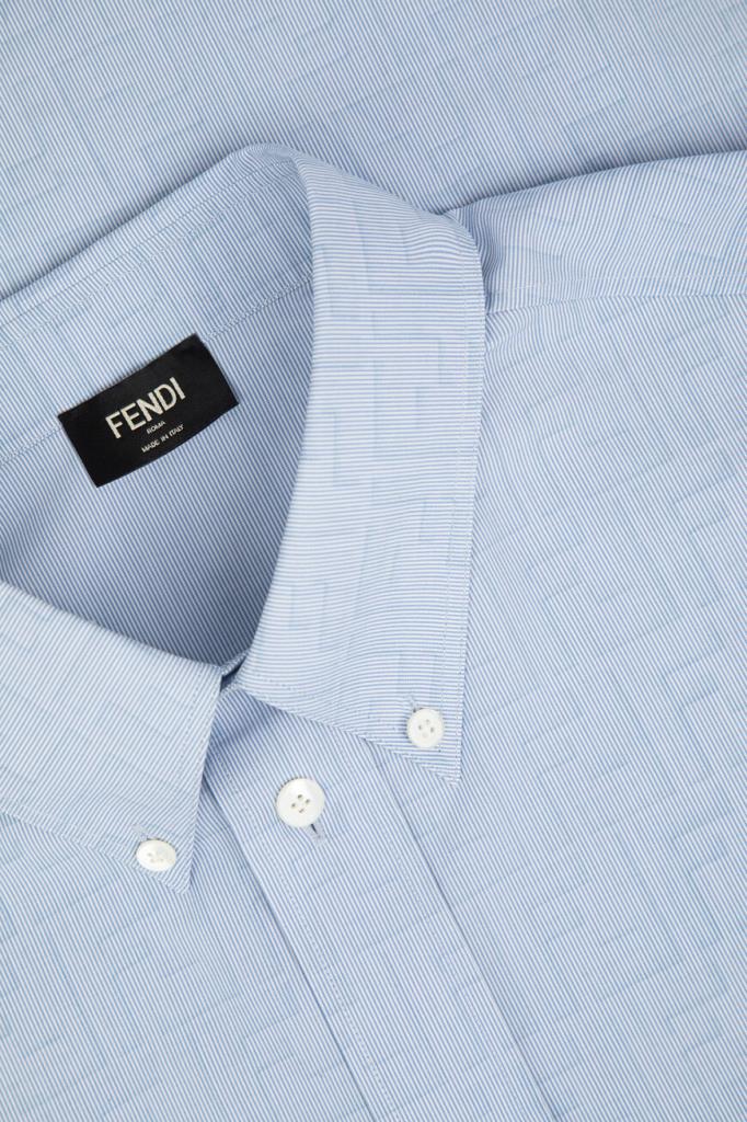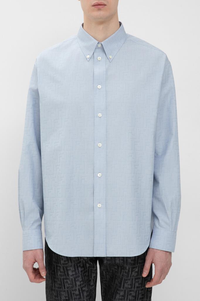 Прямая рубашка Fendi в белом и голубом тонах. Модель изготовлена из мягкого хлопкового трикотажа с геометрическим мотивом в полоску и принтом «FF» на белом фоне. Длинные рукава со спущенной линией плечевого шва можно носить закатанными и закреплёнными с помощью ремешка и пуговицы. Рубашка не сковывает движения благодаря закруглённому низу с разрезами по бокам.