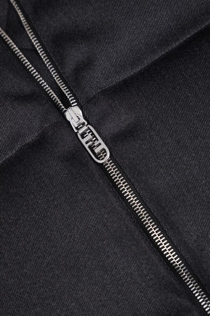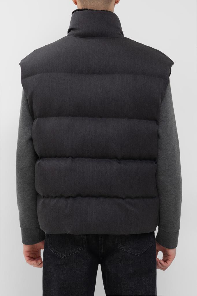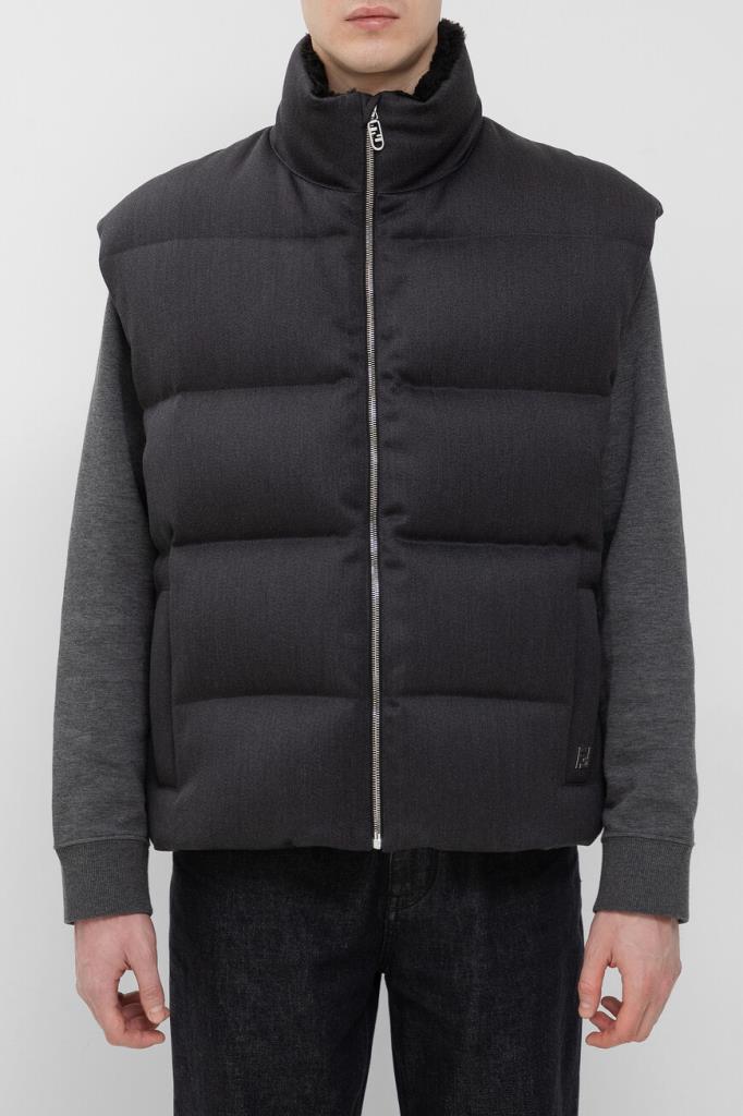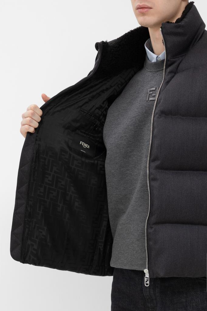 Уплотнённый жилет Fendi надёжно защищает от холода и ветра. Изделие выполнено из мягкой шерстяной саржи тёмно-серого цвета с горизонтальной стёжкой. Отличительными деталями являются внутренняя часть высокого воротника-стойки, изготовленная из чёрного меха овчины, аппликация в виде знаковой символики «FF» на левом боковом кармане и подкладка из прочного вискозного волокна с жаккардовым геометрическим мотивом в чёрных тонах. Нижний край модели подобран на кулиску, а жилет утеплён наполнителем из натурального гусиного пуха и пера.