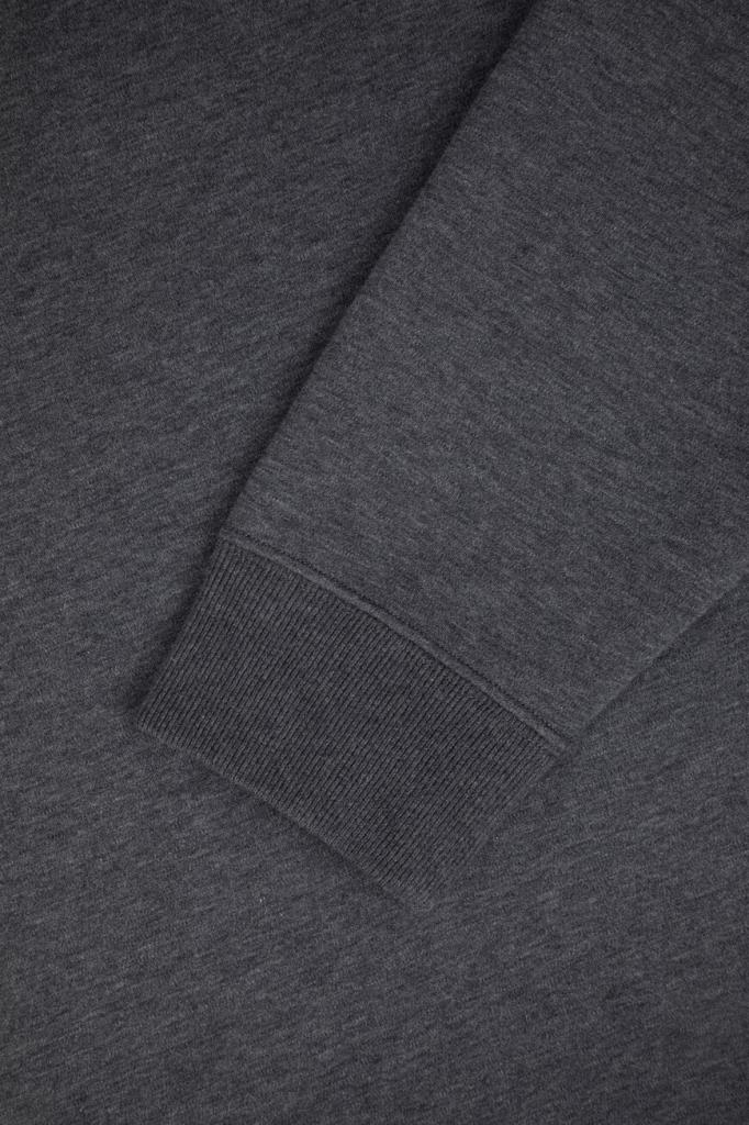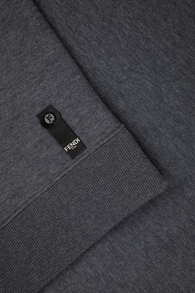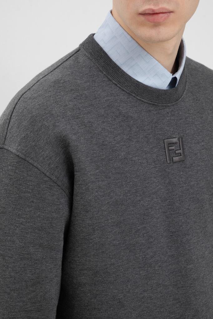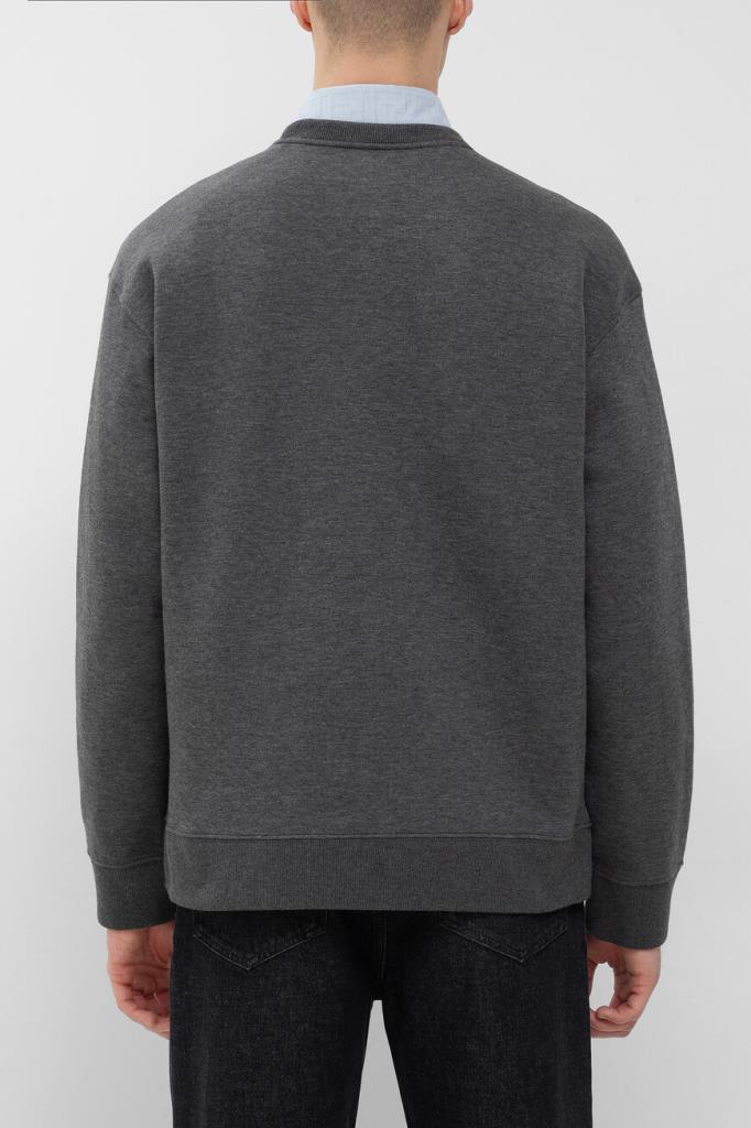 Тёмно-серый свитшот оверсайз от бренда Fendi. Модель изготовлена из мягкого трикотажа на основе хлопка и нейлона и украшена вышитой аббревиатурой «FF» на груди по центру в тон. Отличительной особенностью изделия стала внутренняя часть светло-серого оттенка, также декорированная геометрическим мотивом «FF». Круглый вырез горловины, манжеты рукавов и пояс оформлены широкой резинкой. Образ можно завершить рубашкой в белом и голубом тонах и джинсами с эффектом делаве из той же коллекции Дома.